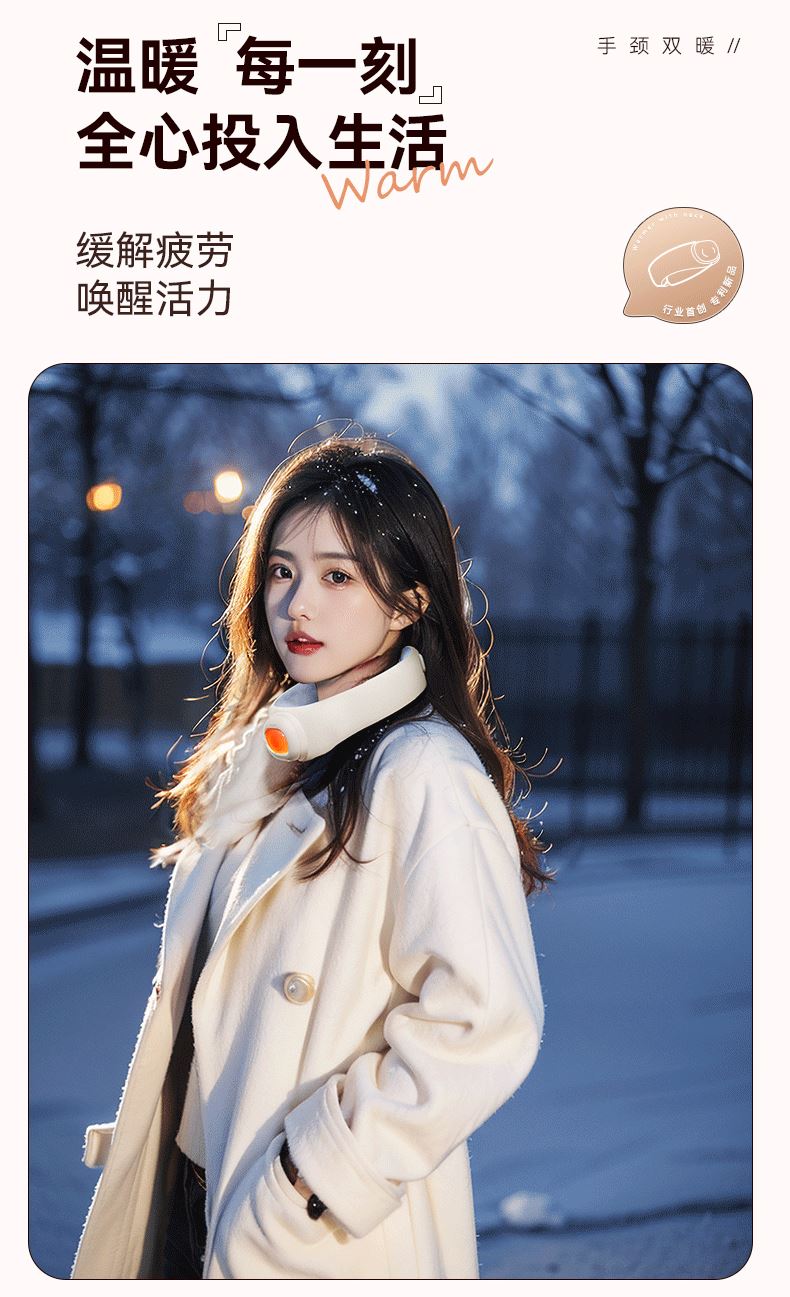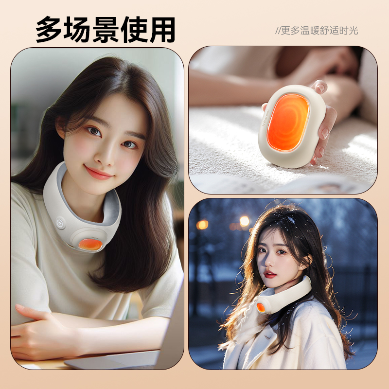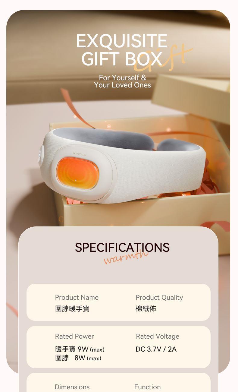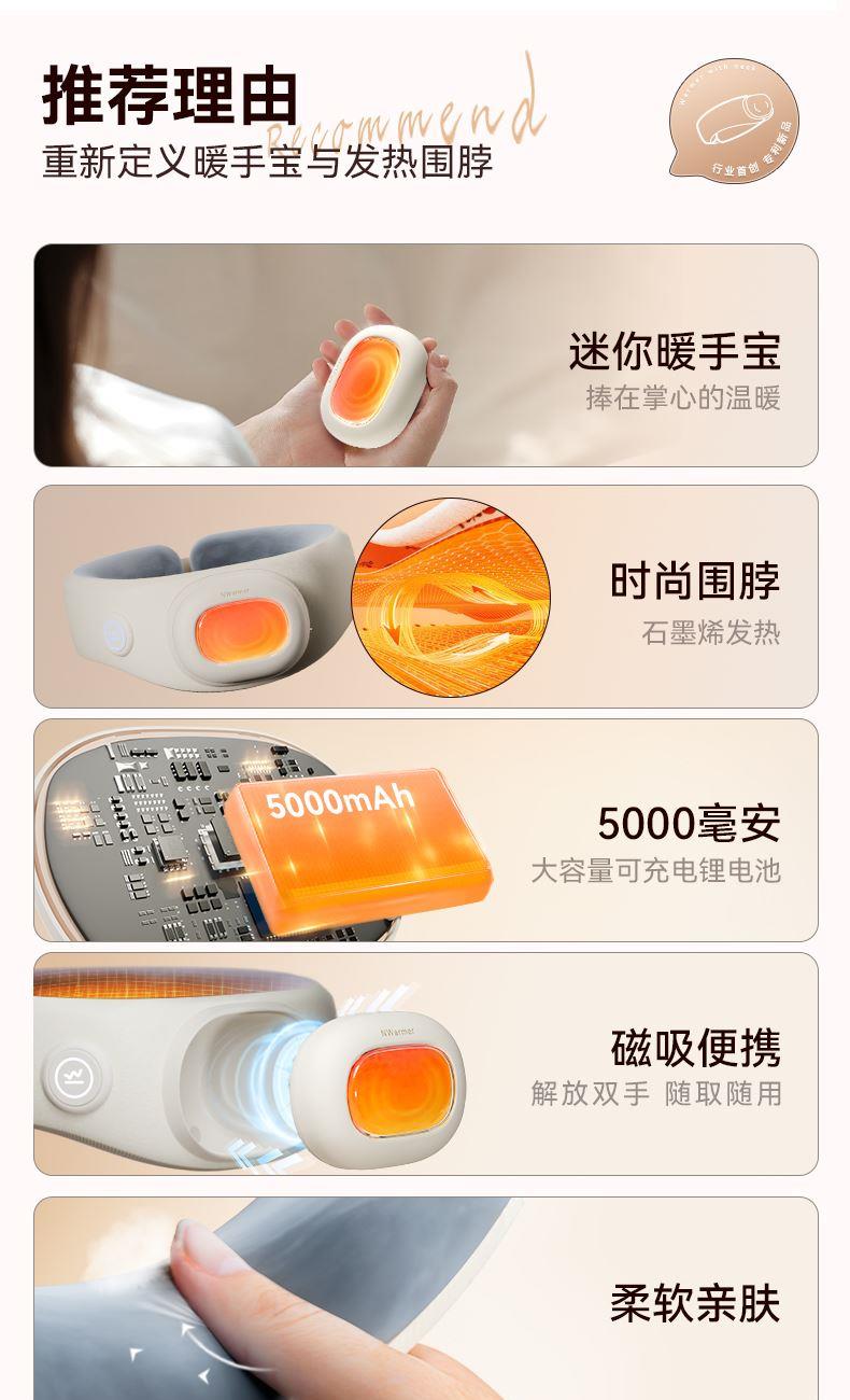 【颜色】米白色 【产品规格】232*274*89mm 【包装尺寸】223*232*101mm 【净重毛重】330g/500g 【电池容量】5000mAh 【暖手温度】40℃,45℃,50℃ 【暖手时间】5-8小时 【输入】5V-2A 【产品材质】棉绒布 发热围脖+暖手宝二合一创新设计,一机多用,温暖为你 智能温控,3档调节,供电器也可单独作为暖手宝使用 AI防爆芯片,磁吸结合,暖手宝拿取便携,氛围灯设计 强力磁吸纽扣,自动扣合,长短调节