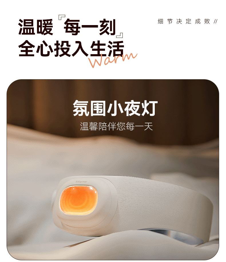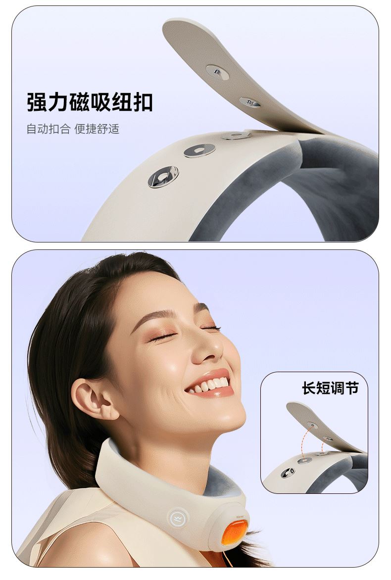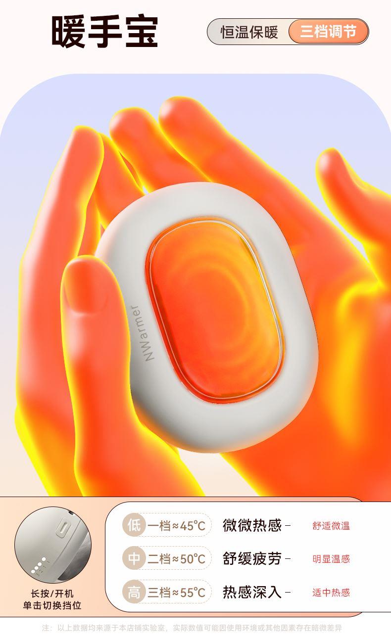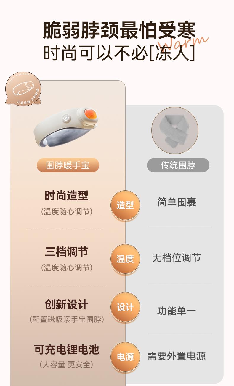 【颜色】米白色 【产品规格】232*274*89mm 【包装尺寸】223*232*101mm 【净重毛重】330g/500g 【电池容量】5000mAh 【暖手温度】40℃,45℃,50℃ 【暖手时间】5-8小时 【输入】5V-2A 【产品材质】棉绒布 发热围脖+暖手宝二合一创新设计,一机多用,温暖为你 智能温控,3档调节,供电器也可单独作为暖手宝使用 AI防爆芯片,磁吸结合,暖手宝拿取便携,氛围灯设计 强力磁吸纽扣,自动扣合,长短调节