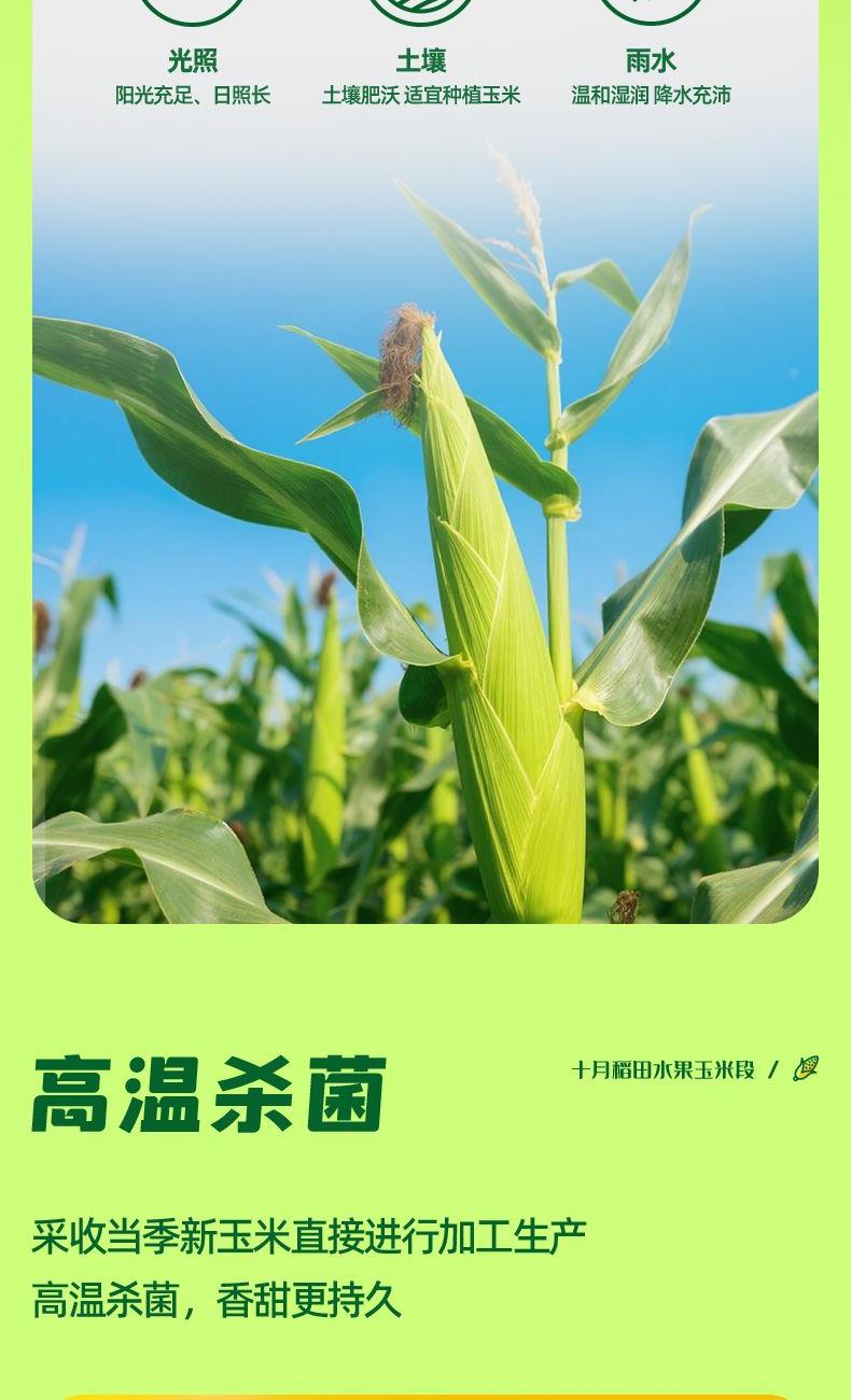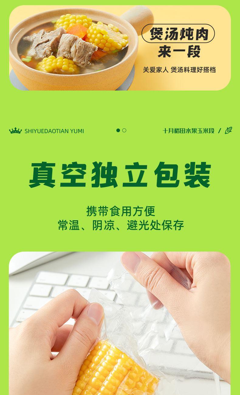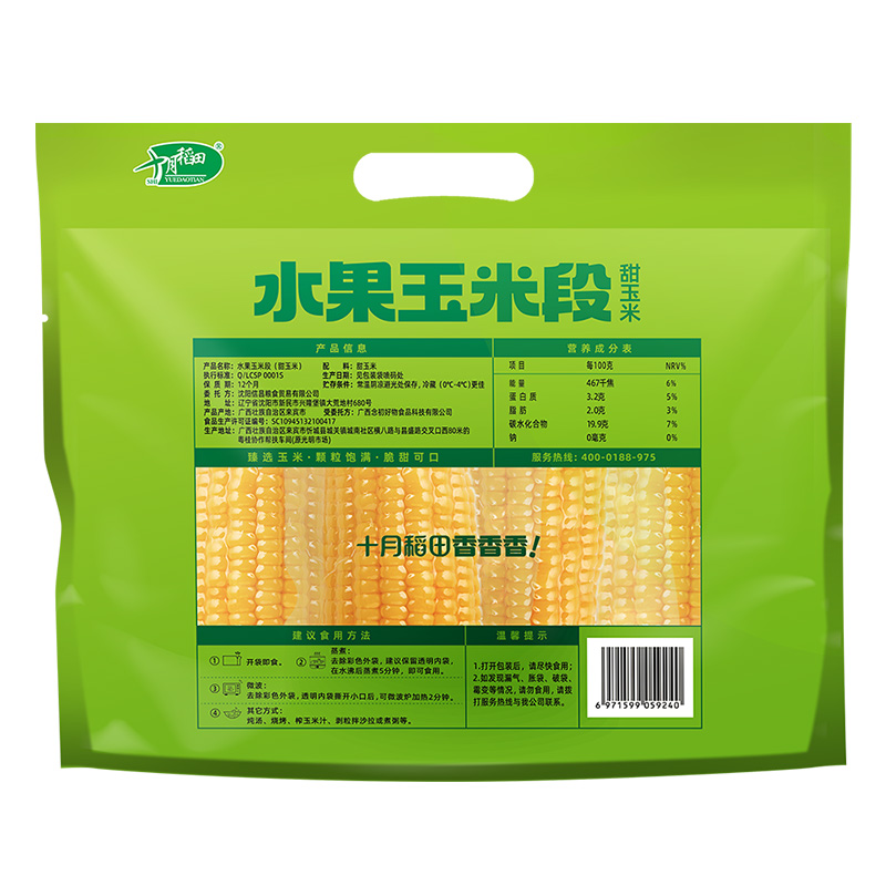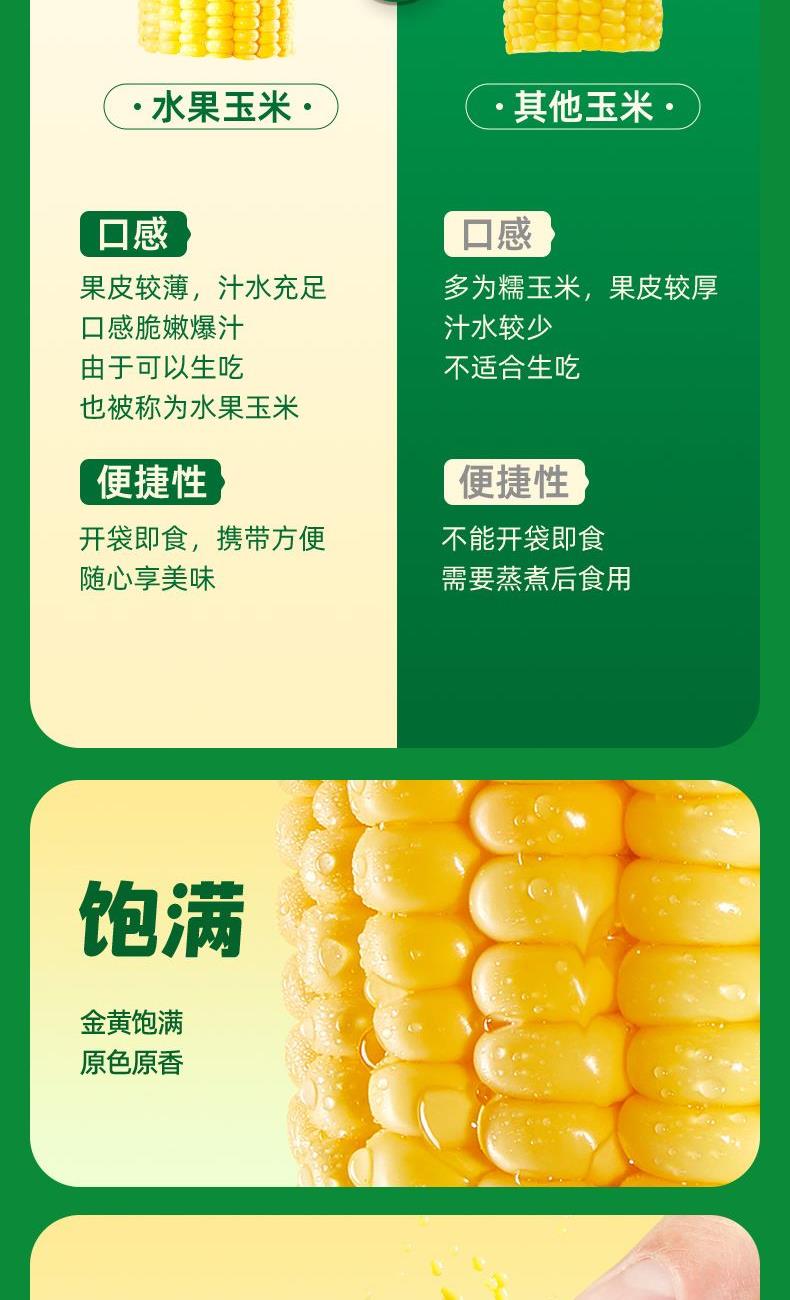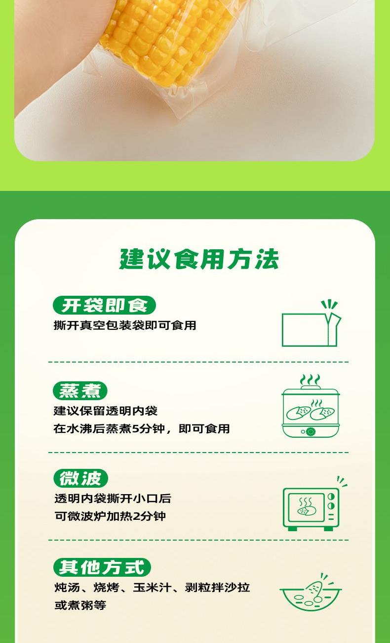 产品信息: ①规格:1kg ②保质期:12个月 ③贮存条件:常温阴凉避光处保存,冷藏(0°C- 4°C)更佳 ④特点:开袋即食甜玉米,果皮较薄,饱满爆汁,携带方便,单根真空独立包装
