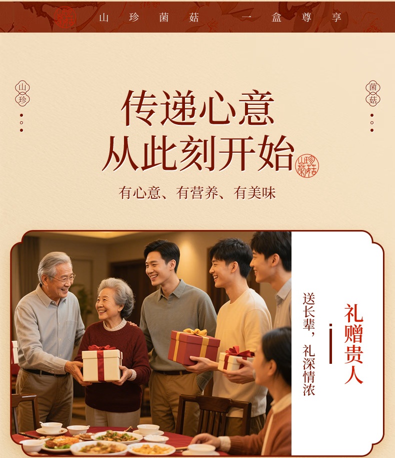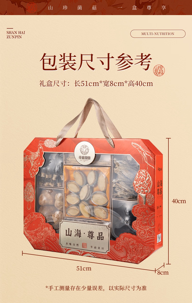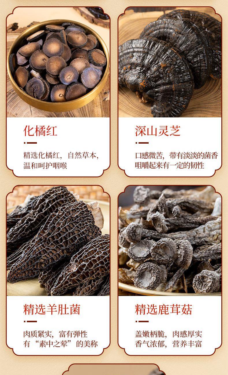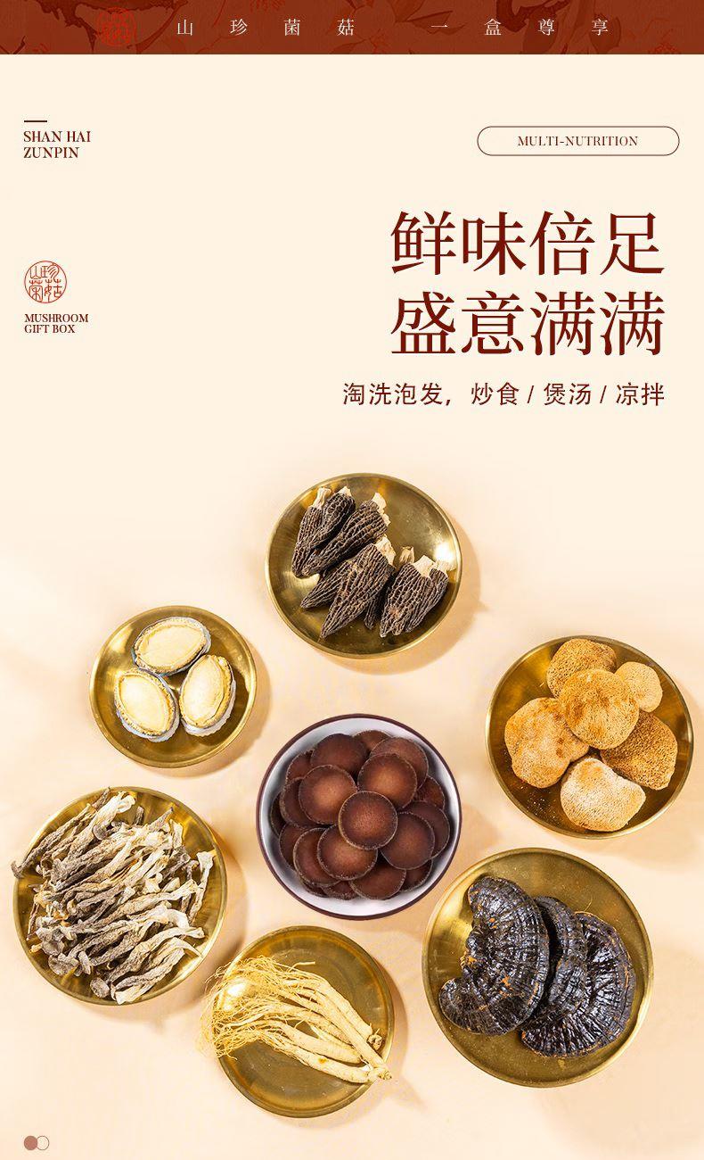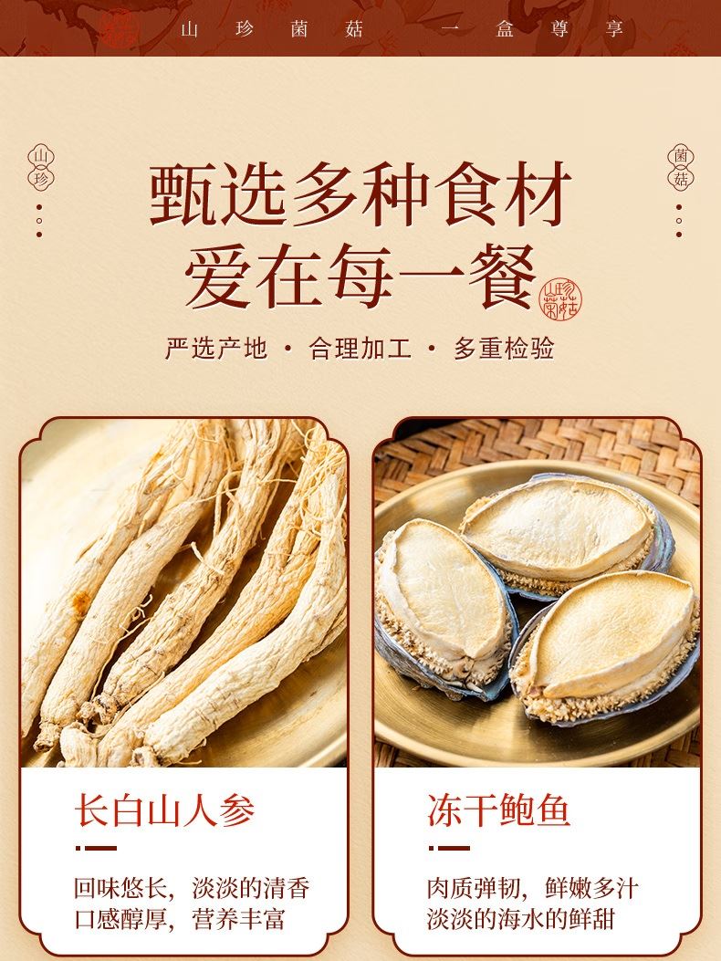 产品配置: 深山灵芝60g 冻干鲍鱼145g 长白山人参25g 精选化橘红200g 精选羊肚菌20g 精选鹿茸菇80g 精选猴头菇90g 净含量:620g 礼盒尺寸:51*8*40cm 一盒集齐山海珍馐与深山灵物,长白山人参搭配冻干鲍鱼等, 红色开窗礼盒,自享尊贵,送礼体面。
