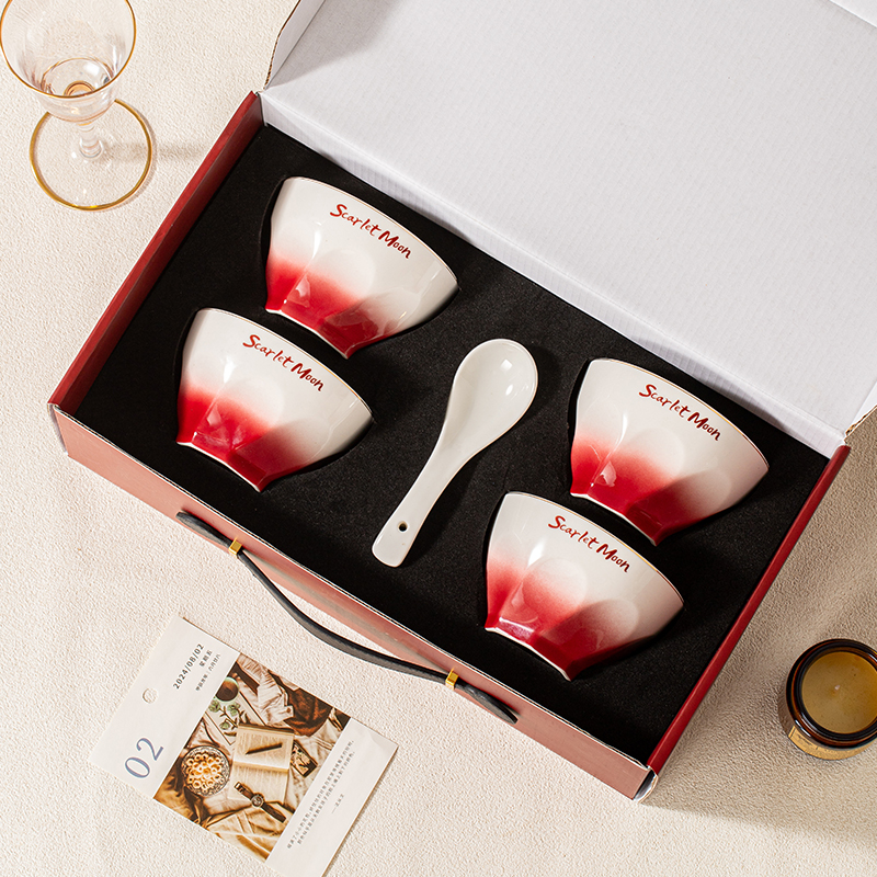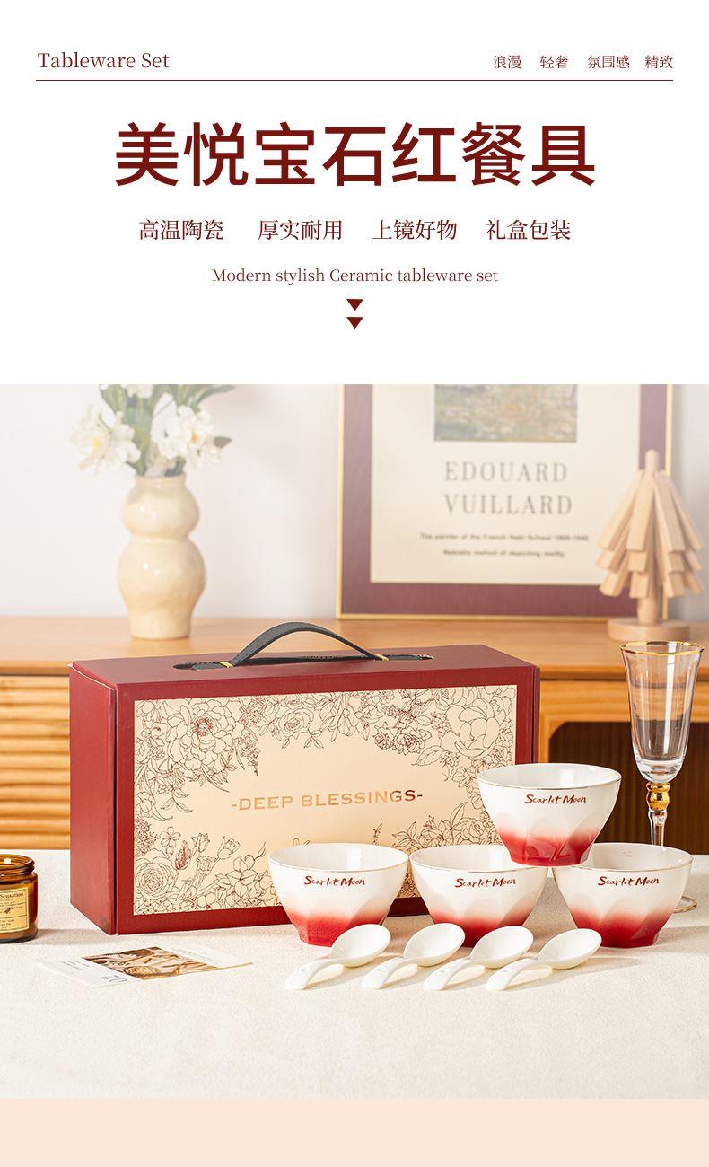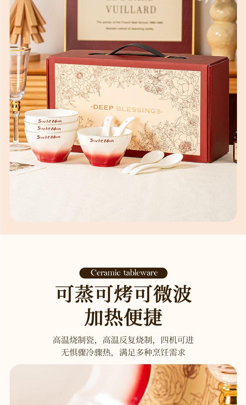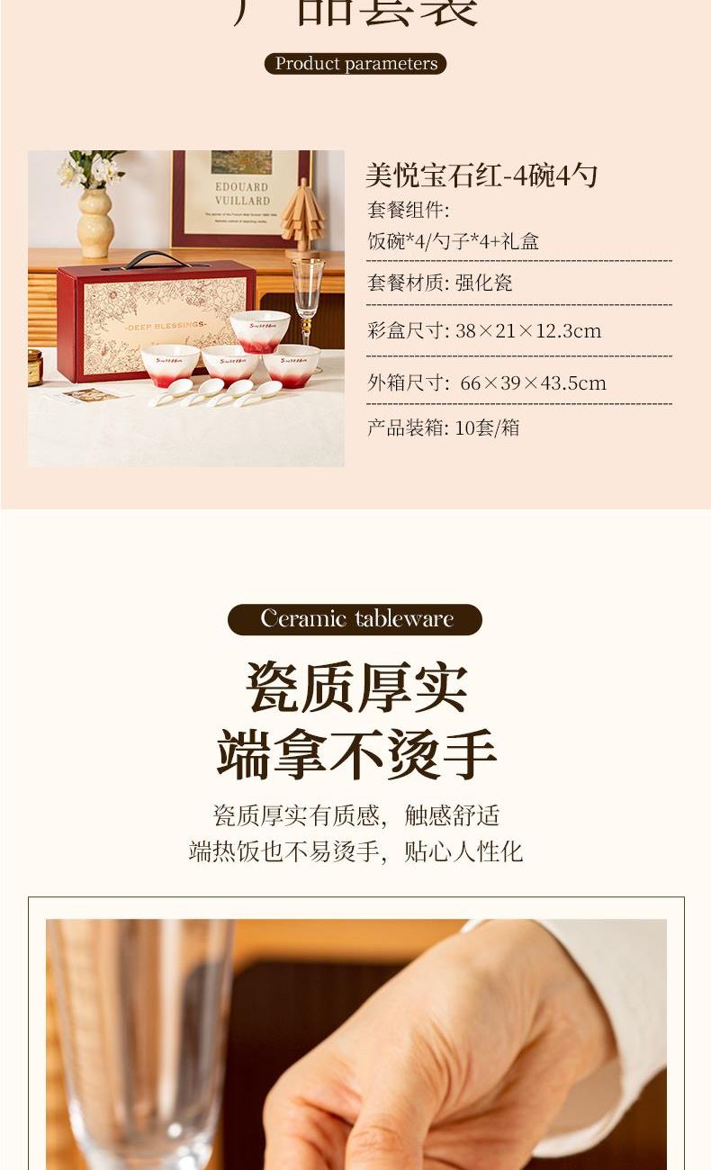 瑾明礼-美悦-宝石红-4碗4勺 - 产品组成:整套= 4碗4勺+1礼盒 产品材质:强化瓷 产品规格:陶瓷碗=口径11.5cm,高度7cm; 汤勺=长14cm 彩盒尺寸:38×21×12.3cm 外箱毛重:14.9kg 外箱尺寸: 66×39×43.5cm - 产品卖点: 采用“宝石红”渐变釉彩工艺,呈现红宝石般的奢华光彩,选用高温烧制。无论是乔迁,新婚或赠礼,都是不错的选择。让平凡的用餐变成红毯盛宴,用宝石般的光泽珍藏重要时刻。