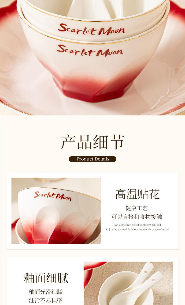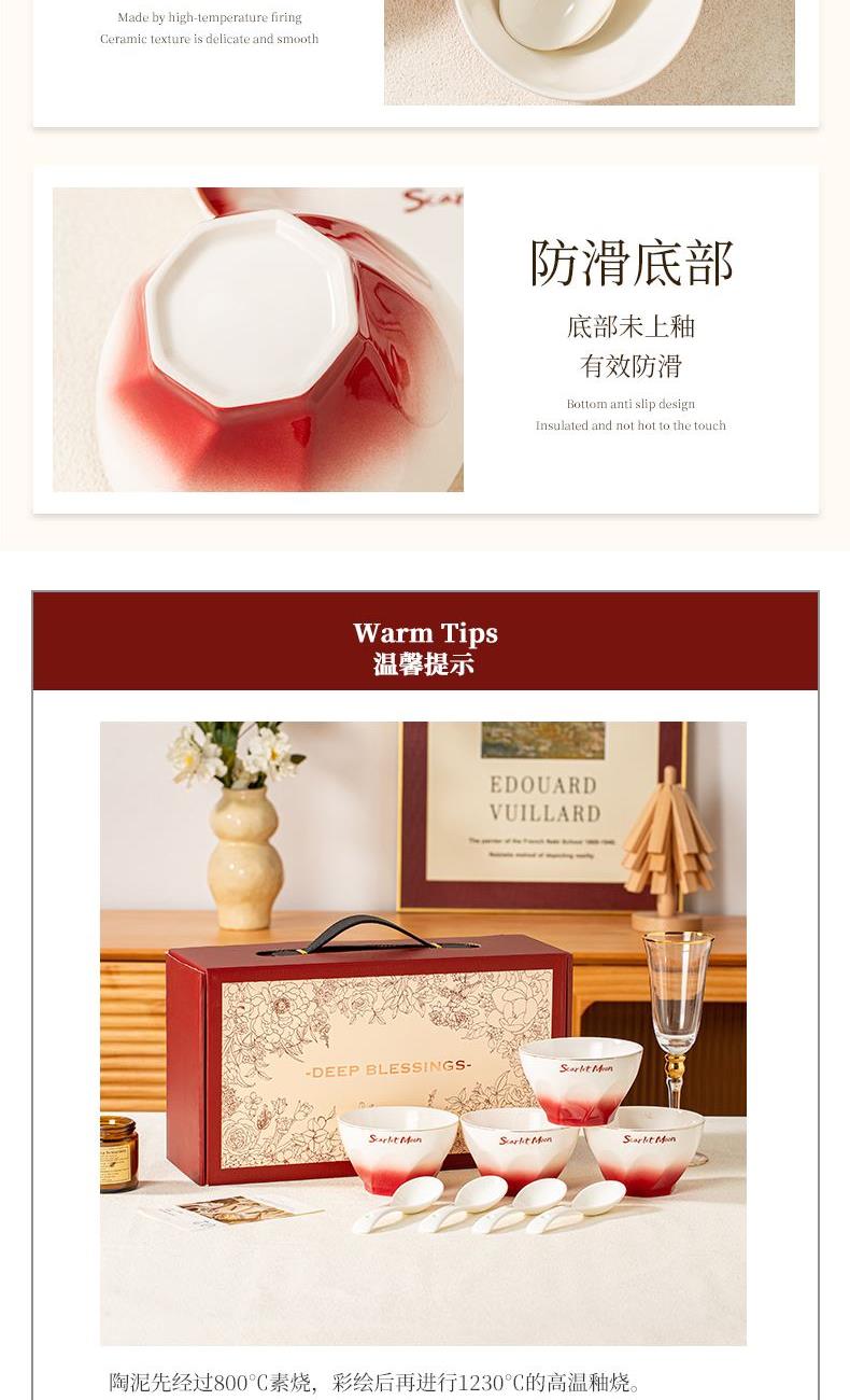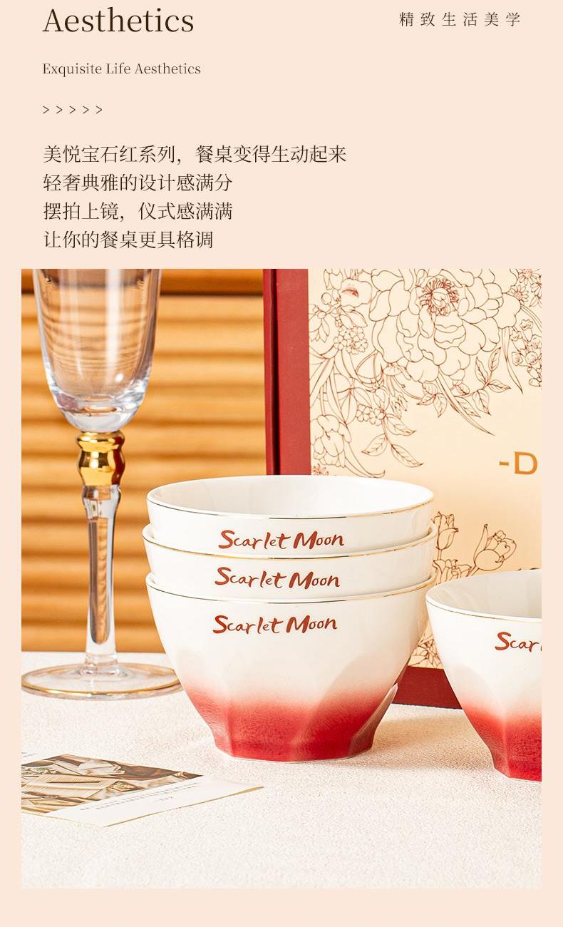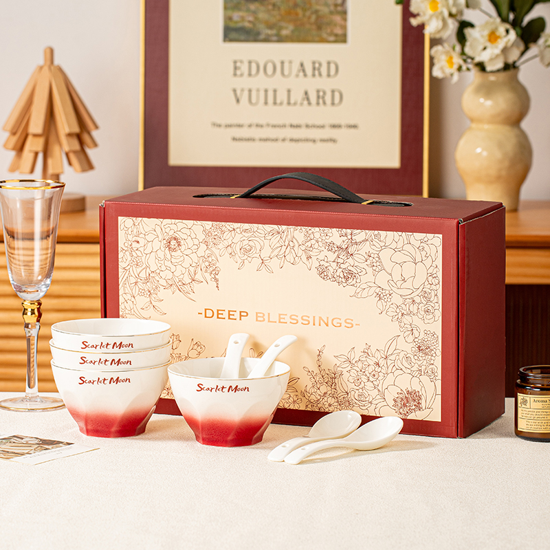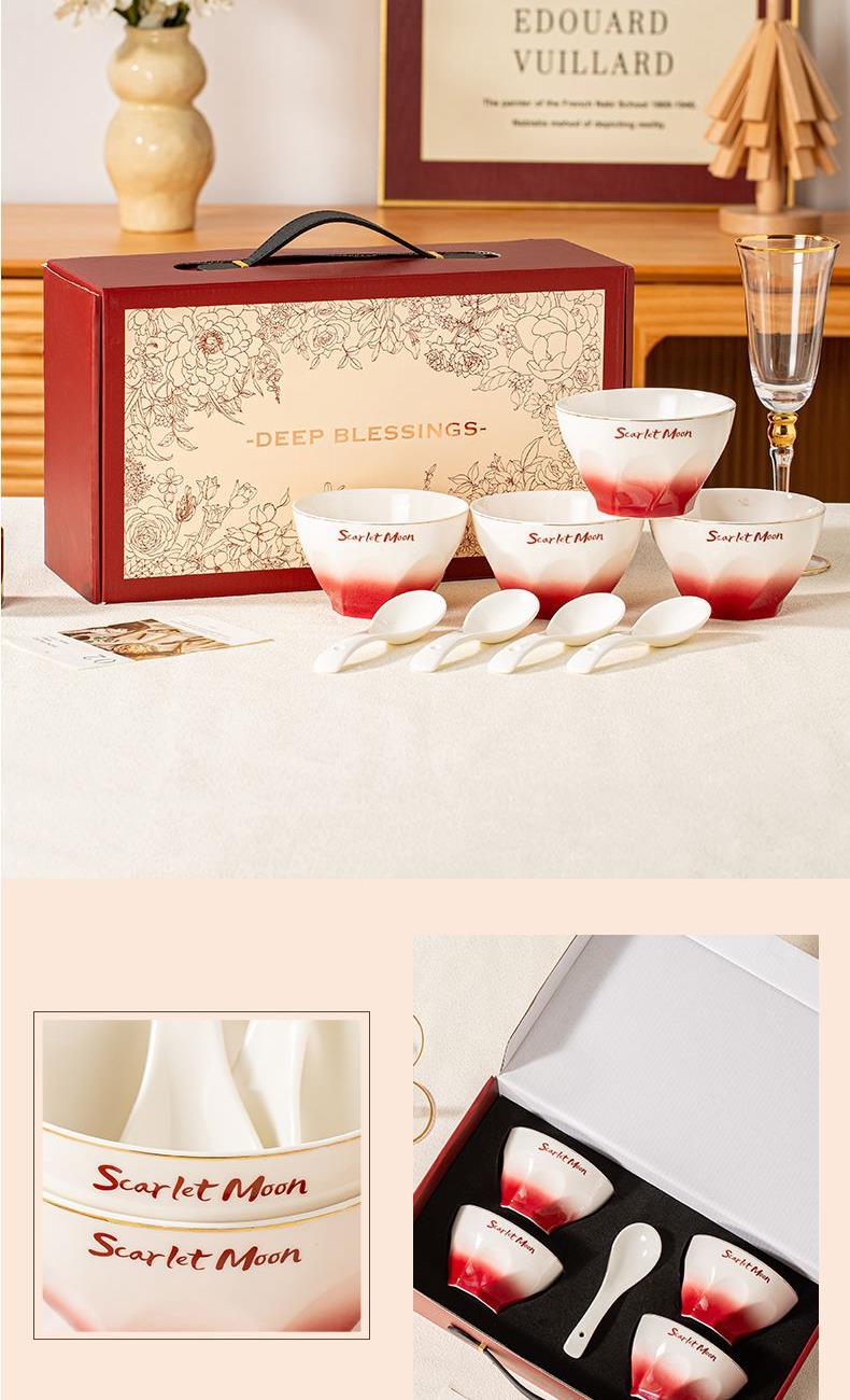 瑾明礼-美悦-宝石红-4碗4勺 - 产品组成:整套= 4碗4勺+1礼盒 产品材质:强化瓷 产品规格:陶瓷碗=口径11.5cm,高度7cm; 汤勺=长14cm 彩盒尺寸:38×21×12.3cm 外箱毛重:14.9kg 外箱尺寸: 66×39×43.5cm - 产品卖点: 采用“宝石红”渐变釉彩工艺,呈现红宝石般的奢华光彩,选用高温烧制。无论是乔迁,新婚或赠礼,都是不错的选择。让平凡的用餐变成红毯盛宴,用宝石般的光泽珍藏重要时刻。