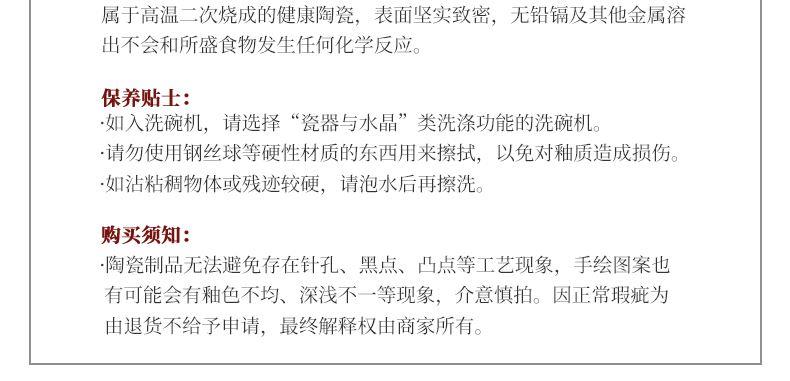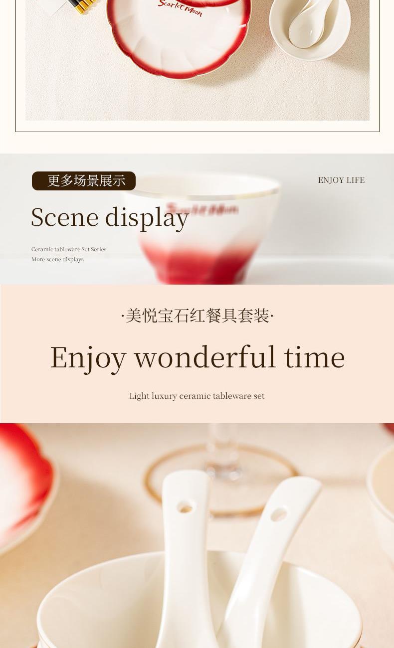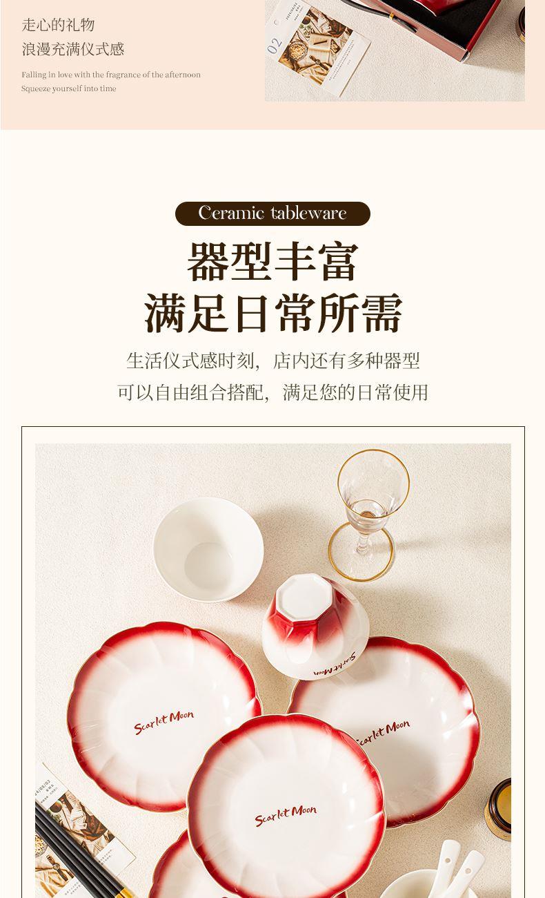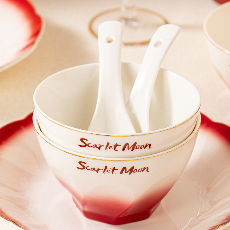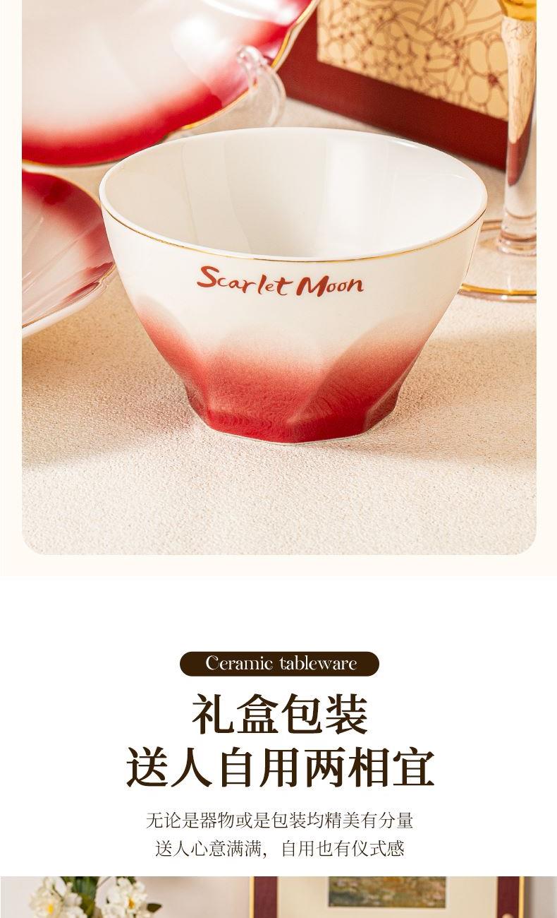瑾明礼-美悦-宝石红-4碗4勺 - 产品组成:整套= 4碗4勺+1礼盒 产品材质:强化瓷 产品规格:陶瓷碗=口径11.5cm,高度7cm; 汤勺=长14cm 彩盒尺寸:38×21×12.3cm 外箱毛重:14.9kg 外箱尺寸: 66×39×43.5cm - 产品卖点: 采用“宝石红”渐变釉彩工艺,呈现红宝石般的奢华光彩,选用高温烧制。无论是乔迁,新婚或赠礼,都是不错的选择。让平凡的用餐变成红毯盛宴,用宝石般的光泽珍藏重要时刻。