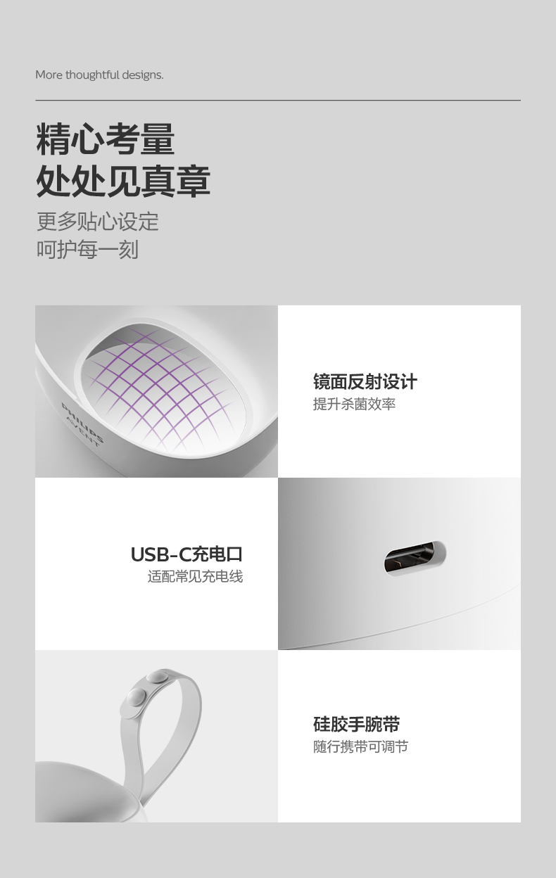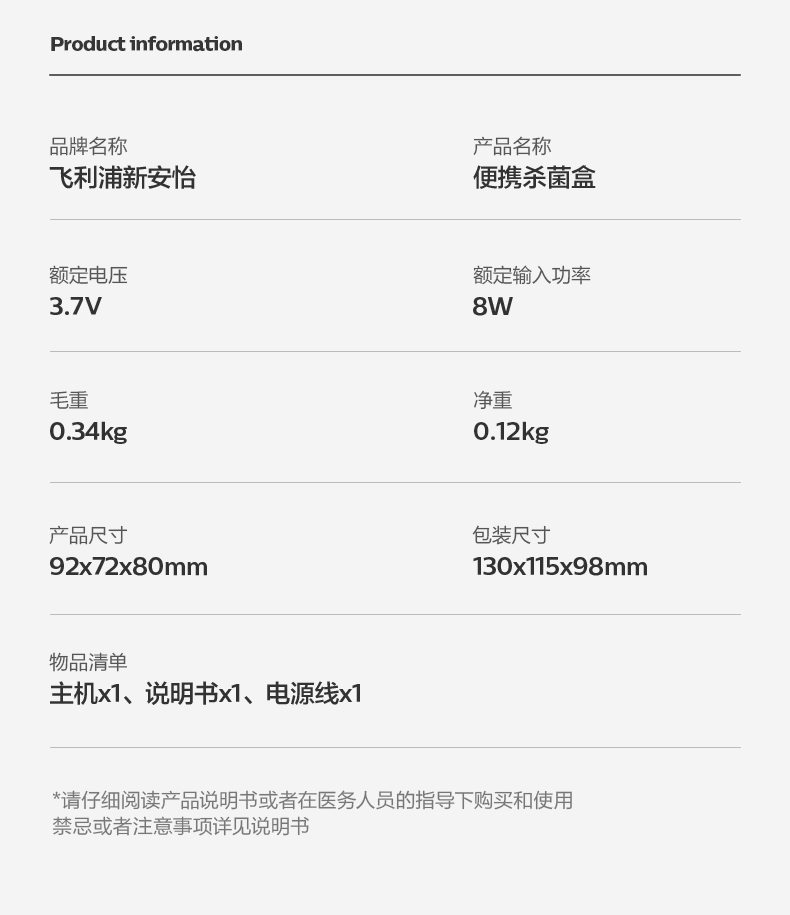 主要材质:ABS+硅胶 颜色:北极白 额定电压:3.7V 额定输入功率:8W 便携UV消毒盒,外出随取随用 UV双灯芯设计,4灯珠UV消毒 严选食品级材质,仅125g,超轻便携 59秒/180秒双档模式,超长续航,满电畅享多次使用