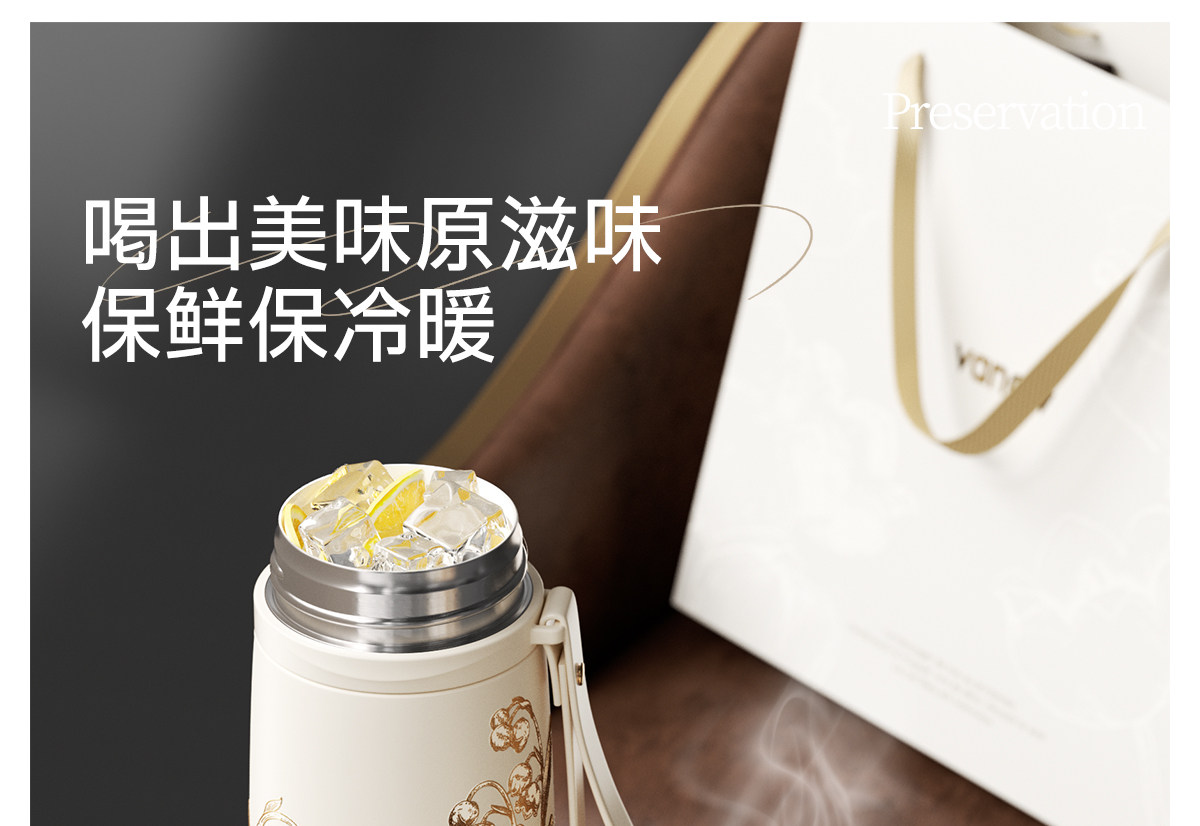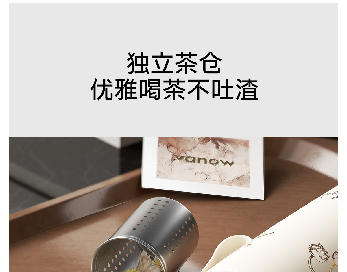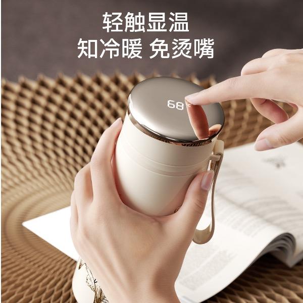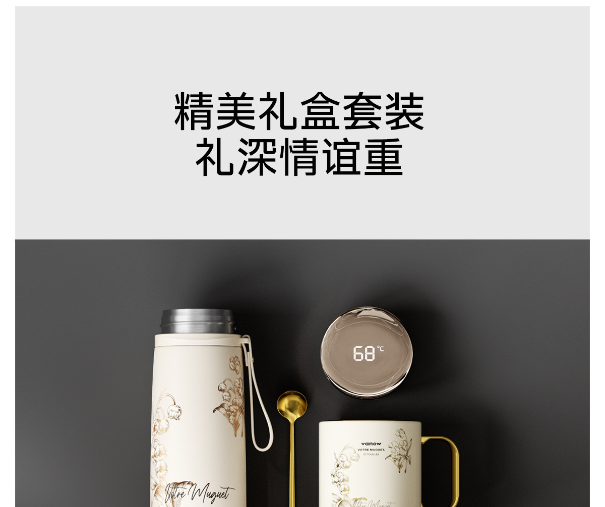 型号:VO-LL46CT 颜色:铃兰白 容量:460ml+350ml 尺寸:190*72mm/103*86mm 材质:316不锈钢内胆,陶瓷马克杯,硅橡胶 产品卖点:1.知温度识冷暖,心坎里的保温杯 2.轻触显温,黑科技智能加持 3.独立茶仓,优雅喝茶不吐渣 4.鎏金马克杯,美观且握感舒适
