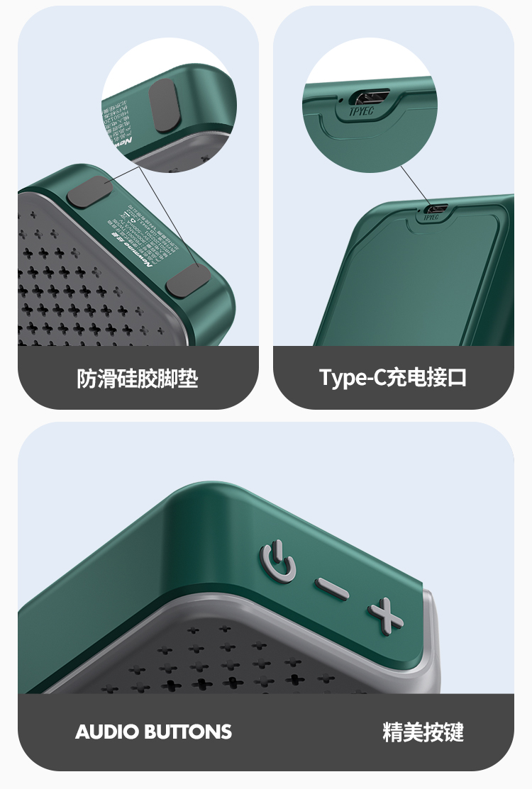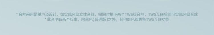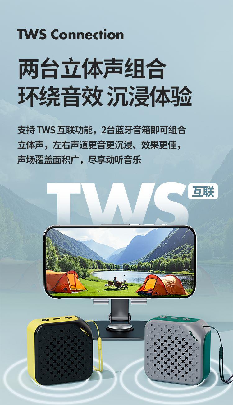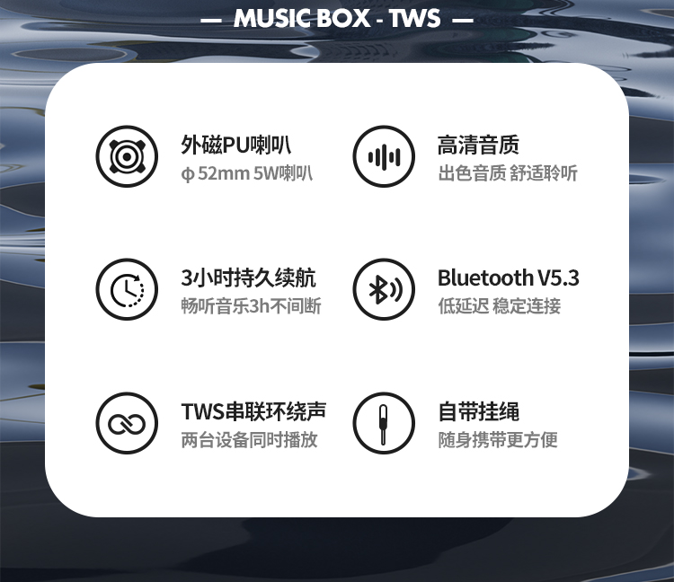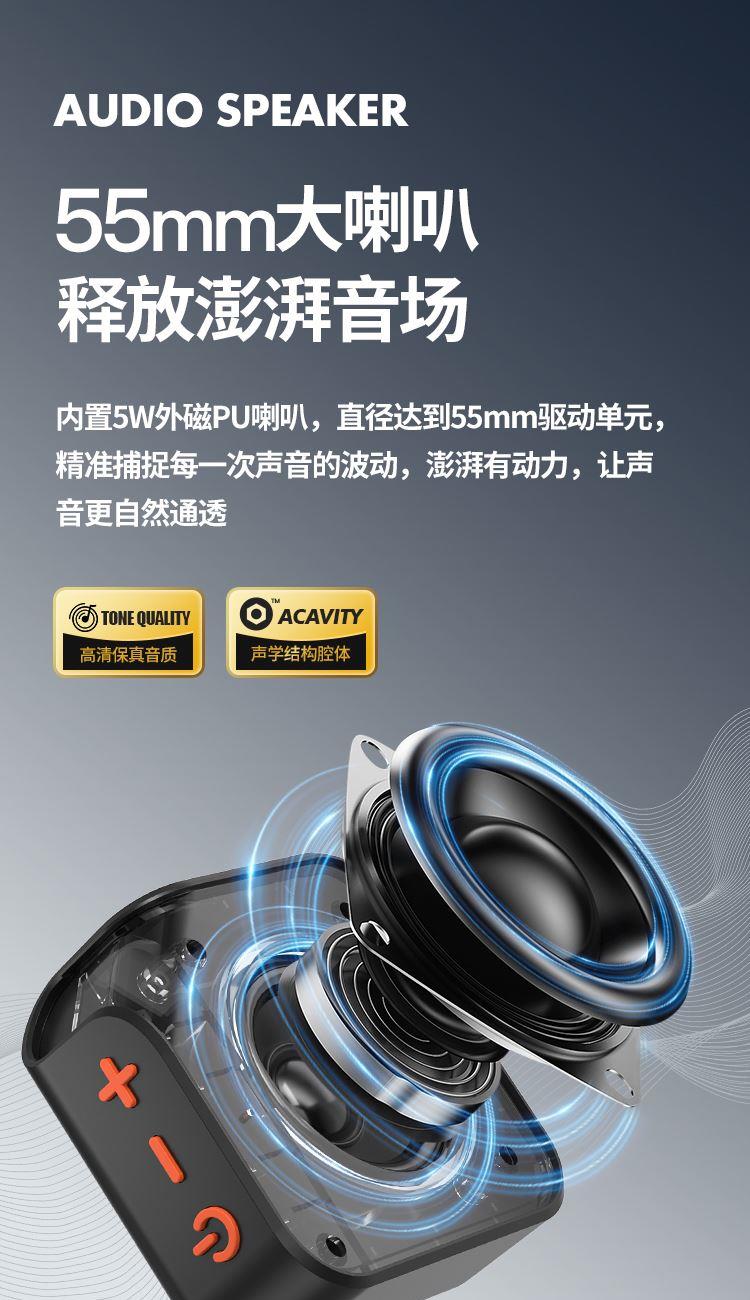 支持免提通话,切换上下曲。2台支持TWS串联 芯片:中科蓝讯, 蓝牙版本:5.3,有效距离:10米 支持蓝牙协议:A2DP、AVRCP、HSP、HFP 喇叭规格:Ф52mm, 4Ω 5W 音响功放类型:Class-D 音频信噪比:≥75dB 频率响应:20Hz-20KHz 内置电池:800mAh 音乐时长:3-5h , 充电时长:3h