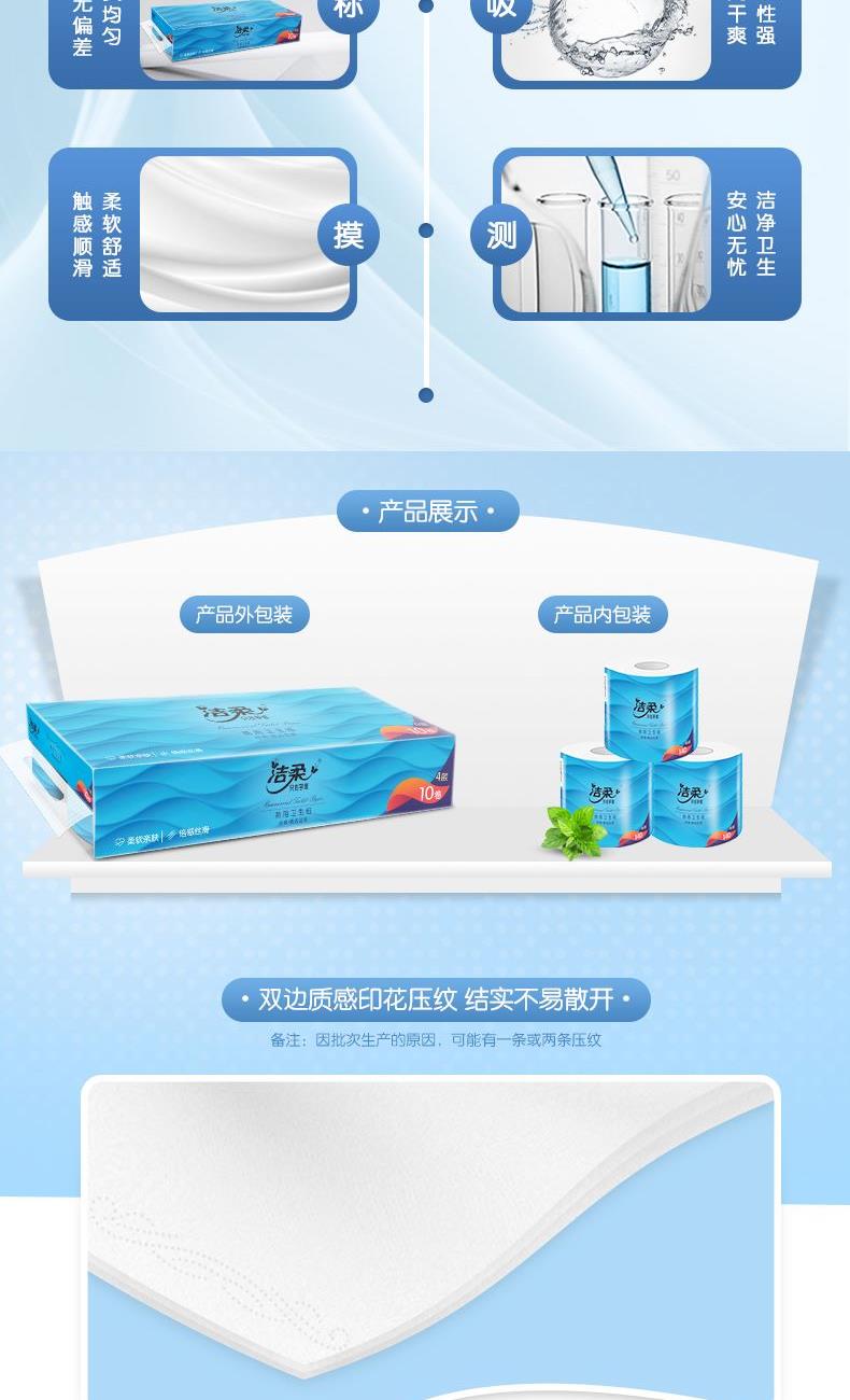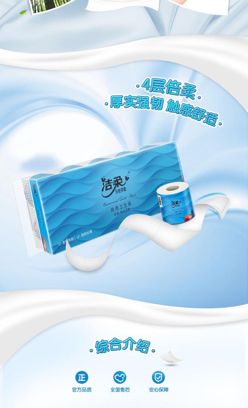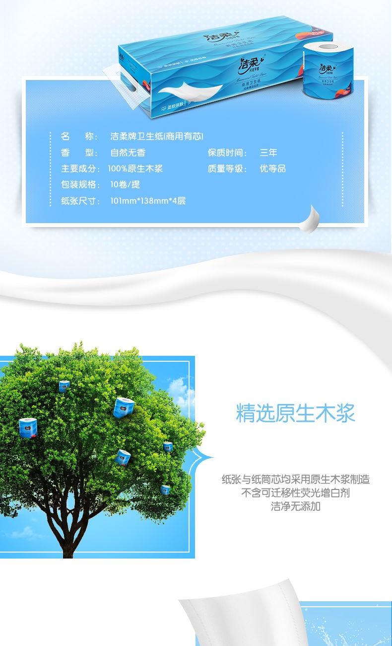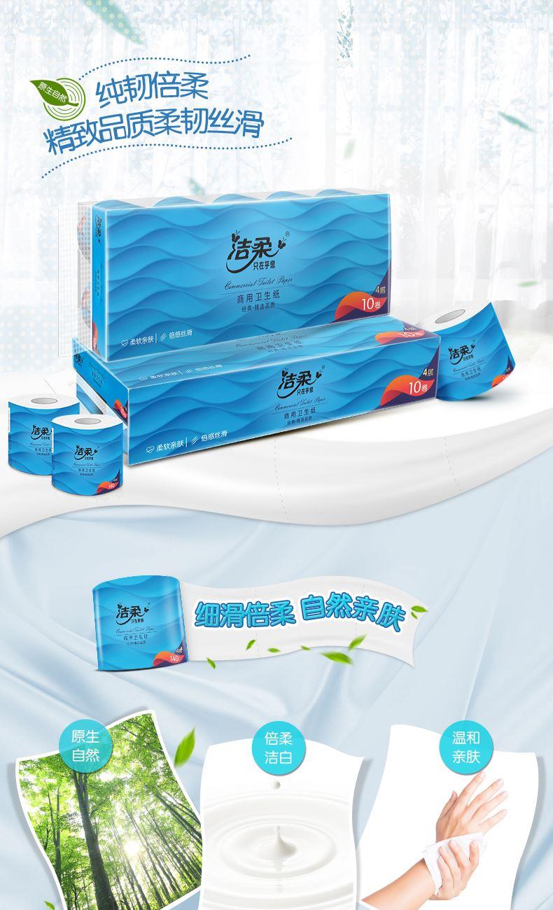 JJ177-10A洁柔牌卫生纸(商用有芯)140g4层(10卷装) 名 称:洁柔牌卫生纸(商用有芯) 香型:自然无香 保质时间: 三年 主要成分:原生木浆 质量等级: 优等品 包装规格:10卷/提 纸张尺寸:101mm*138mm*4层 卖点: 柔韧细腻,无纸屑脱落,纸质柔韧密实 速溶于水,防止阻塞