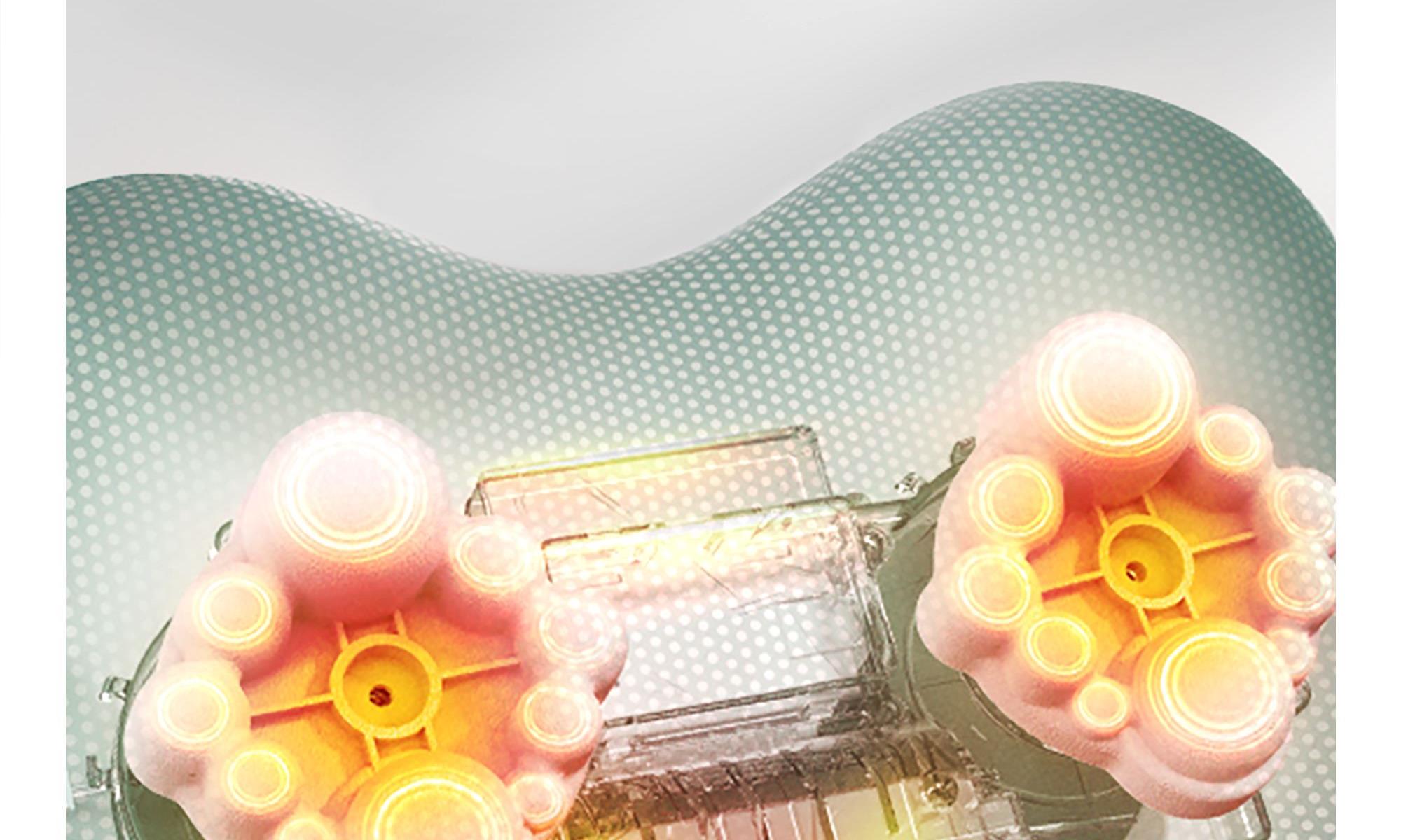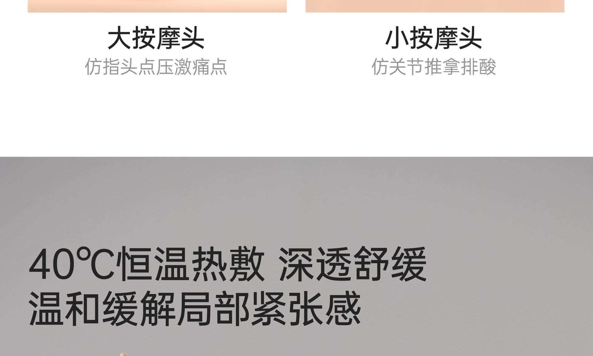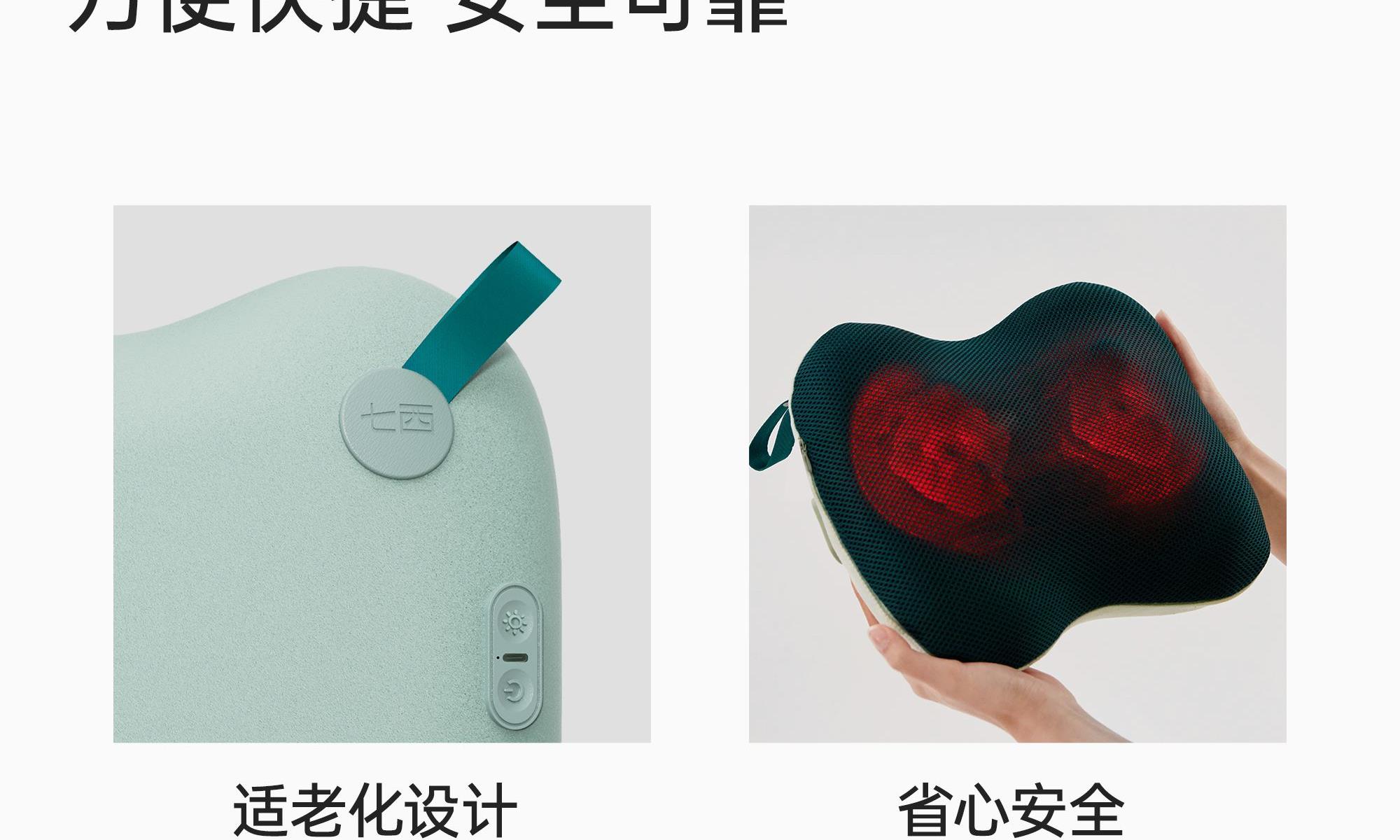 产品规格:310mm*250mm*120mm 产品净重:1.35kg 外箱毛重:2.1kg 外箱尺寸:335*262*119mm 包装方式:彩盒 产品颜色:苏格兰绿/向日葵黄 1、仿指腹按捏,体感舒适 2、体积小,便携利收纳 3、仿人手推揉技法 4、双人工曲线设计,贴合度更高 5、恒温热敷,帮助促进血液循环 6、Type-c充电口,无线使用,居家、办公、车载、出行多场景使用 7.噪音小,续航时间长