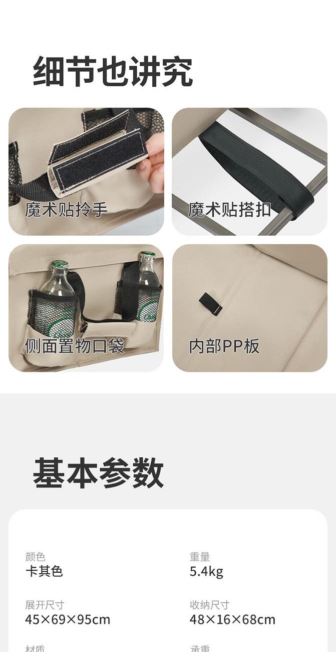 1、100L堆叠容量,小身材大容量出游只需拉一趟。 2、加粗碳钢车架,承重高达240斤。 3、300D双层牛津布,防刮耐磨抗撕裂。 4、阻尼把手,松手回弹不落地。 颜色:卡其色 展开尺寸:45x69x95cm 材质:聚酯纤维、钢架 框内重量/堆叠容量:约60L/约100L 重量:5.4kg 收纳尺寸:48x16x68cm 承重:240斤 折叠方式:平折