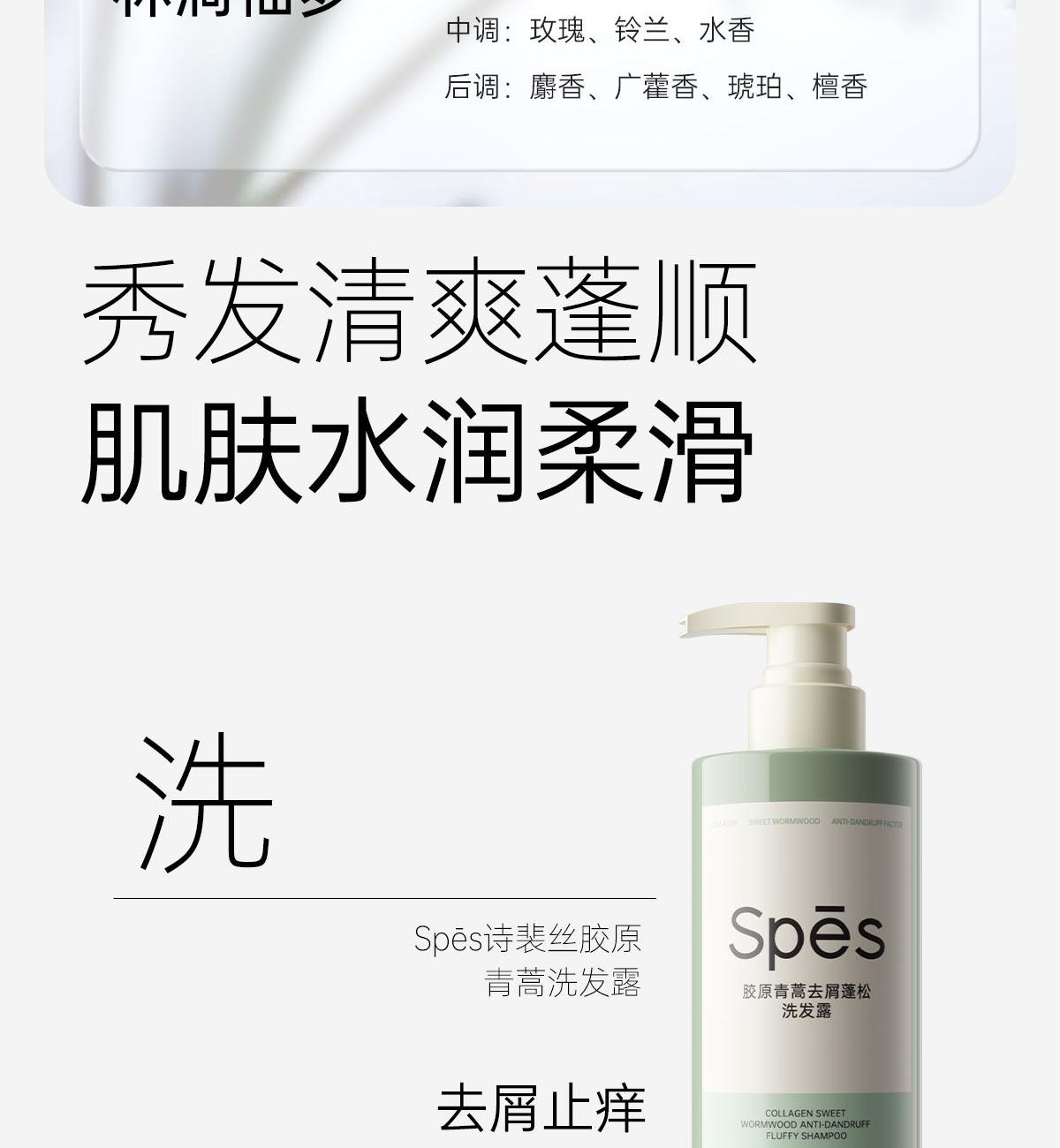 Spēs诗裴丝胶原青蒿洗沐套装(500ml+400ml) 核心功效: 胶原嘭弹头皮 青蒿去屑止痒 温润净肤柔嫩 适用人群 适用于油性、中性、干性发质的 产品卖点: 去屑止痒 轻盈蓬松 柔嫩肌肤