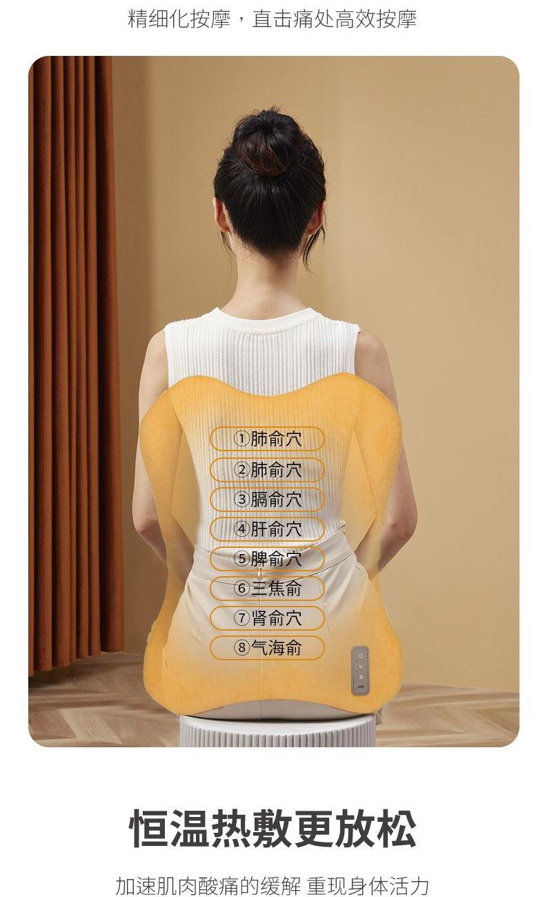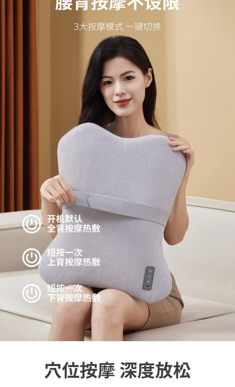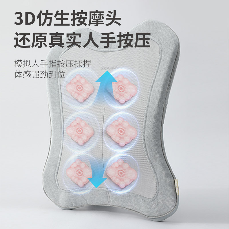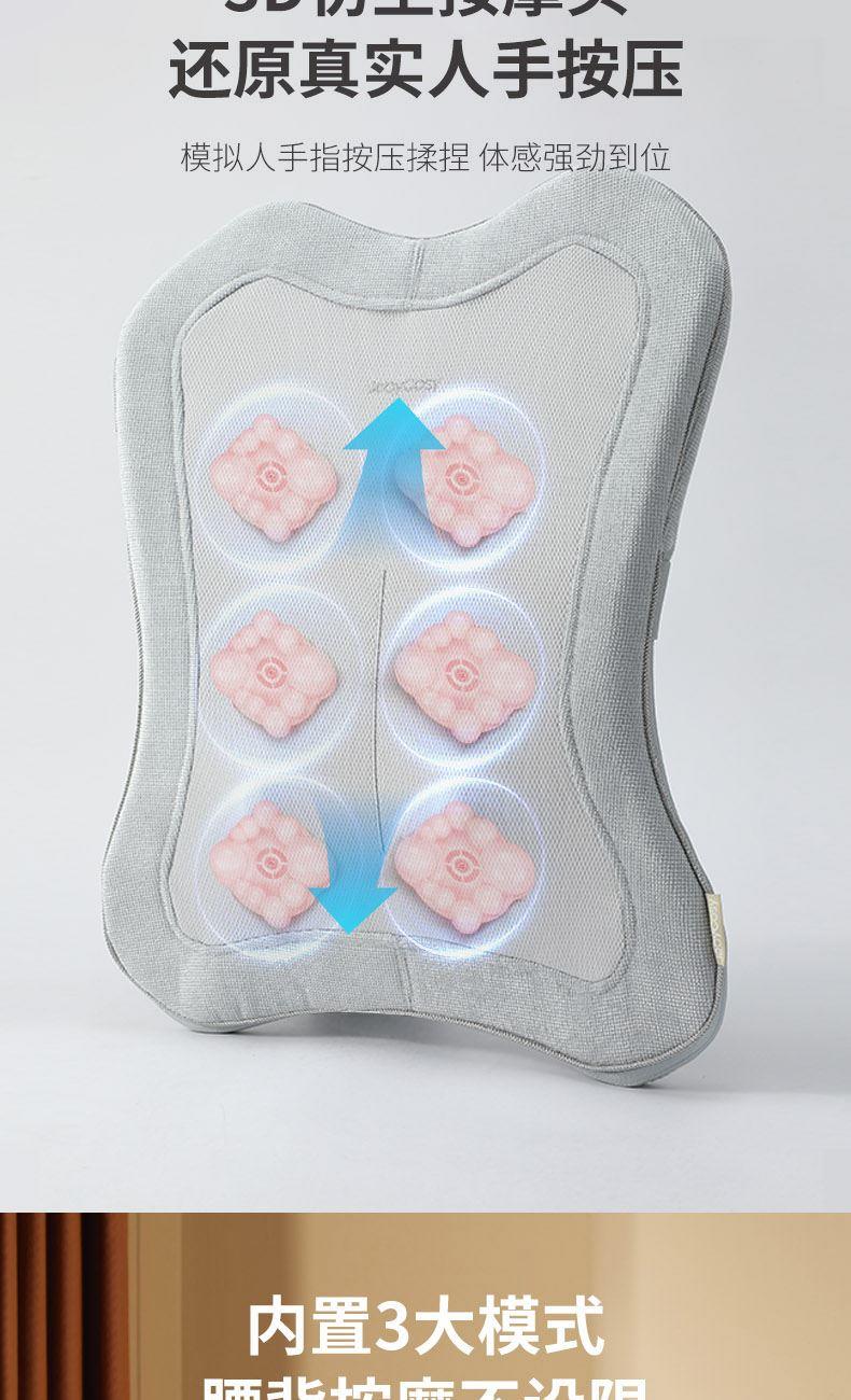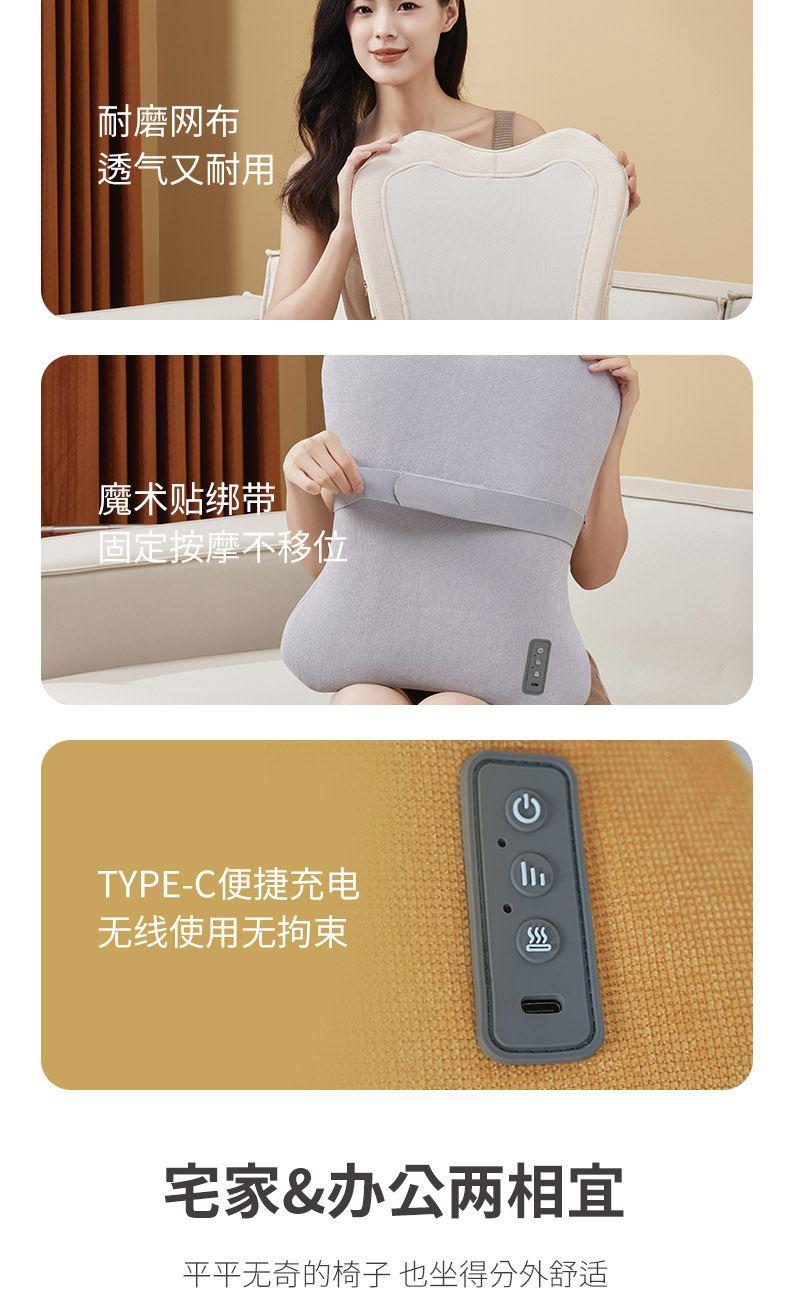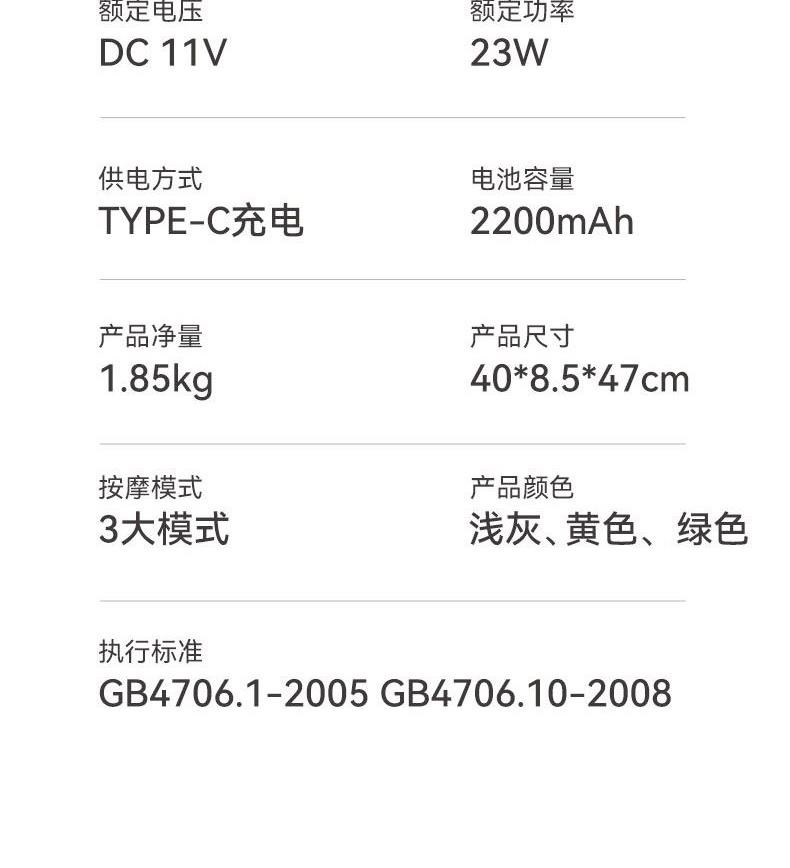 布套材质:全涤纶 供电方式:TYPE-C 2200mAh 产品颜色:浅灰、黄色、绿色 按摩方式:3D导轨按摩热敷 功率:23W 按摩时间:15分钟 控制方式:机身按键 产品尺寸:40x8.5x47cm