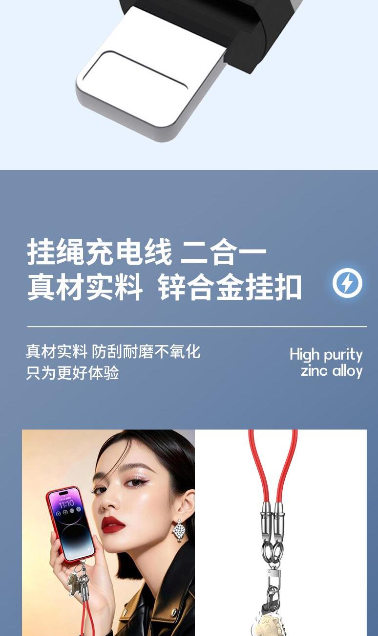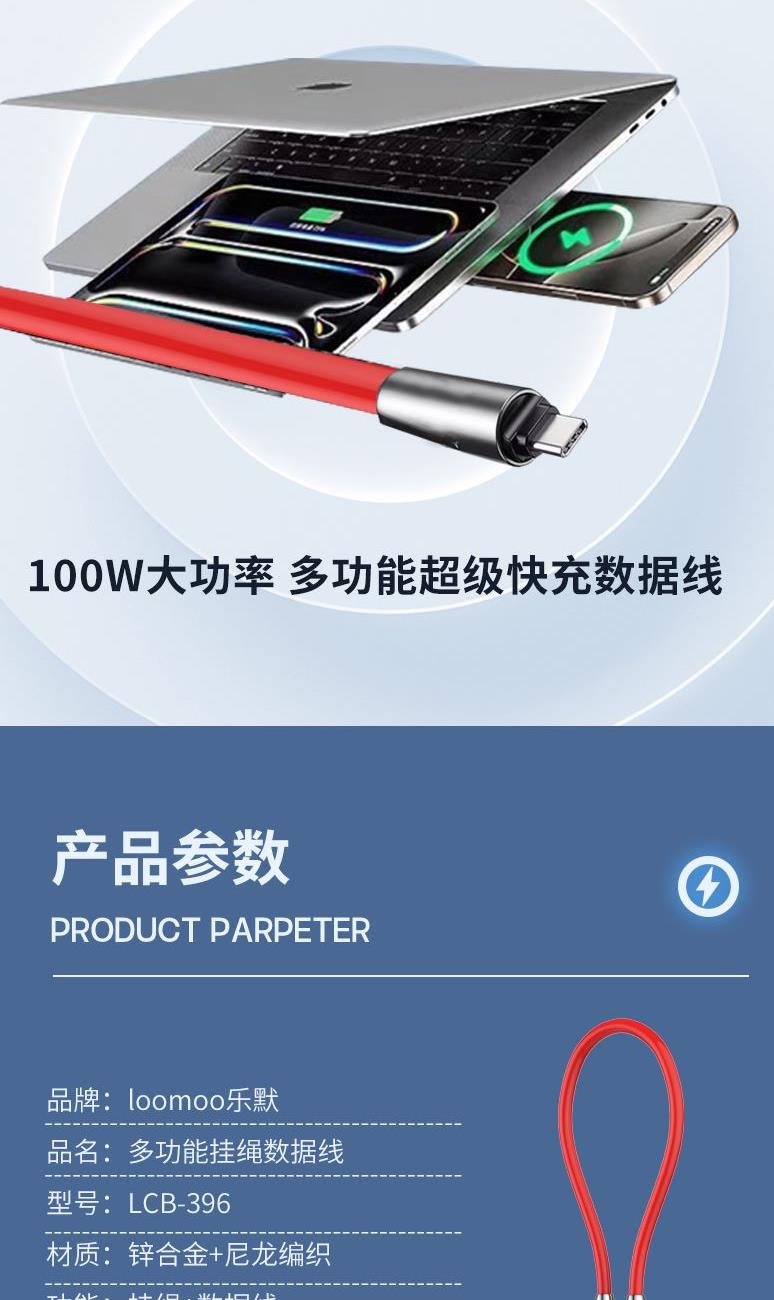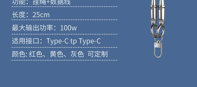 电流:5A 功能:挂绳+数据线 产品材质:锌合金+硅胶 输出功率:100w 适用接口:Type-C tp Type-C 69码:6972991657478 颜色:红色、黄色、灰色颜色可定制 Type-C tp Type-C100W超速闪充数据线铝合金外壳/加粗编织挂绳,一绳两用简单一挂、机不离身外出手机搭档,便携出行解放双手。