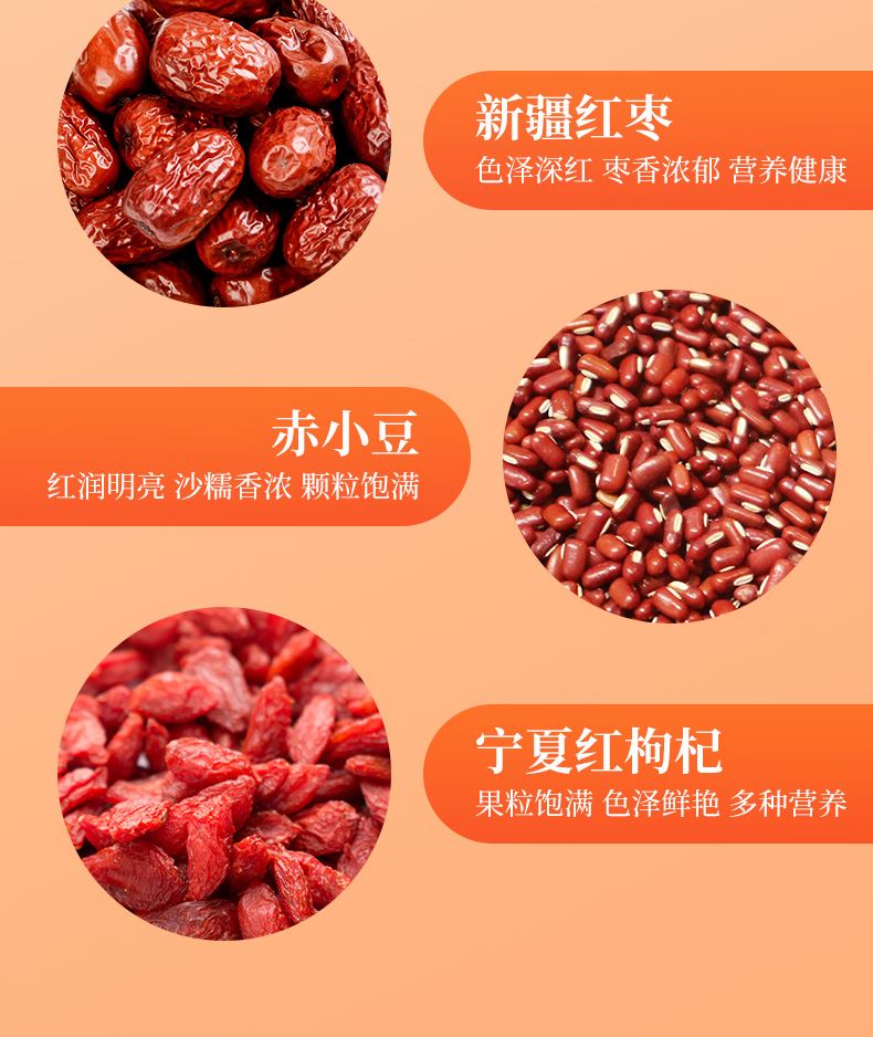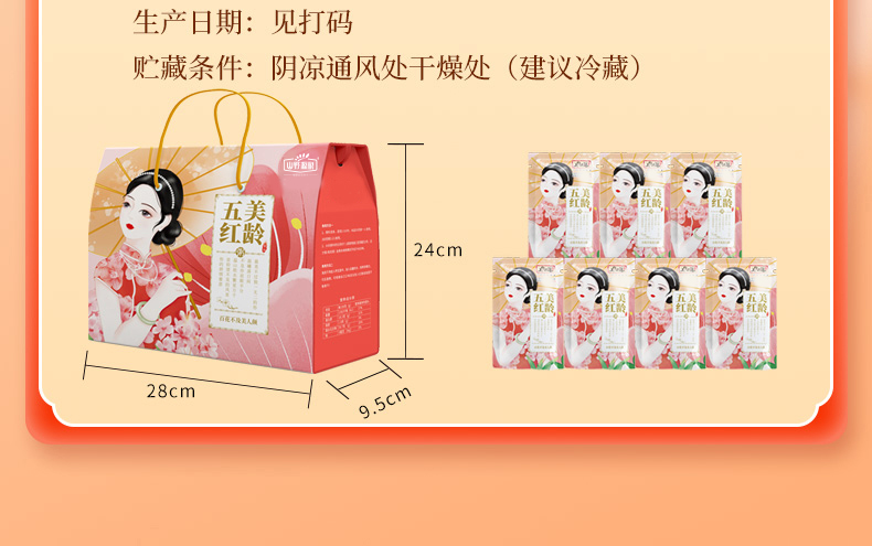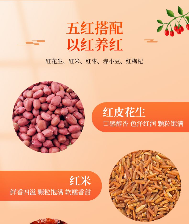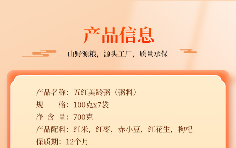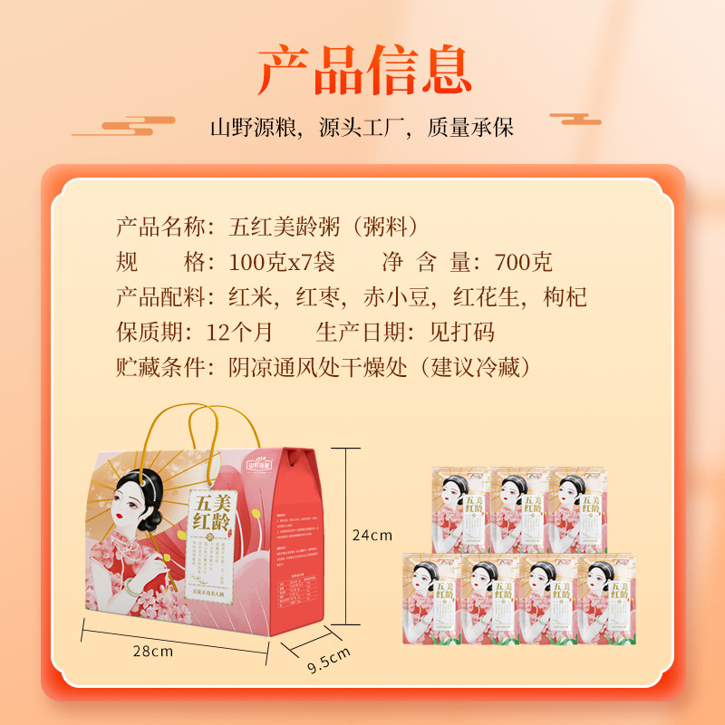 规格:100g*7( 0.7kg) 配料:红花生、红米、红枣、赤小豆、红枸杞 盒尺寸:屋顶28*9.5*24 箱重量:屋顶15.53kg 箱尺寸:屋顶装58*40*50(0.116方)