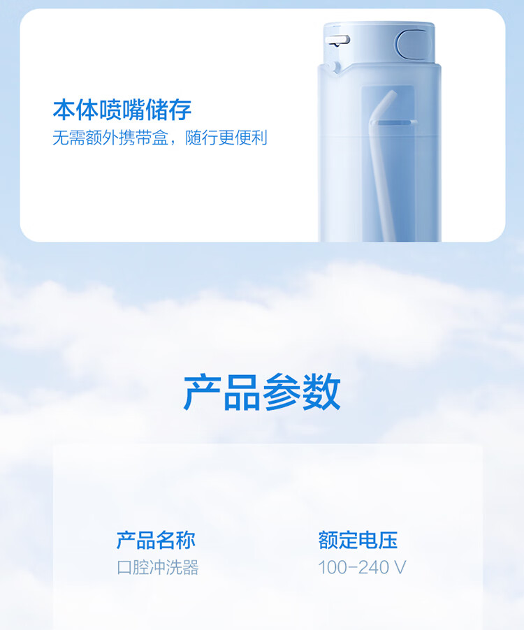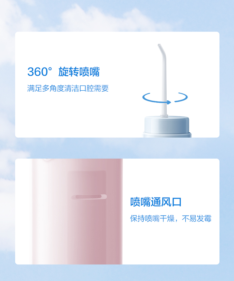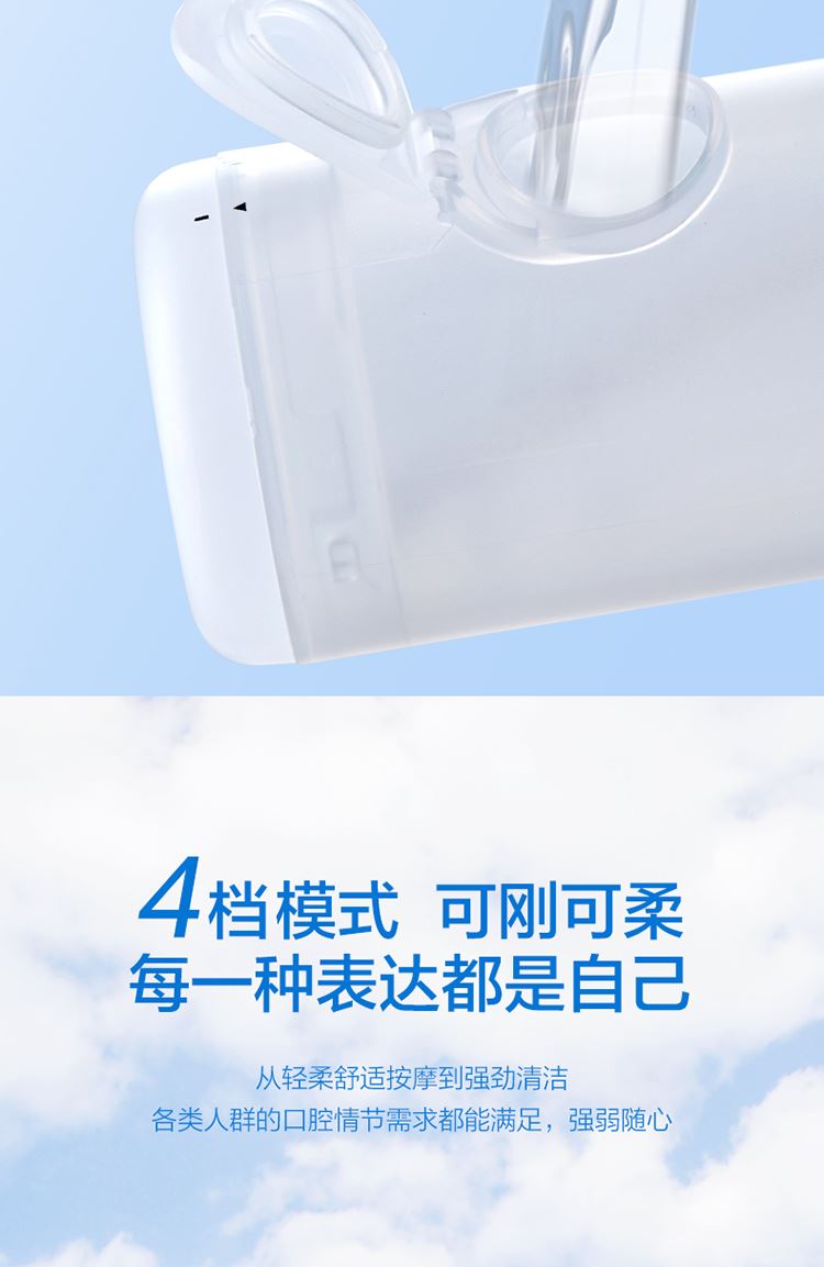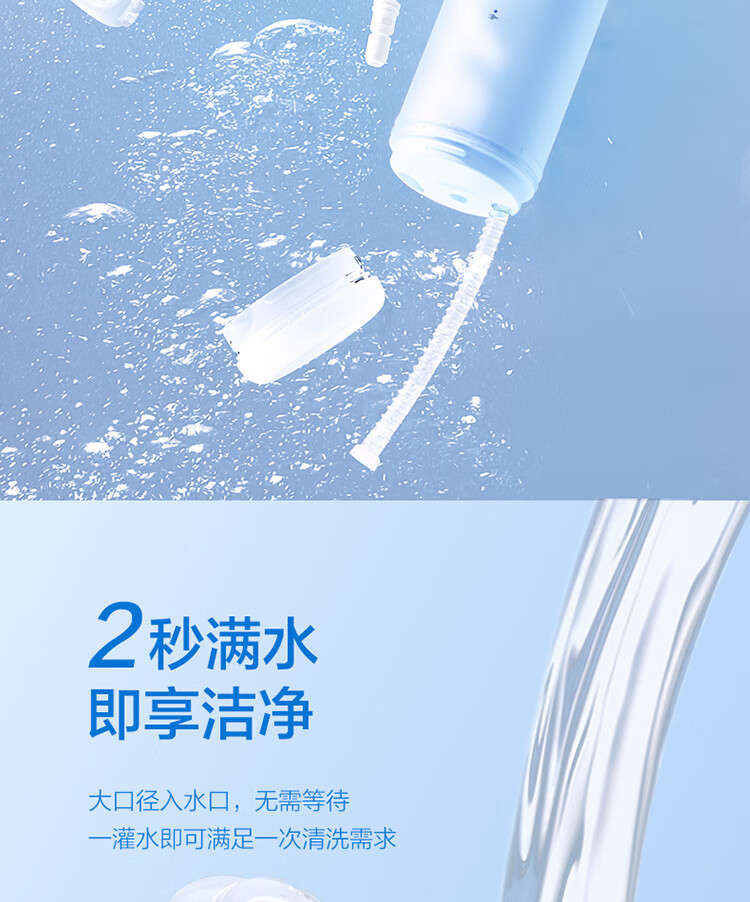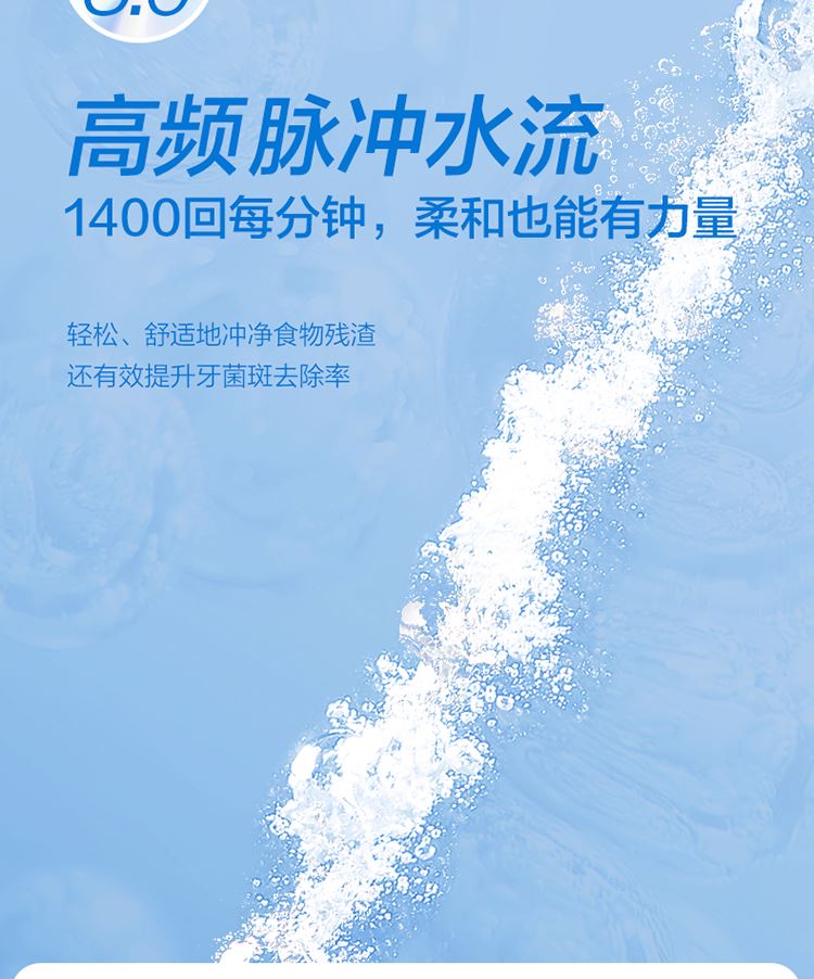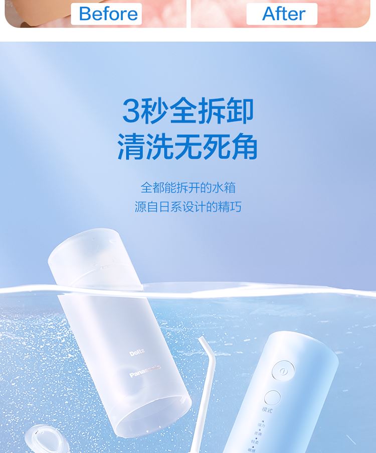1. 高频脉冲水流,轻松、舒适地冲净实物残渣,有效提升牙菌斑去除率 2. 全都能拆开的水箱,3秒全拆卸,清洗无死角+2秒满水,大口径入水口 3. 4档模式,可刚可柔。各类人群的口腔清洁需求都能满足,强弱随心 4. 机身可伸缩设计,体积小巧不占地 5. IPX7级防水,从容应对各种环境