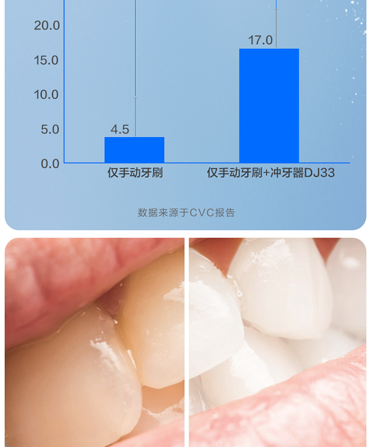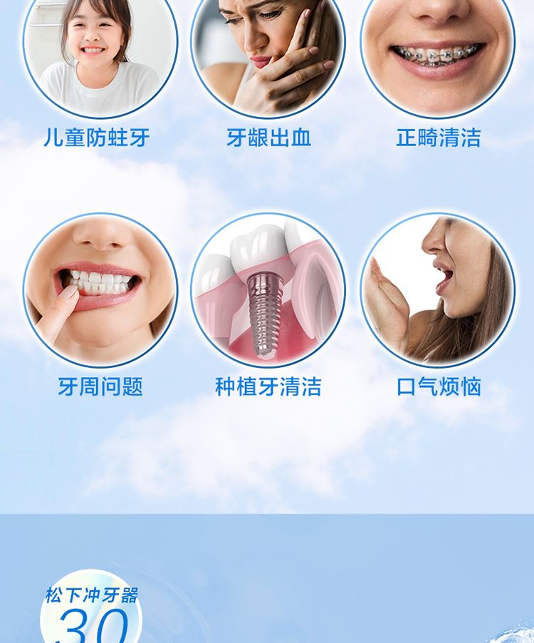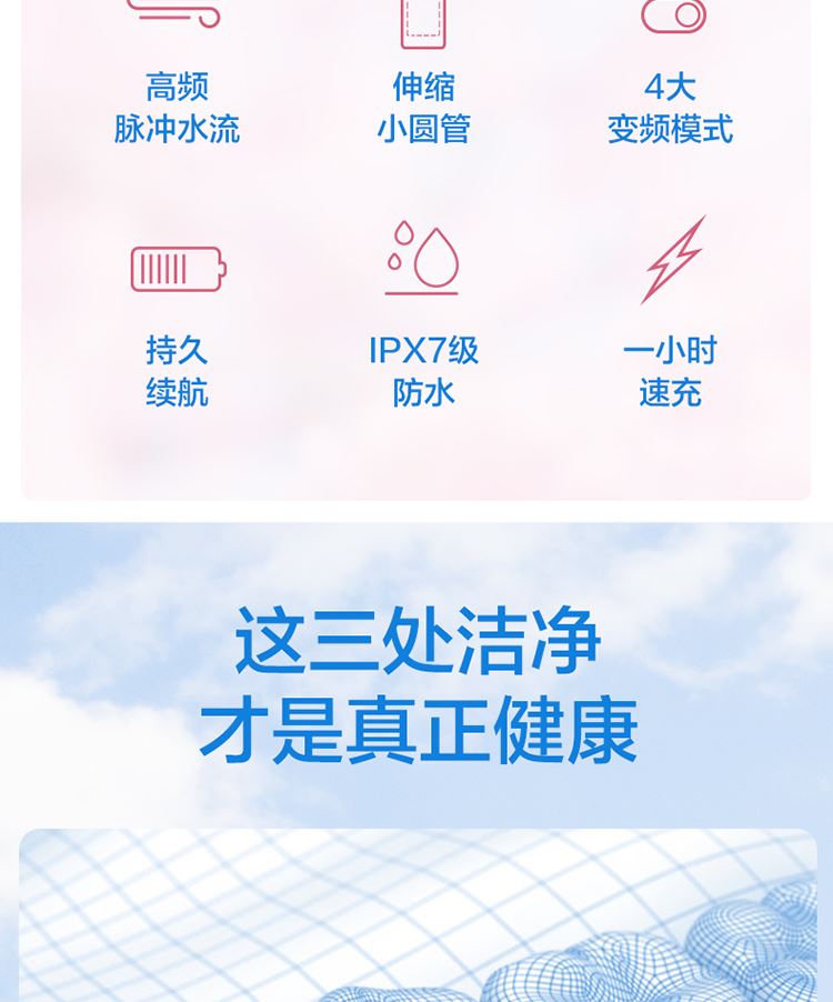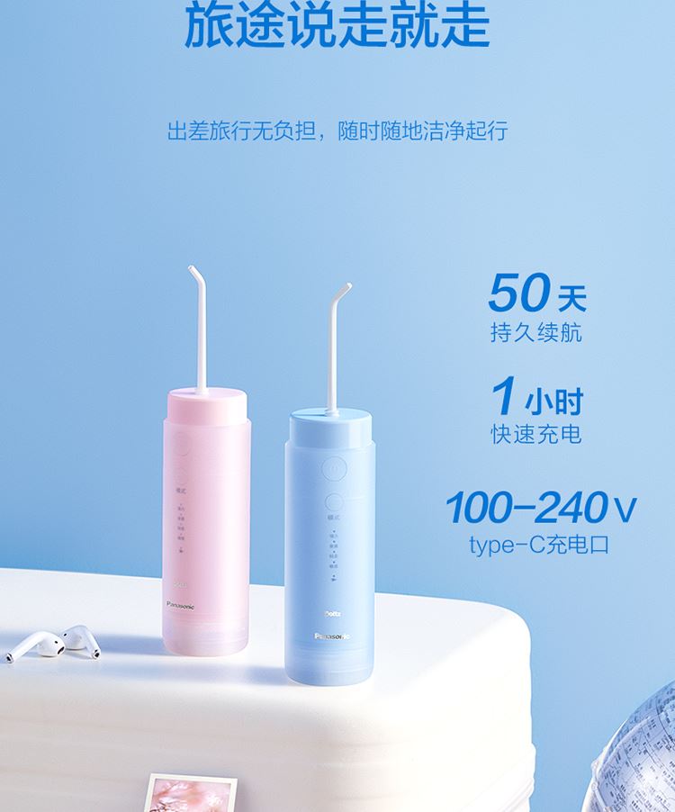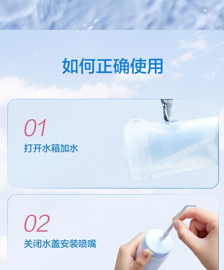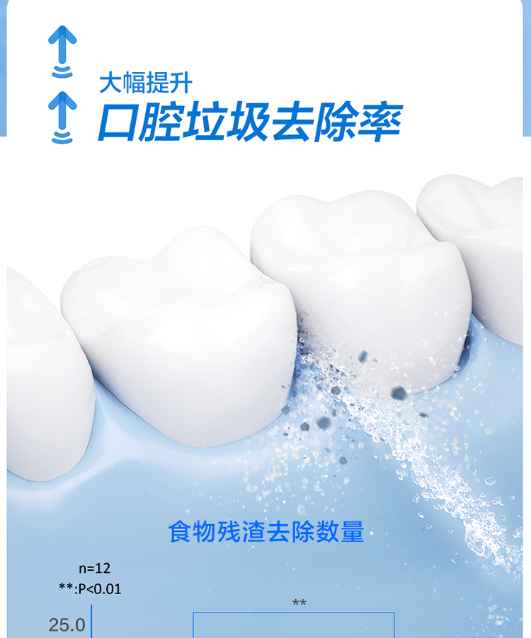1. 高频脉冲水流,轻松、舒适地冲净实物残渣,有效提升牙菌斑去除率 2. 全都能拆开的水箱,3秒全拆卸,清洗无死角+2秒满水,大口径入水口 3. 4档模式,可刚可柔。各类人群的口腔清洁需求都能满足,强弱随心 4. 机身可伸缩设计,体积小巧不占地 5. IPX7级防水,从容应对各种环境