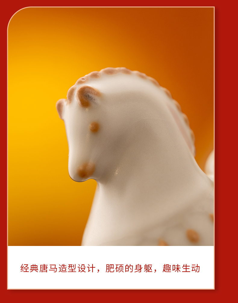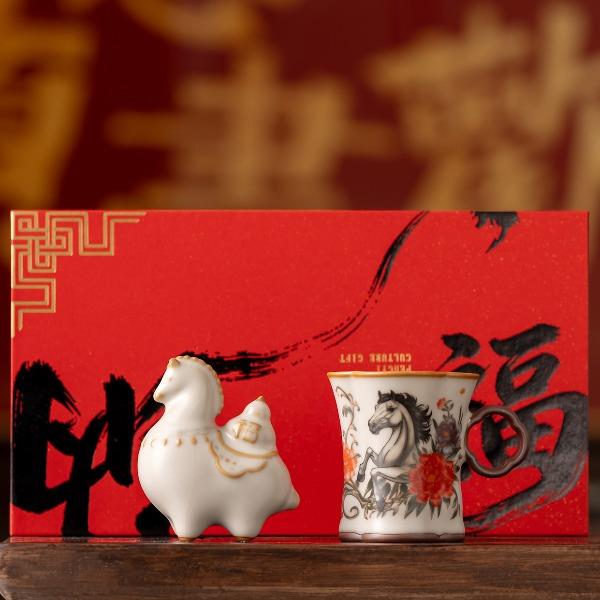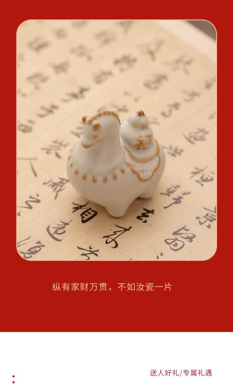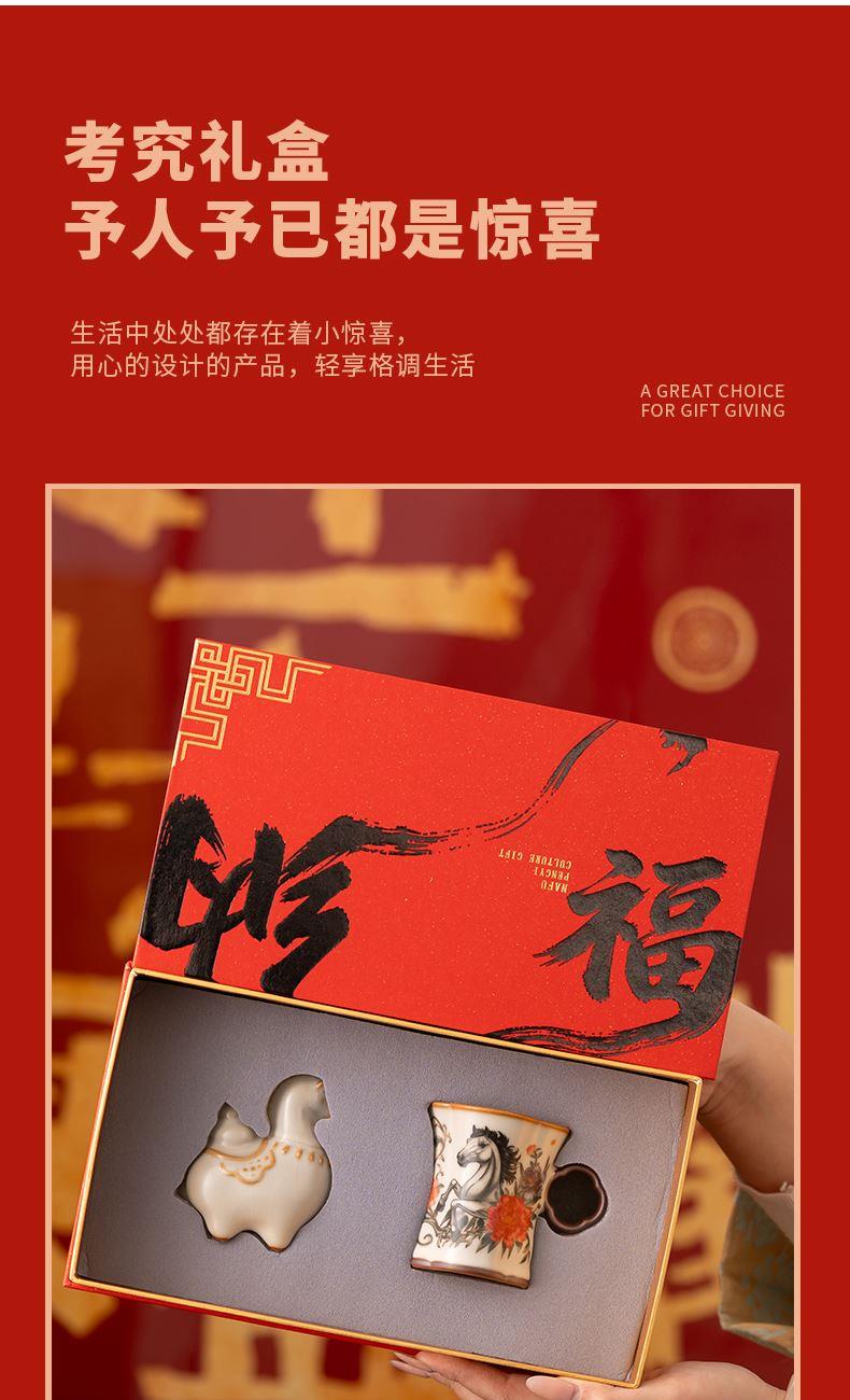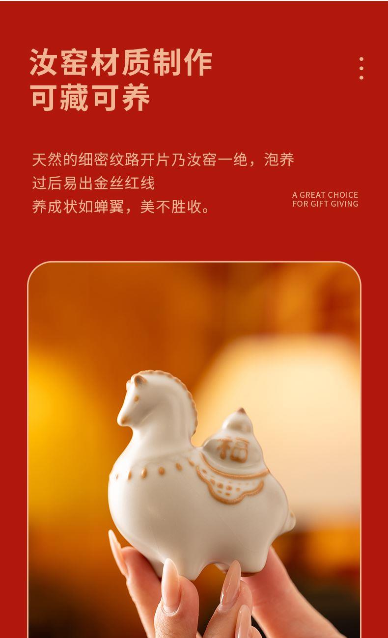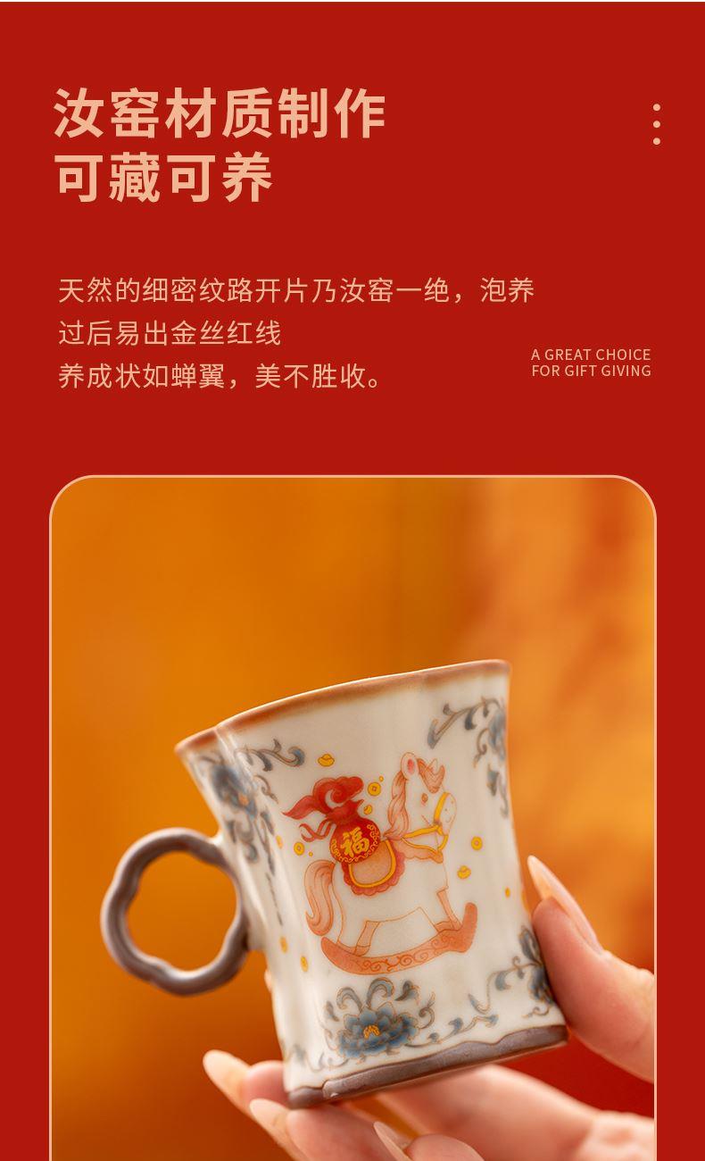 配 制:1杯 1摆件 1礼盒 手提袋 材质:汝黄瓷 规格:杯子 8.8*7.3cm 摆件9.3*7cm 容量:90ml 推荐说明:马上有钱,马到成功杯子摆件套装,马背上葫芦造型,寓意福禄。亚黄汝瓷,玛瑙入釉,蝉翼开片,家有千财万贯,不如汝窑一片。技术新品。画面堆料技术,富有立体浮雕质感,真实感强。杯身开片,可养瓷