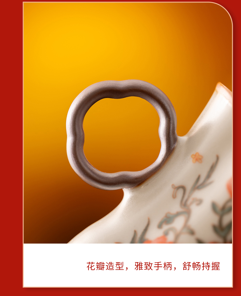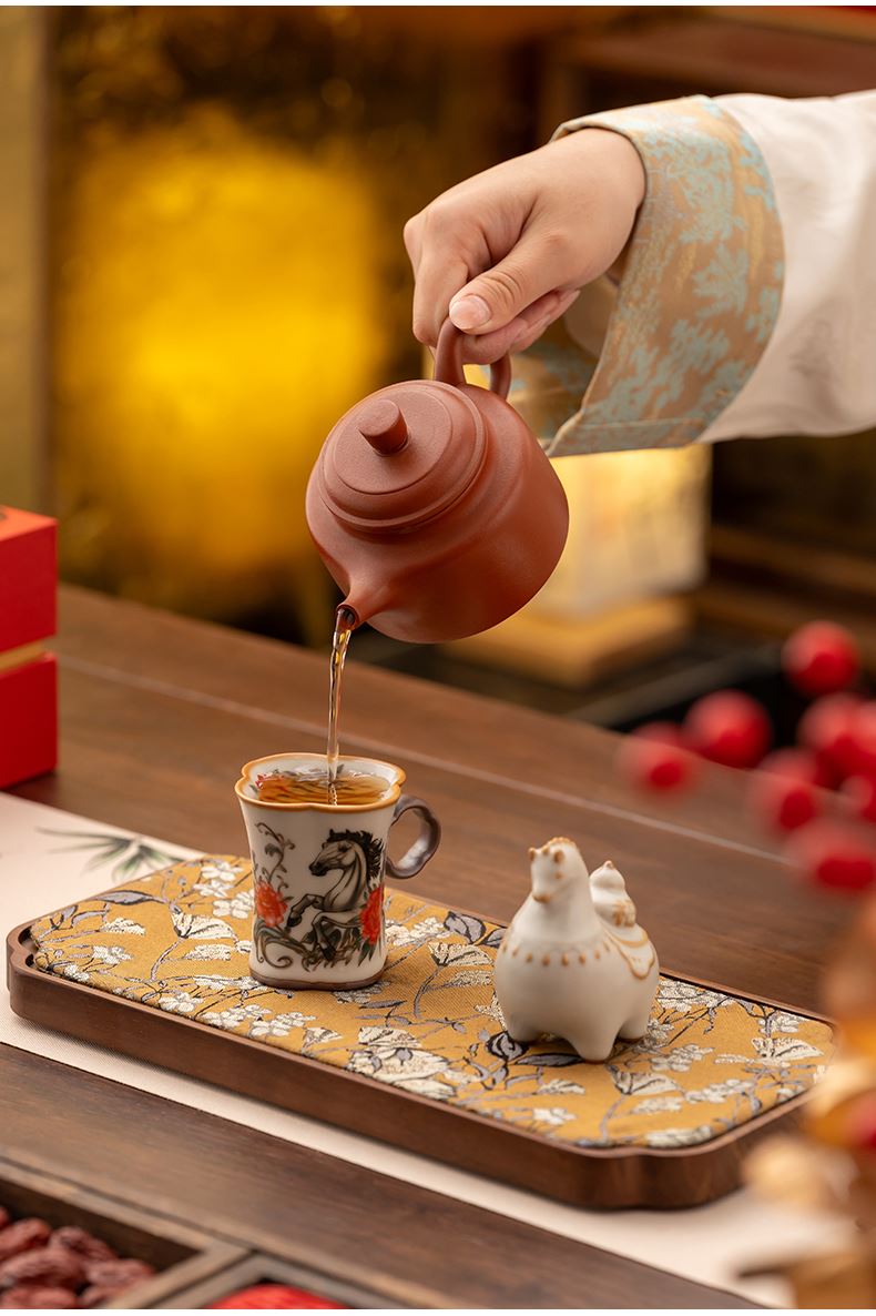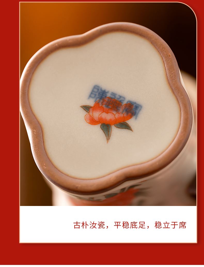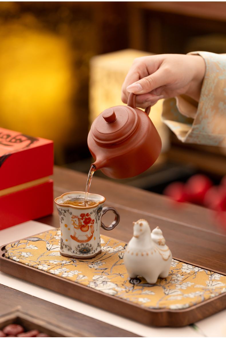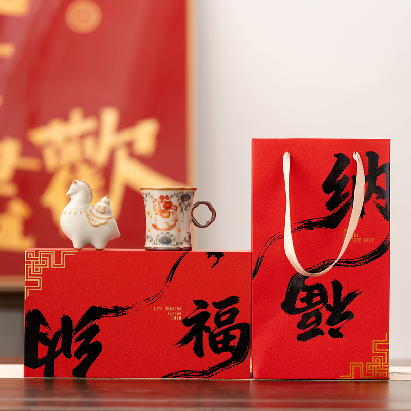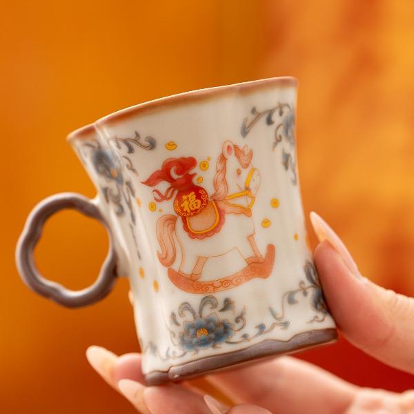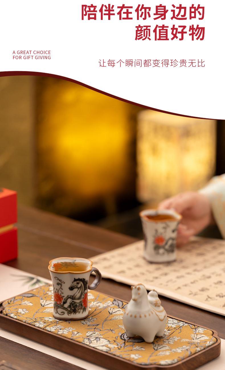 配 制:1杯 1摆件 1礼盒 手提袋 材质:汝黄瓷 规格:杯子 8.8*7.3cm 摆件9.3*7cm 容量:90ml 推荐说明:马上有钱,马到成功杯子摆件套装,马背上葫芦造型,寓意福禄。亚黄汝瓷,玛瑙入釉,蝉翼开片,家有千财万贯,不如汝窑一片。技术新品。画面堆料技术,富有立体浮雕质感,真实感强。杯身开片,可养瓷