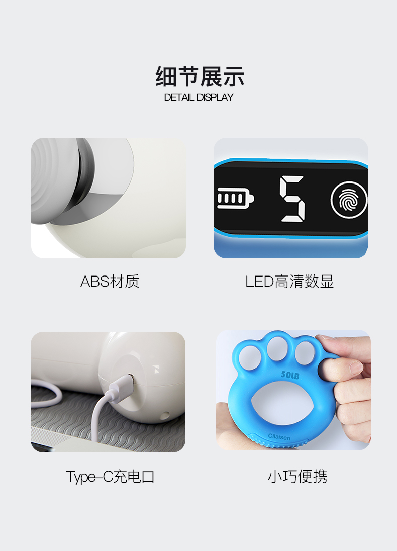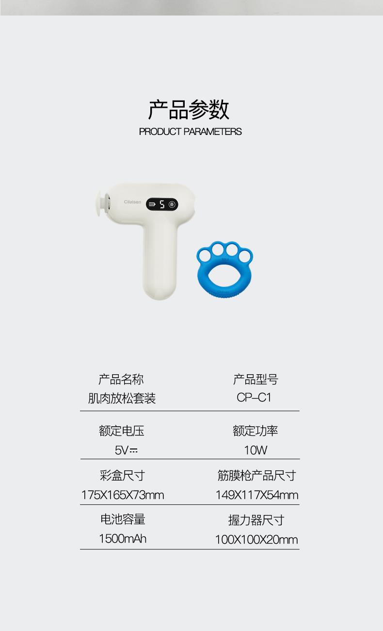 颜色:白色+蓝色 额定电压/功率:5V/10W 电池:1500mAh 握力器尺寸:100*100*20mm 筋膜枪尺寸:149*117*54mm 产品净重:0.71kg 包装清单:筋膜枪x1、握力器x1、充电线x1、说明书x1