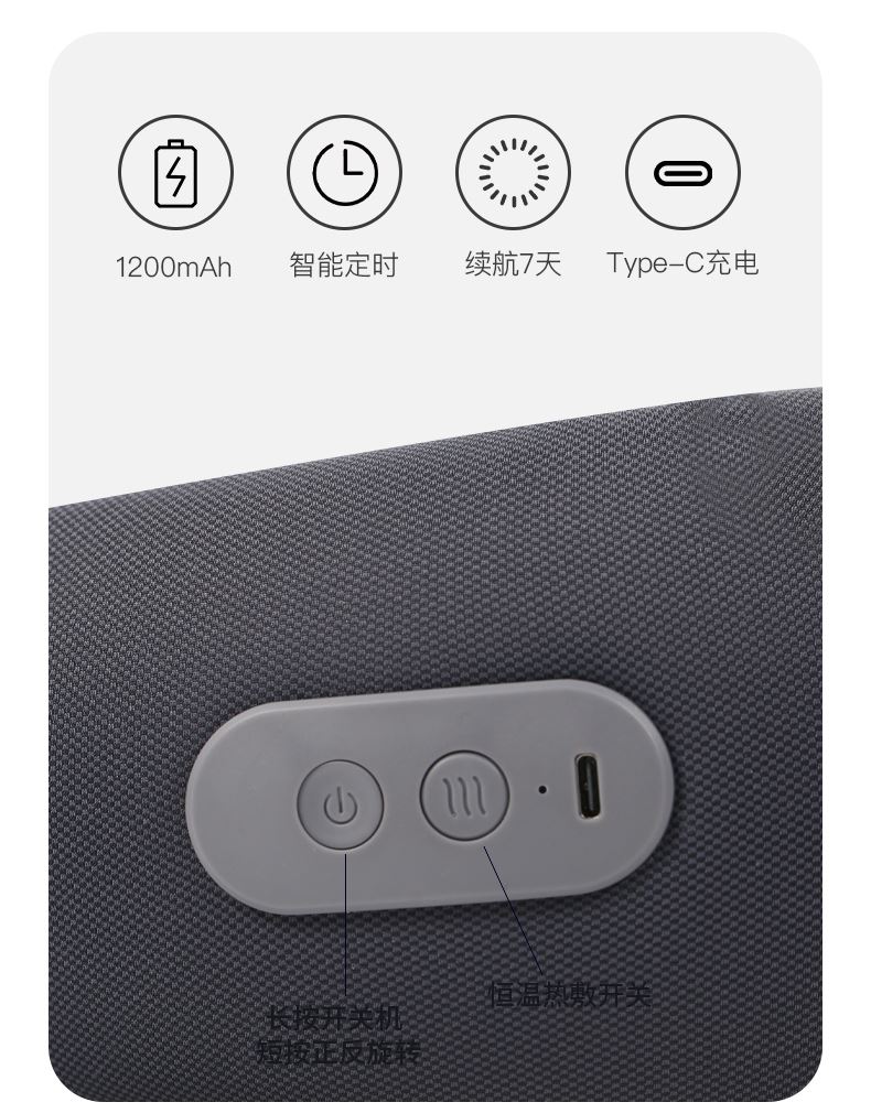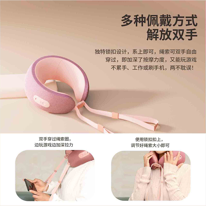 材质:瑜伽布料,回弹记忆棉 充电口:TypeC 产品尺寸:220*220*115mm 产品净重:500g 额定功率:3.7W 电池容量:1200mAh • 仿真人双头按摩手感 强电机高配 • 360°环颈支撑 高密度回弹记忆棉 • C口便携可充电 智能定时15分钟模式, • 恒温热敷功能可选 质保一年