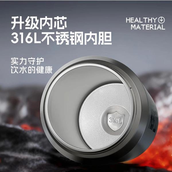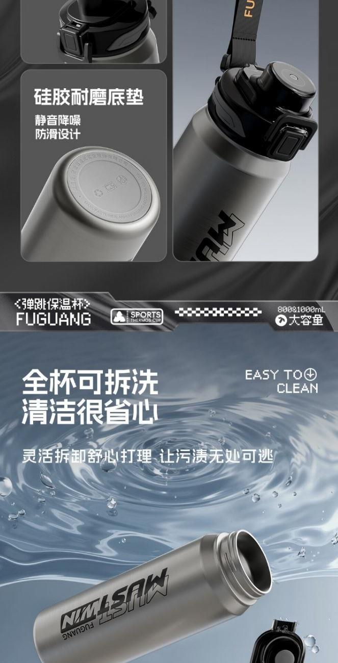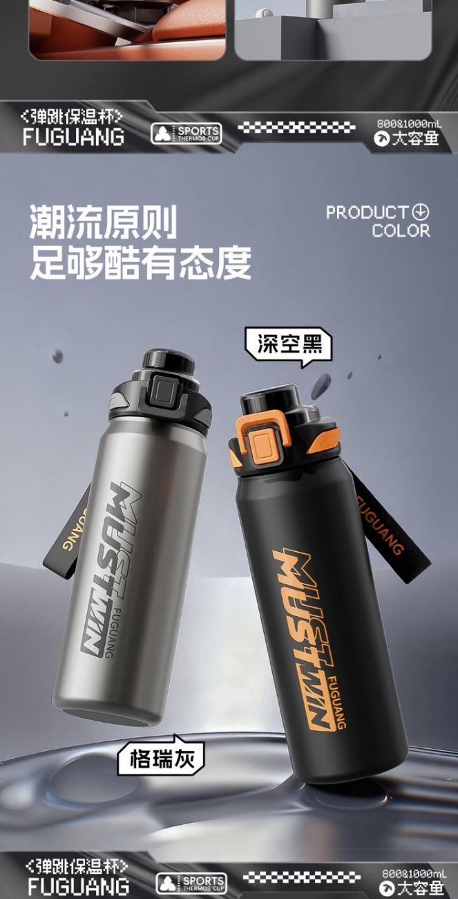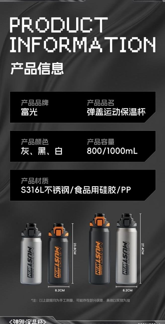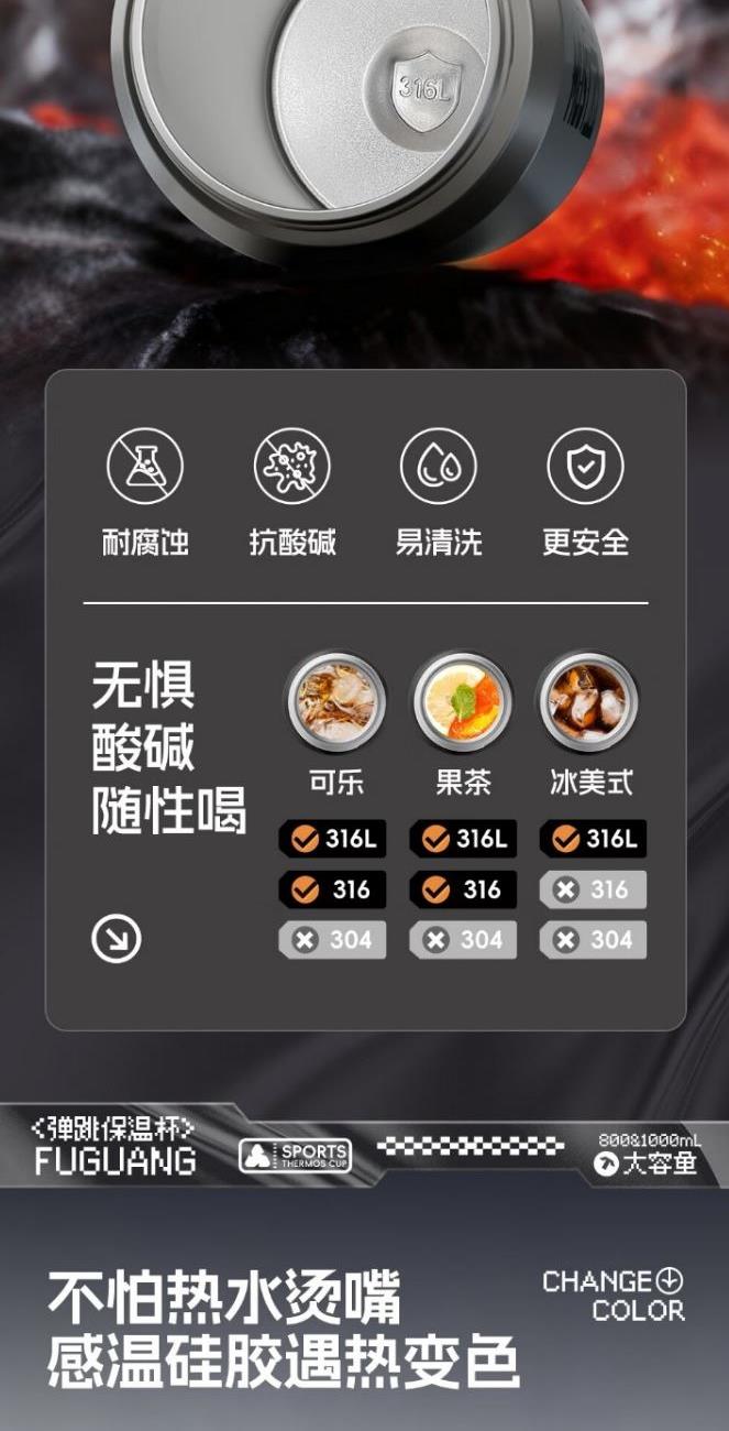 容量:800/1000ml 颜色:黑色灰本色 尺寸:82*238mm 材质:316L奥氏体不锈钢内胆、食品级PP,PC配件。 不怕热水烫嘴感温硅胶遇热变色。 食品级吸管设计柔软不上嘴,便携是手方便出行,硅胶耐磨底垫静音防滑设计。 包装:单瓦盒