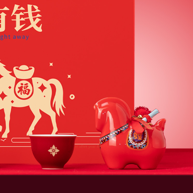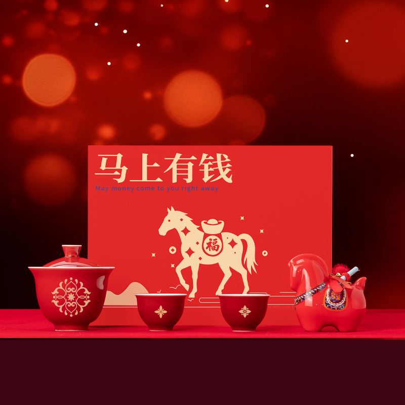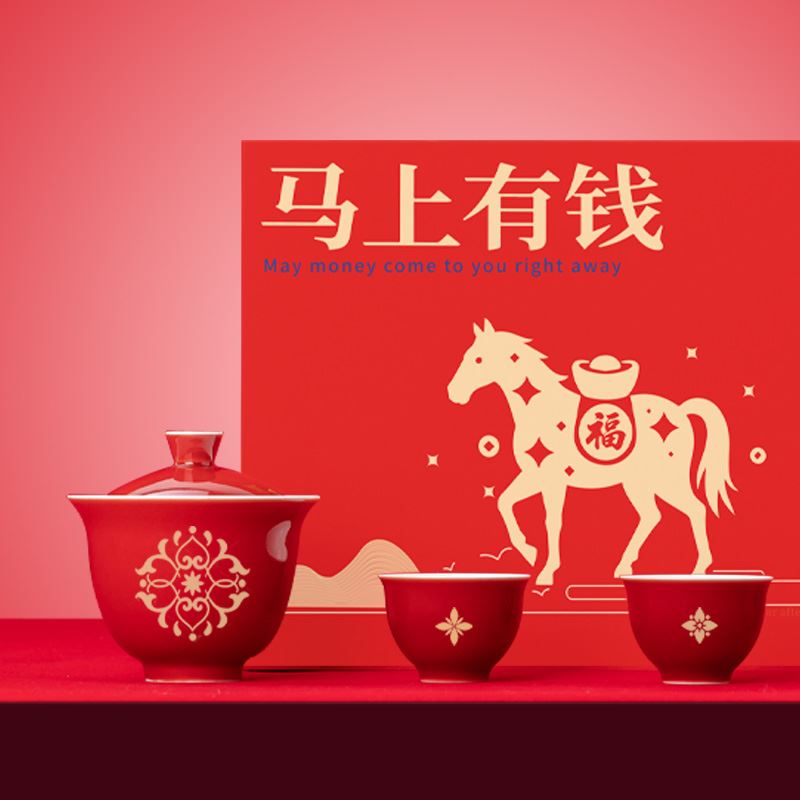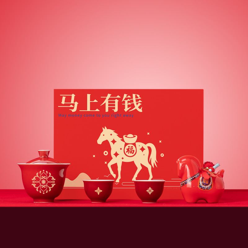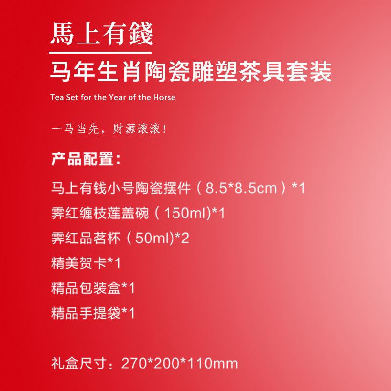 【产品配置】 马上有钱小号陶瓷摆件(8.5*8.5cm)*1 霁红缠枝莲盖碗(150ml)*1 霁红品茗杯(50ml)*2 精美贺卡*1 精品包装盒*1 精品手提袋*1 【产品说明】 马年生肖主题,“马上有钱”寓意招财,贺岁送礼佳选; 茶具+马摆件组合,品茶赏玩一器多能; 霁红缠枝莲纹饰,传统工艺有质感; 茶具+摆件+贺卡,礼品配置丰富又贴心; 马年开门红礼品,商务亲友馈赠心意之选。