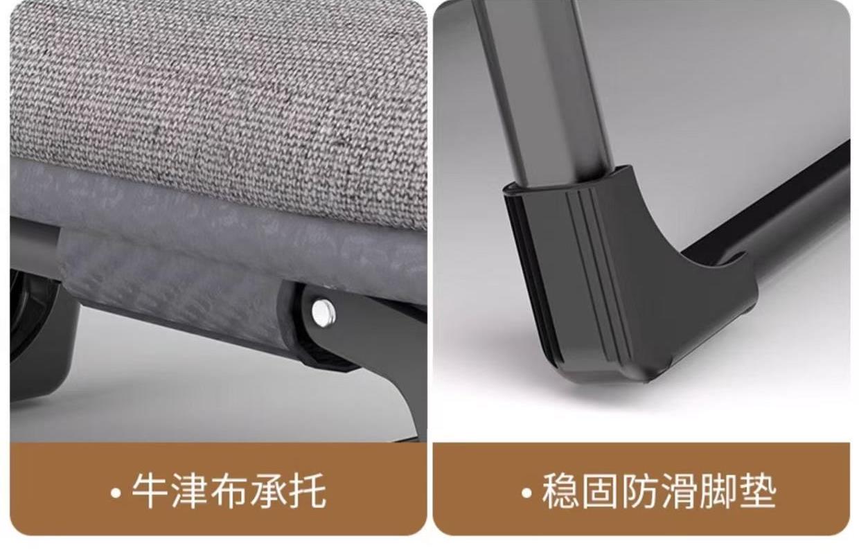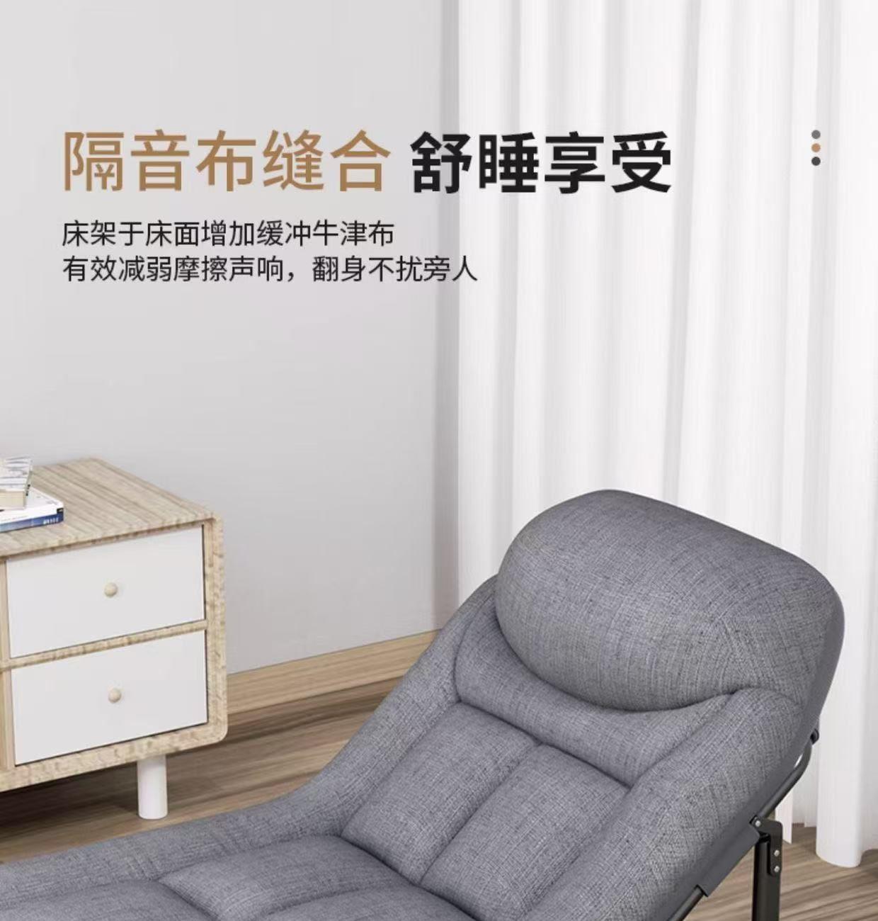 材质: 亲肤透气棉麻布 +防锈烤漆钢管 颜色:浅灰 规格:190*65*30cm 净重:6.5kg 承重:120-130kg 1、免安装,展开即用; 2、8脚支撑,承重更强更稳; 3、折叠收纳,不占空间 ; 4、亲肤棉麻布料,舒适透气; 5、6档可调节,带枕头,可睡可躺