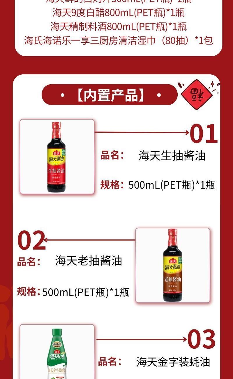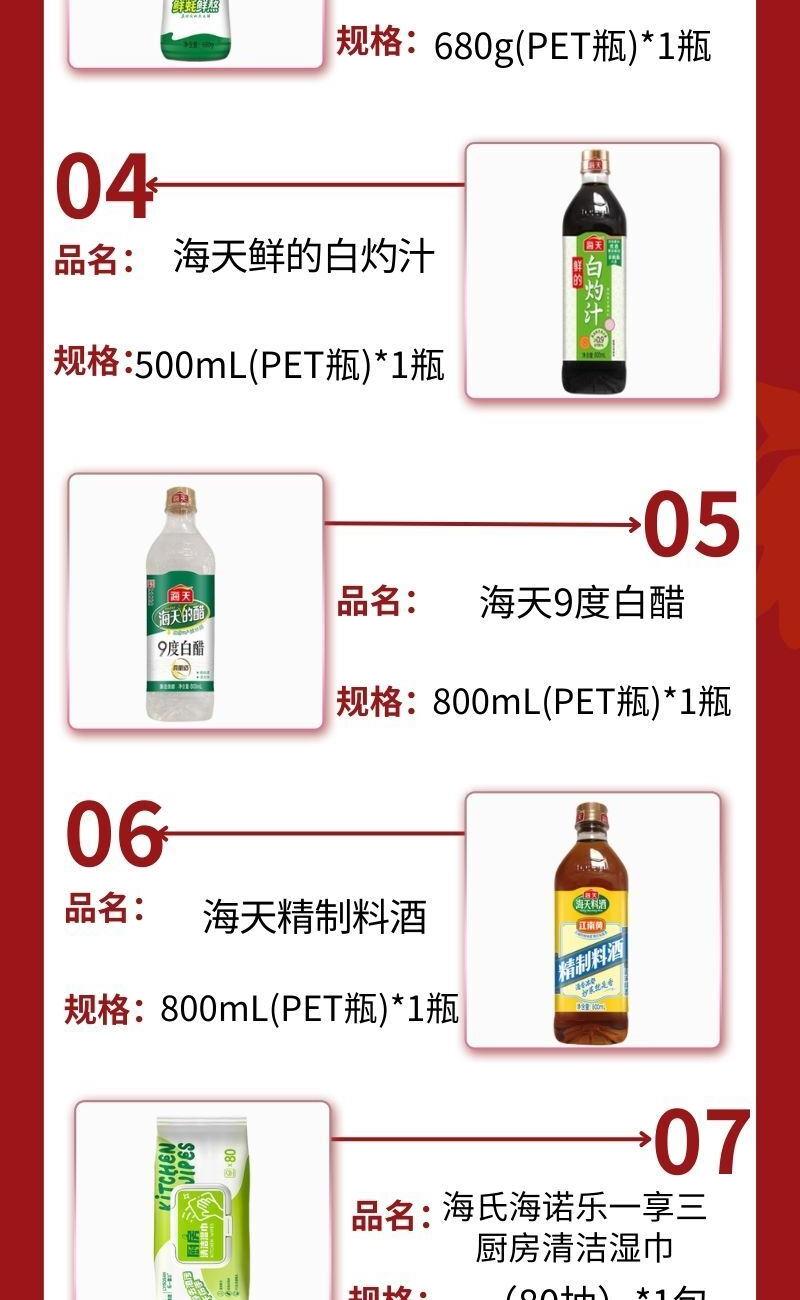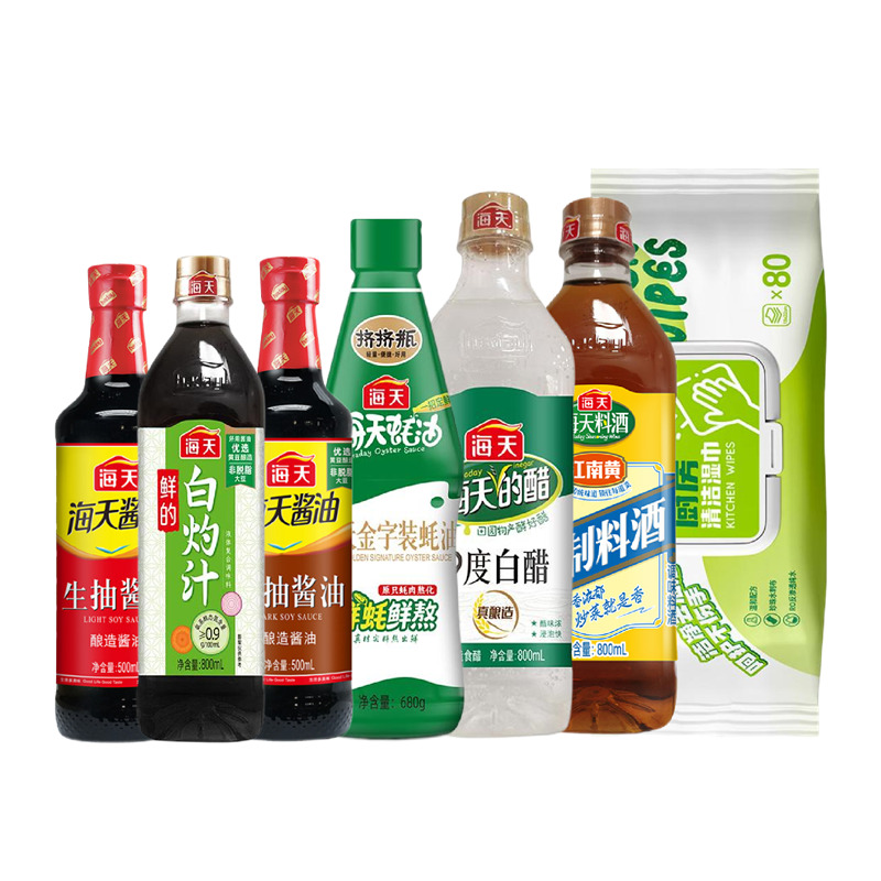 产品配置: 海天生抽酱油500mL(PET瓶)*1瓶 海天老抽酱油500mL(PET瓶)*1瓶 海天金字装蚝油680g(PET瓶)*1瓶 海天鲜的白灼汁500mL(PET瓶)*1瓶 海天9度白醋800mL(PET瓶)*1瓶 海天精制料酒800mL(PET瓶)*1瓶 海氏海诺乐一享三厨房清洁湿巾(80抽)*1包 卖点: 可选产品丰富多样,礼箱随心组合,多种价位因需而定,充分满足各种送礼需求,是商务送礼、单位福利的用心之选。