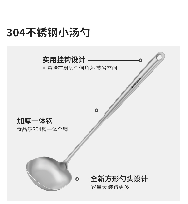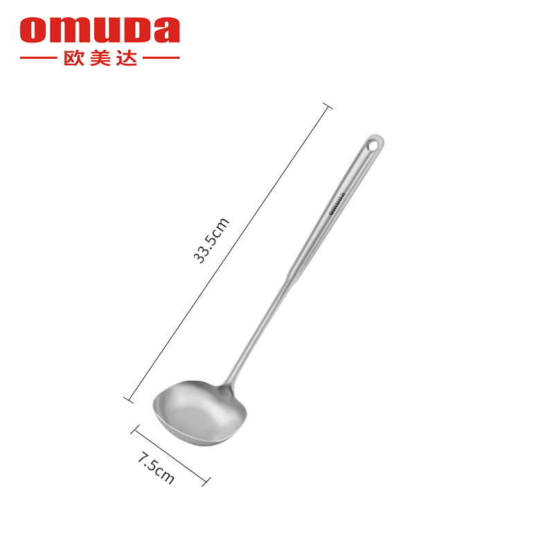 尺寸:33.5cm 材质:304不锈钢 净重:0.12kg ①采用优质304不锈钢材质,坚固耐用,人体工程学手柄设计,防热隔烫,手感更舒适 ②选砂光工艺处理,不易产生刮痕,圆筒状手柄便于抓握,带给您便捷的烹饪体验 ③整体不锈钢材质,易清洁,无卫生死角,耐腐蚀、安全卫生