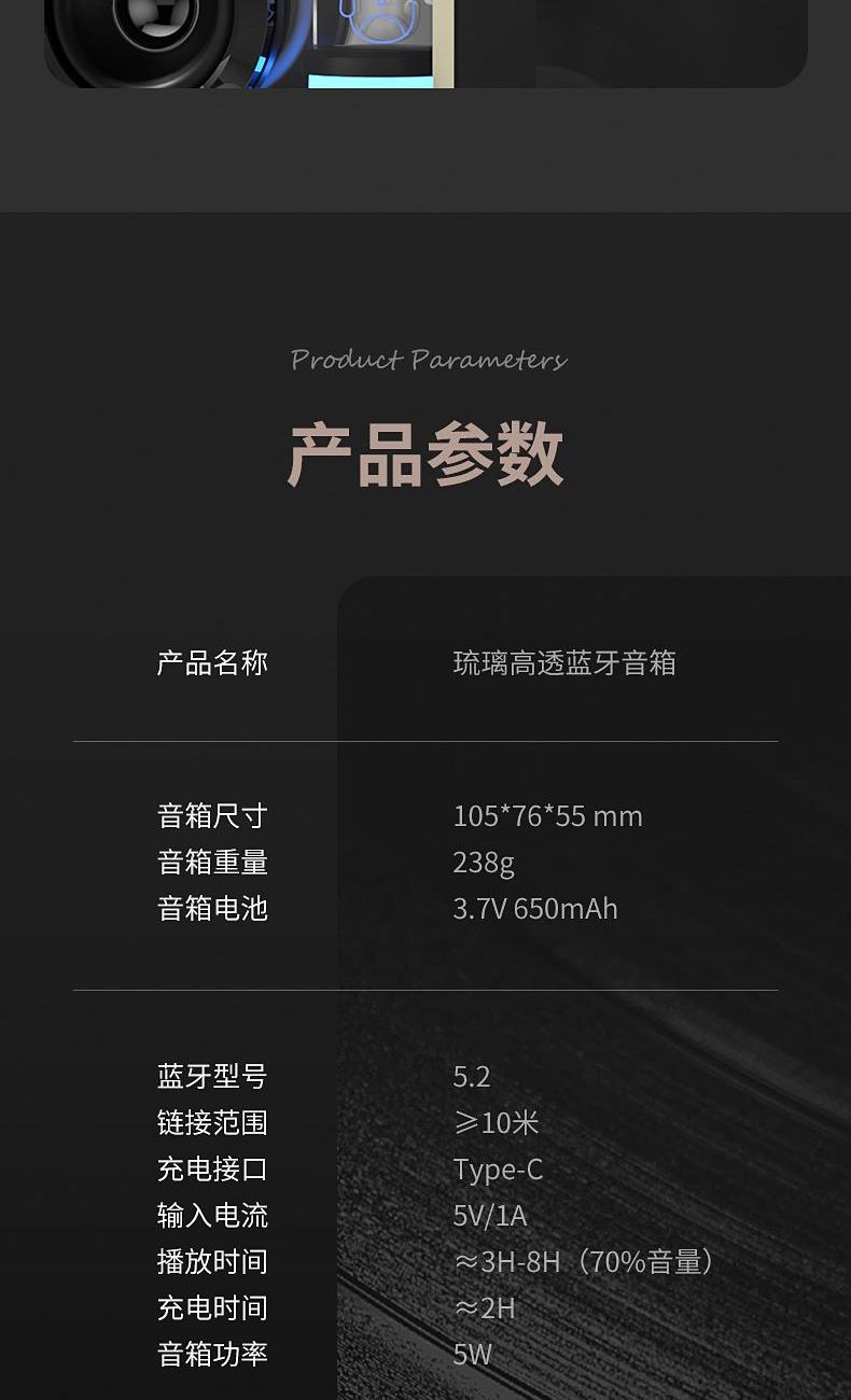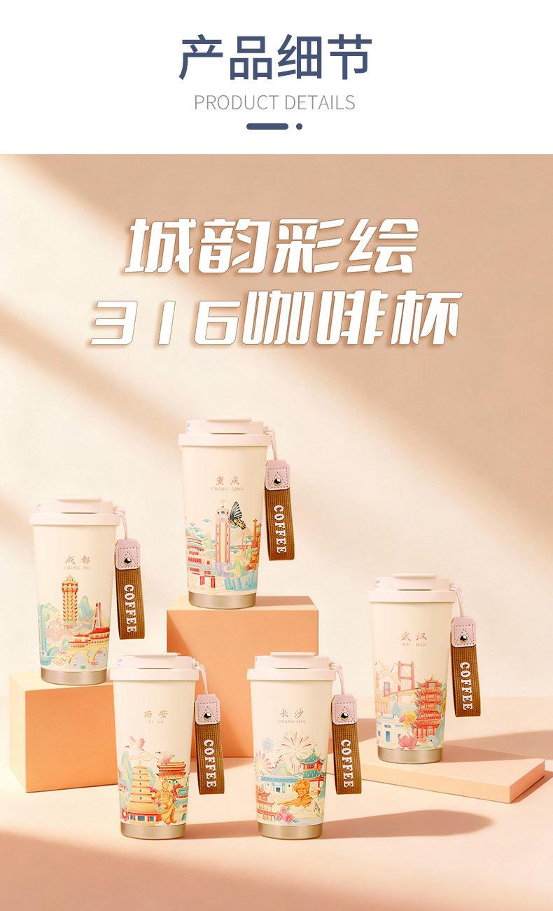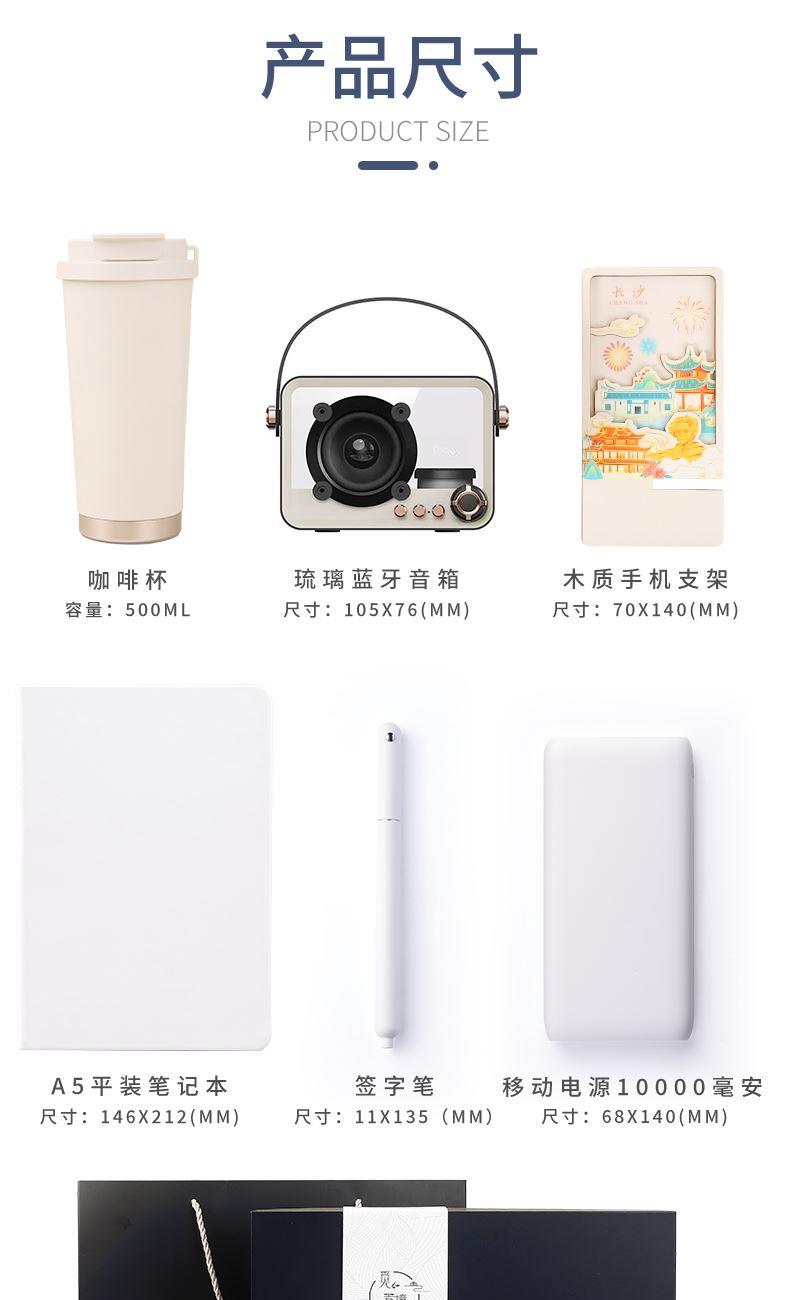 城市文创系列:成都、武汉、长沙、合肥、重庆、西安 1.觅芳境--双饮咖啡杯 容量:500ml 内胆:316 外壳:304 杯盖:食品级PP 吸管:食品级硅胶 吸嘴:食品级PP 密封圈:食品级硅胶 2.琉璃蓝牙音箱 蓝牙5.2方案,5W功率,续航6小时; 自由选择蓝牙 / TWS对联 / 插卡 / 等播放模式 3.手机支架 140*70*6MM 礼盒尺寸:340*255*100(MM) 手提袋尺寸:350*265*110(MM)