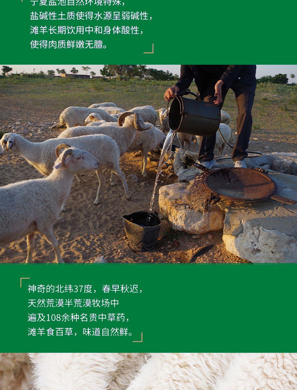 配置: 羊寸排 500g 羊后腿 500g 羊前腿 500g 羊腩块 500g 羊脖切片 500g*2 羊蝎子 500g*2 一方水土,养育一方特色滩羊盐池滩羊食百草 “吃中草药 (甘草、苦豆子)喝弱碱水"长大的羊。 中和体内酸性,使得肉质鲜嫩细腻,脂肪分布均匀原切滩羊羊肉不腥不膻。 宁夏盐池县 自然环境优异,气候冬长夏短 日照充足, 土地呈盐碱化,使得水源呈弱碱性, 盐池草原呈半沙漠化,其中含名贵中草药约110种左右 新鲜屠宰,保证肉质鲜美!