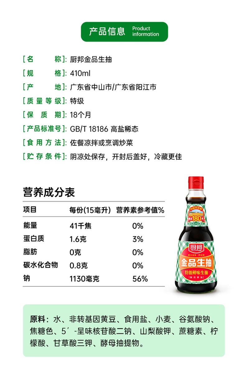 厨邦 金品生抽410ml*1 厨邦 特级老抽150ml*1 厨邦 9°米醋420ml*1 厨邦 原晒香黄豆酱210g*1 厨邦 芝麻浓香食用植物调和油150ml*1 厨邦 多一点美味礼盒*1