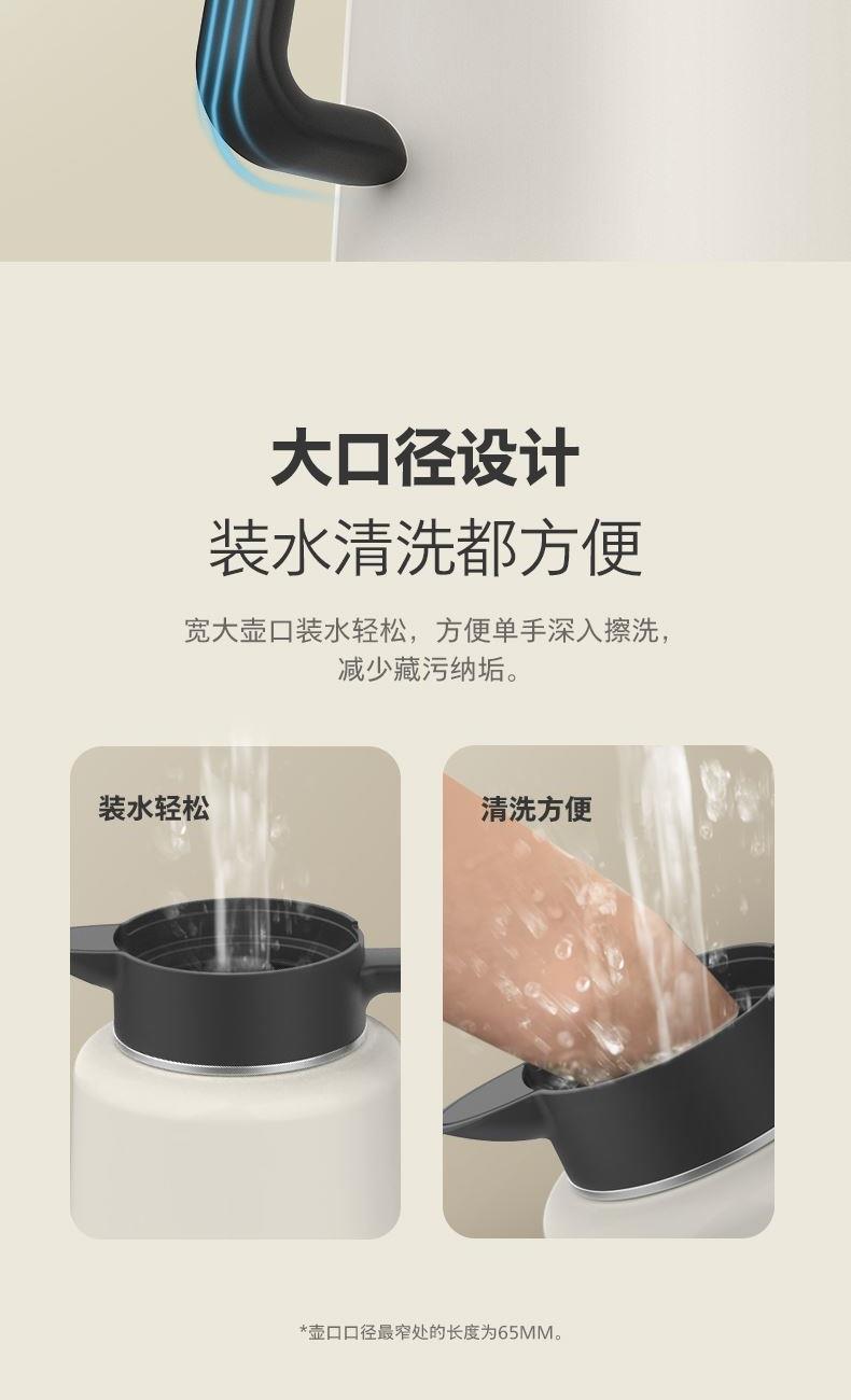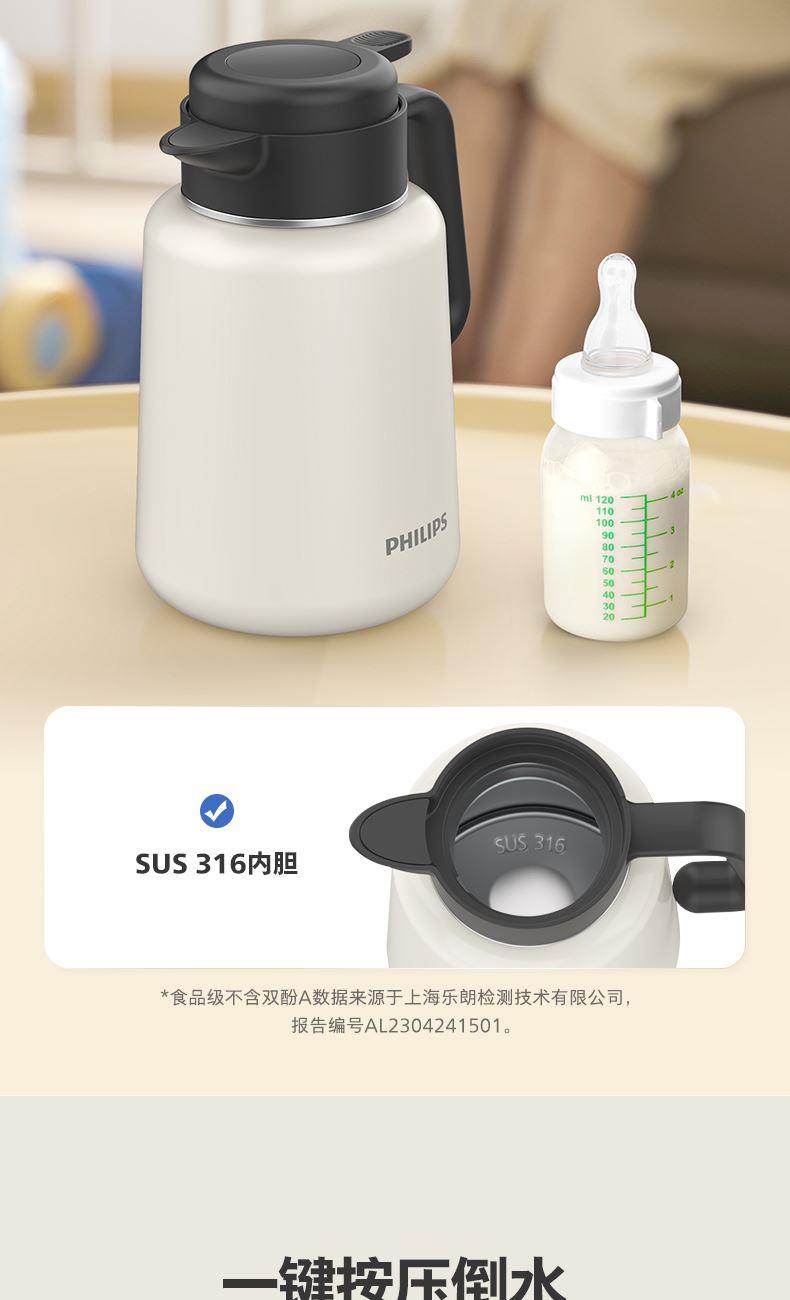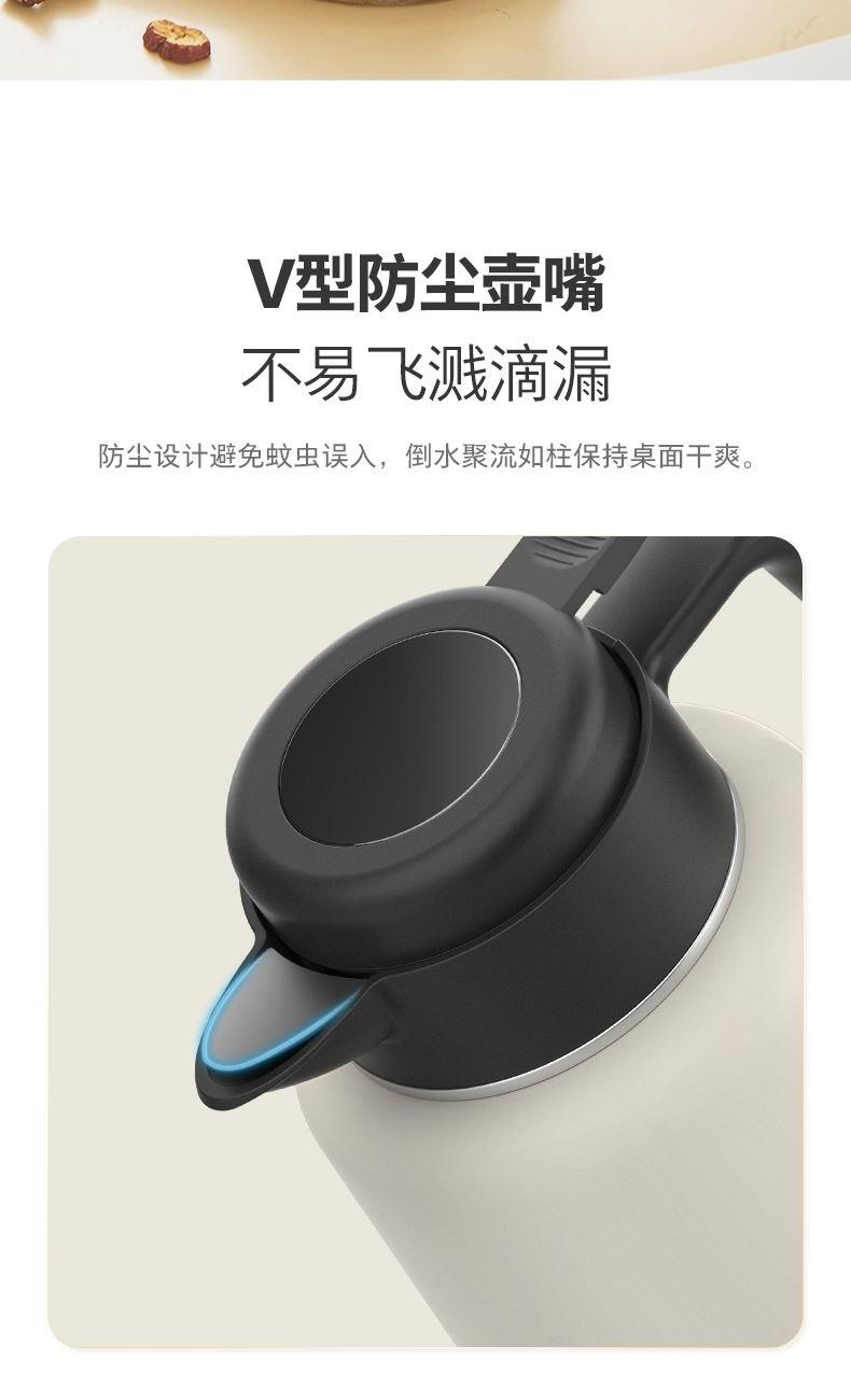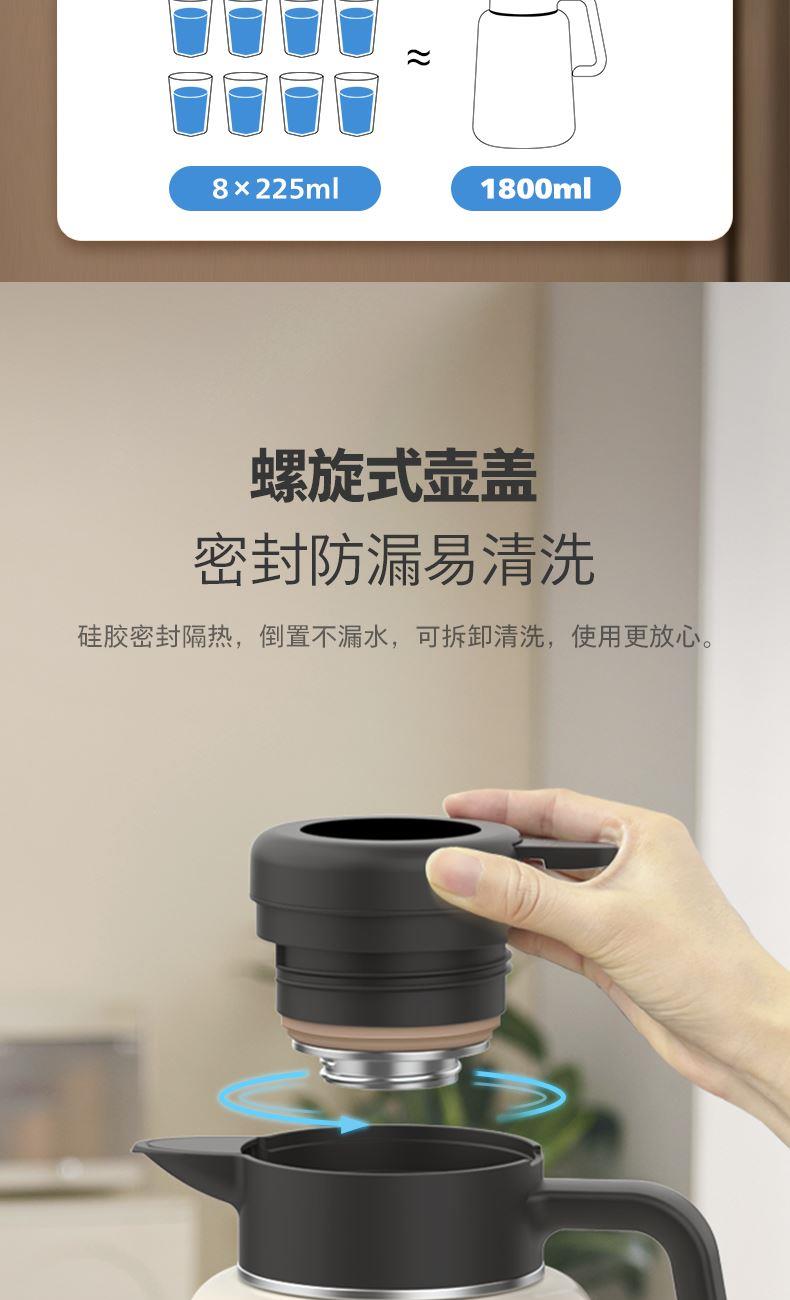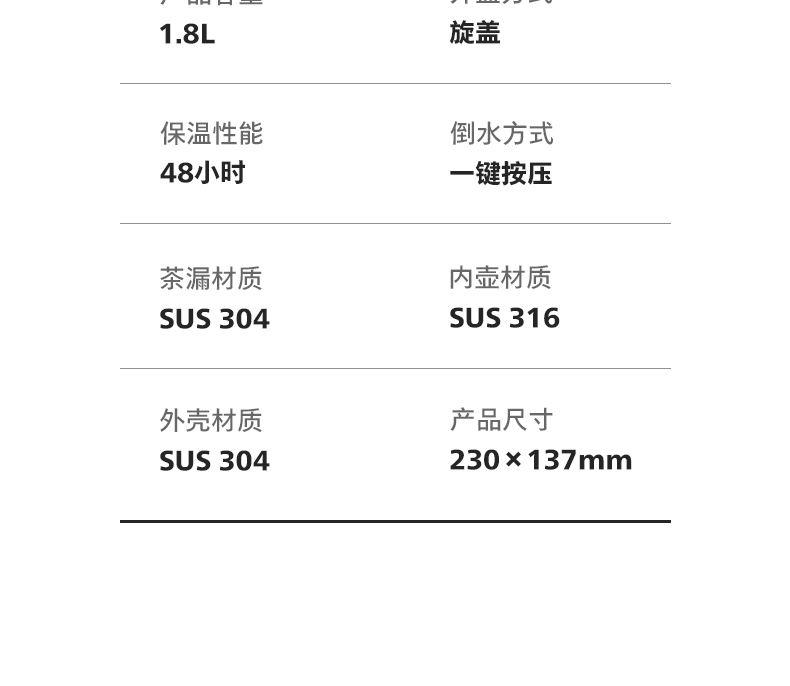 容量:1.8L 内胆316不锈钢,外胆304不锈钢 V型防尘壶嘴 按压倒水,大口径设计