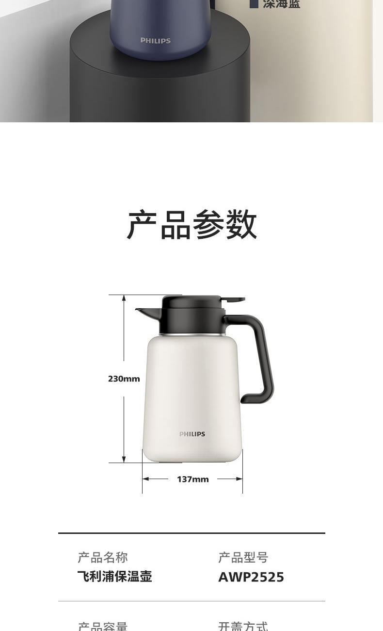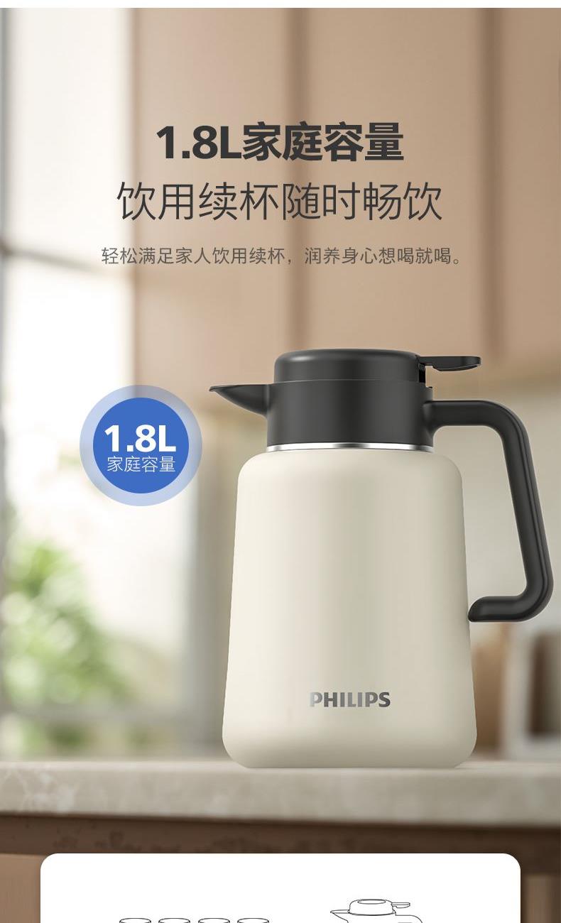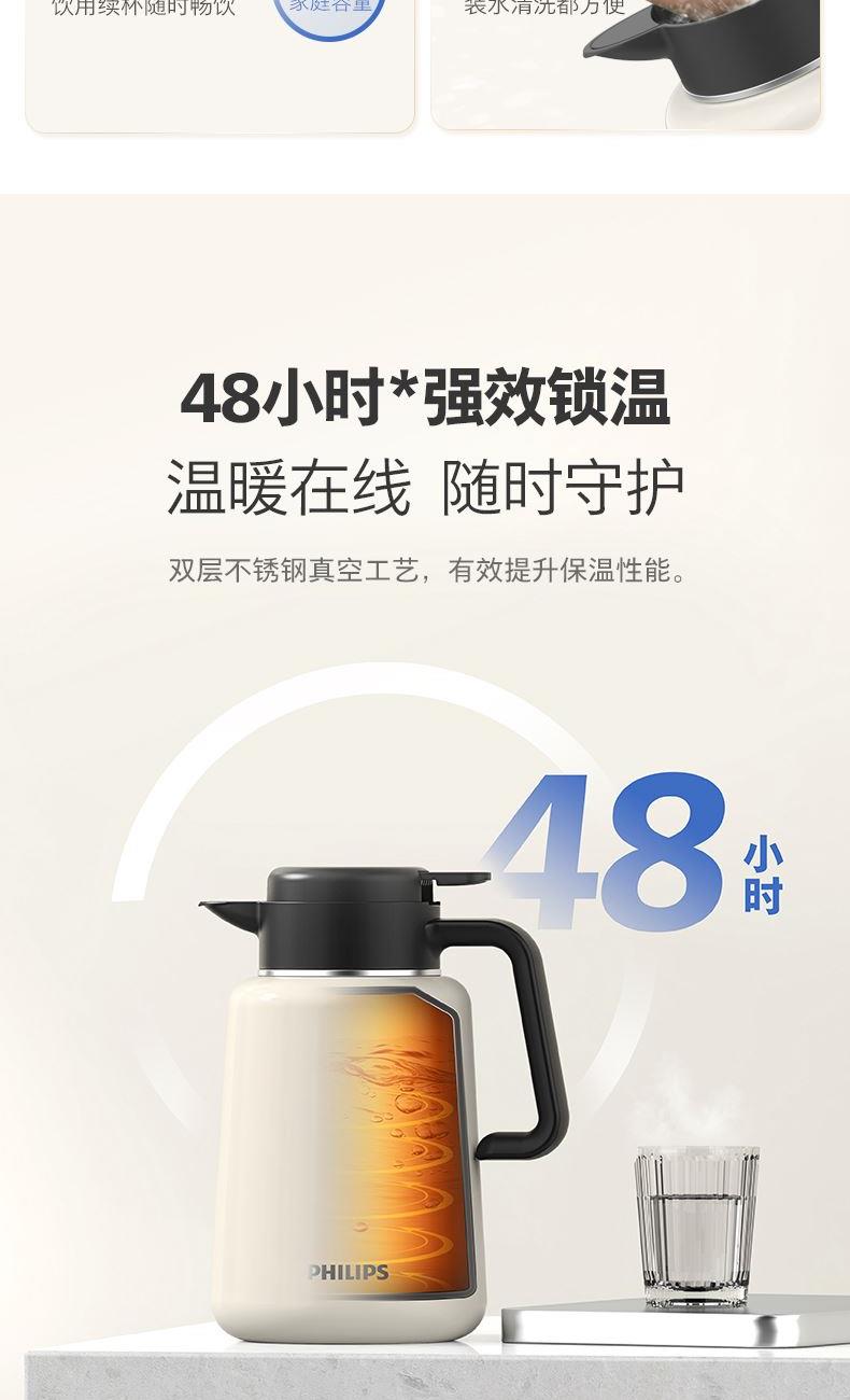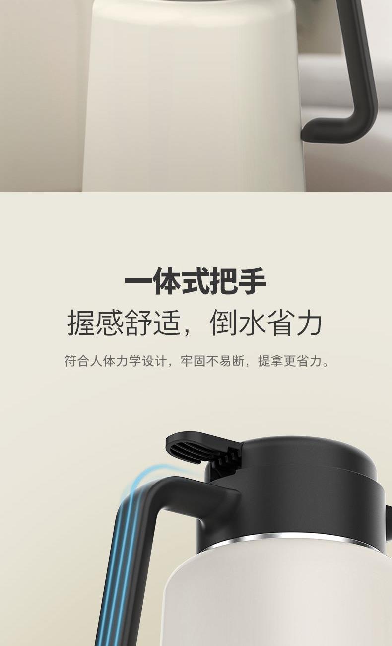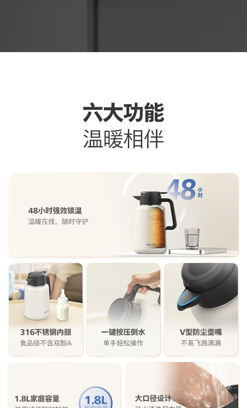容量:1.8L 内胆316不锈钢,外胆304不锈钢 V型防尘壶嘴 按压倒水,大口径设计