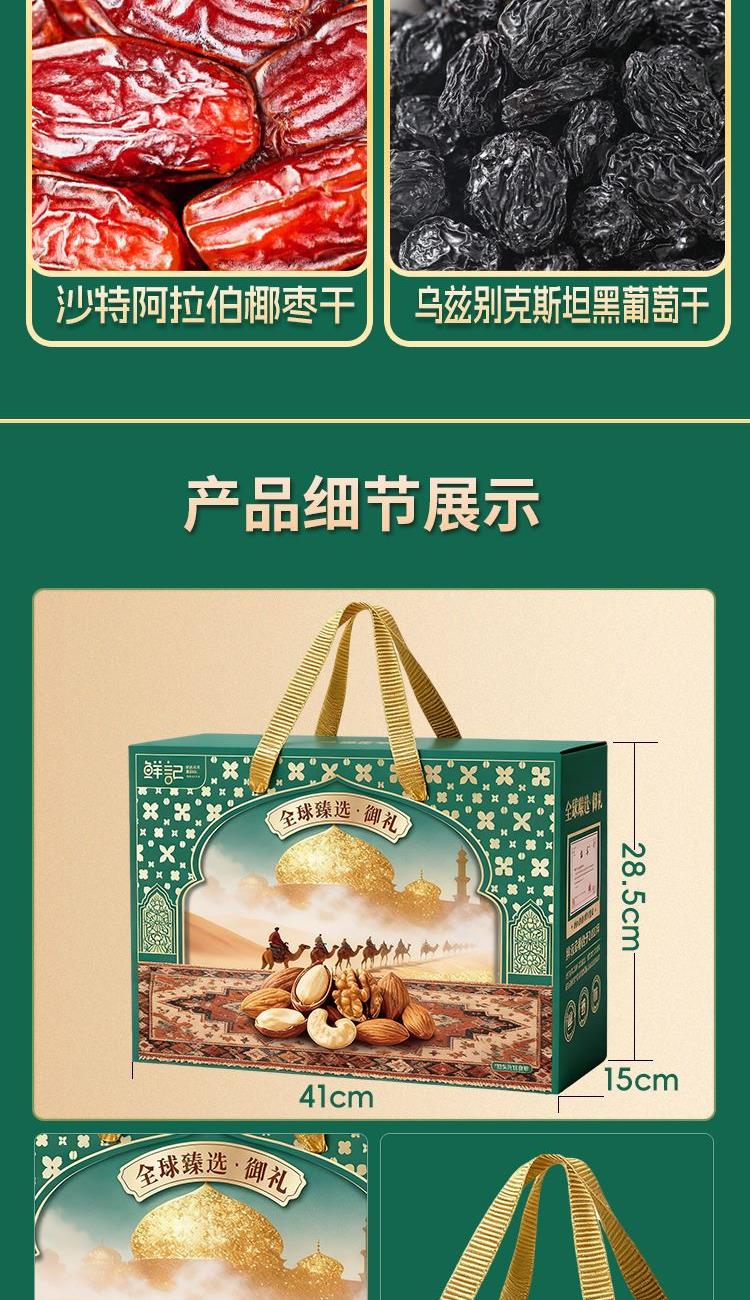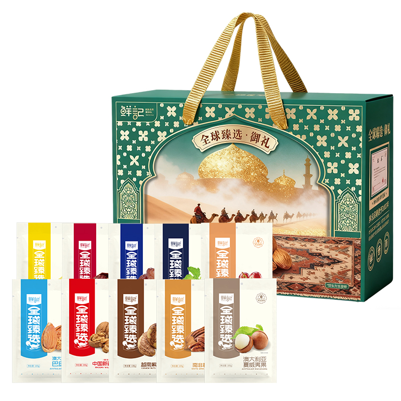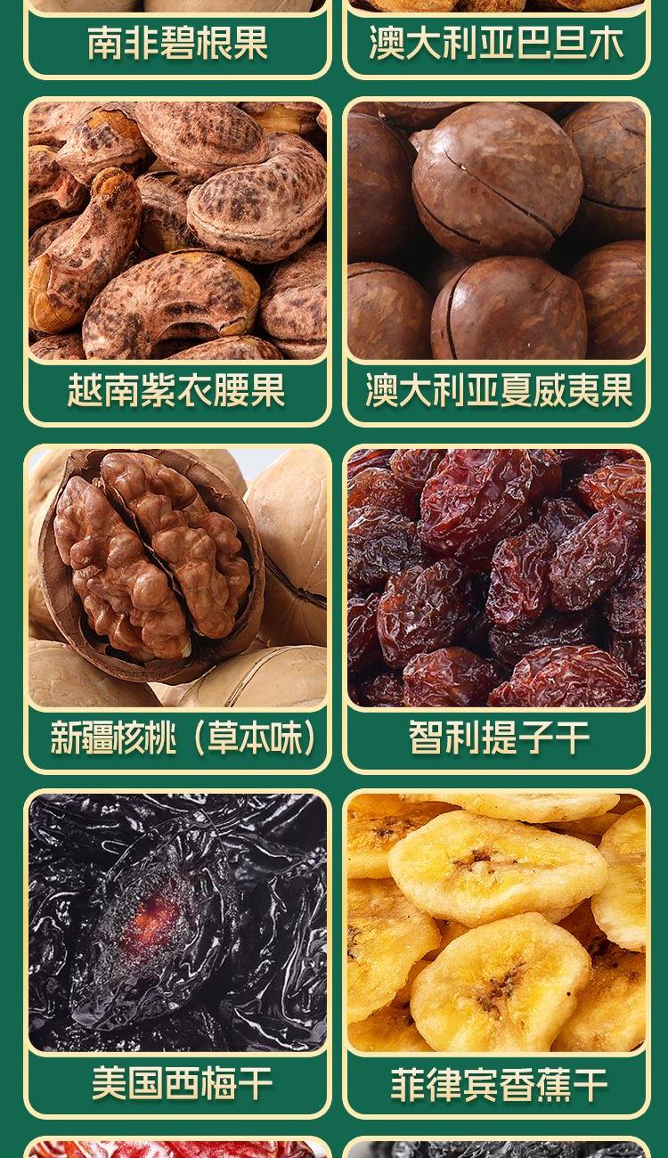 南非碧根果100g 澳大利亚巴旦木100g 越南紫衣腰果100g 澳大利亚夏威夷果100g 中国新疆核桃(草本味)200g 智利提子干200g 美国西梅干280g 菲律宾香蕉干300g 沙特阿拉伯椰枣300g 乌兹别克黑加仑干200g