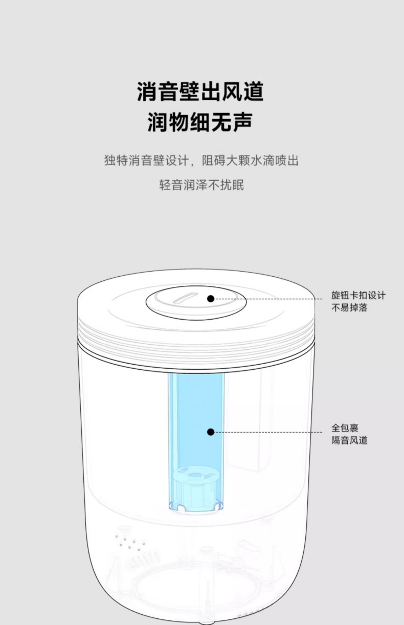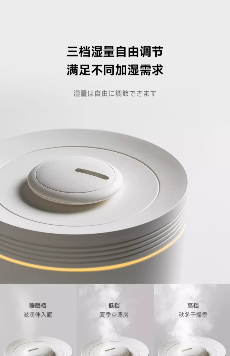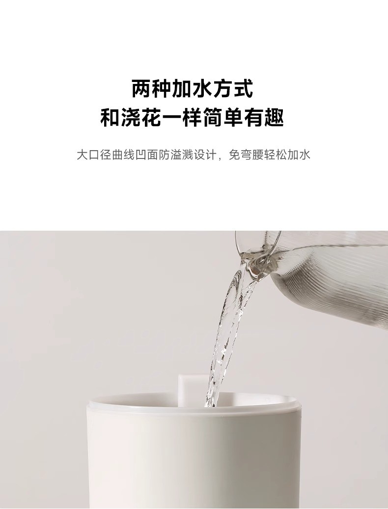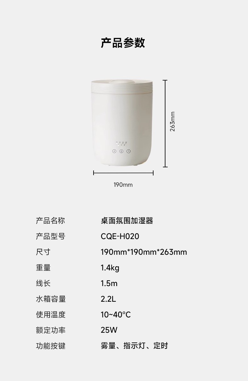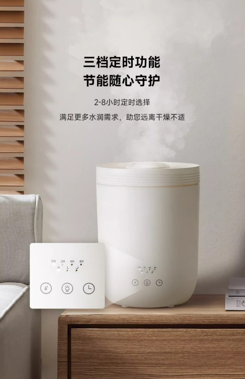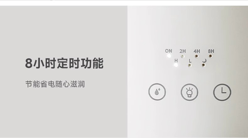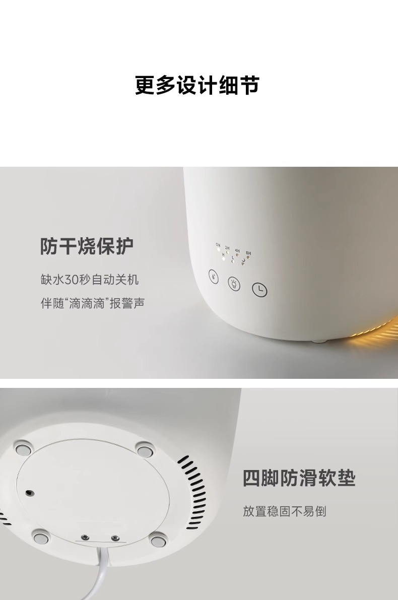 重量:1.4kg 线长:1.5 水箱容量:3L 使用温度:10-40℃ 额定功率:28W 功能按钮:雾量、指示灯、定时 8小时长效加湿,三档大雾量滋润 360°周身环绕呼吸灯效 独特消音壁设计,轻音润泽不扰眠 三档湿量自由调节,满足不同加湿需求 防干烧设计,使用更安全