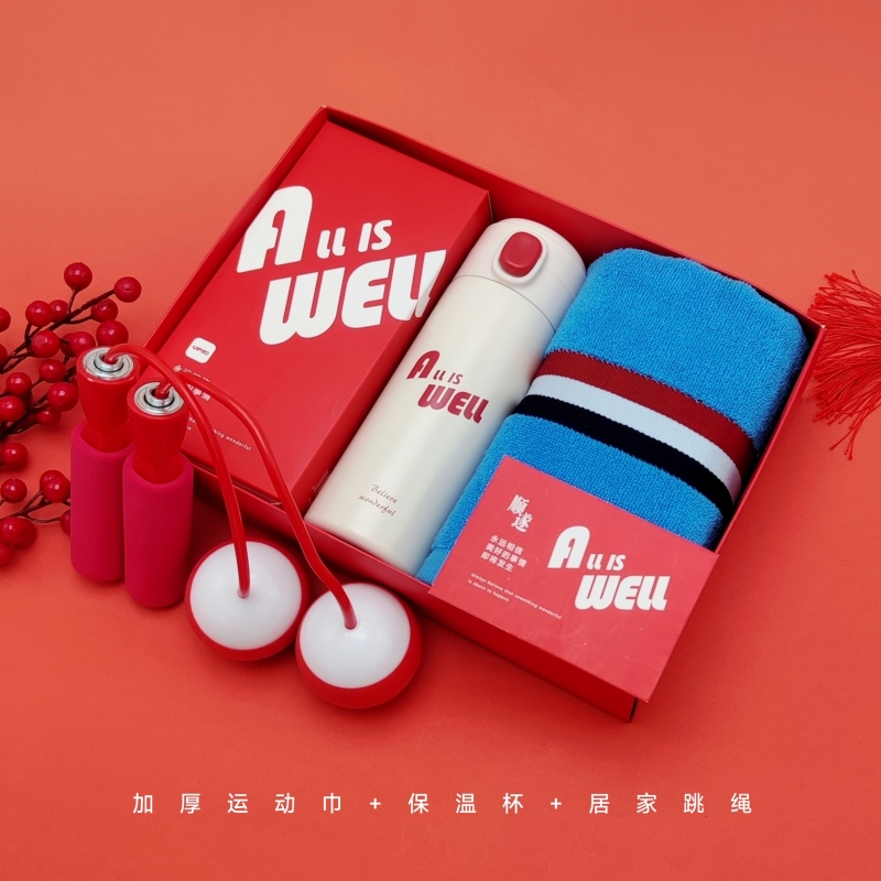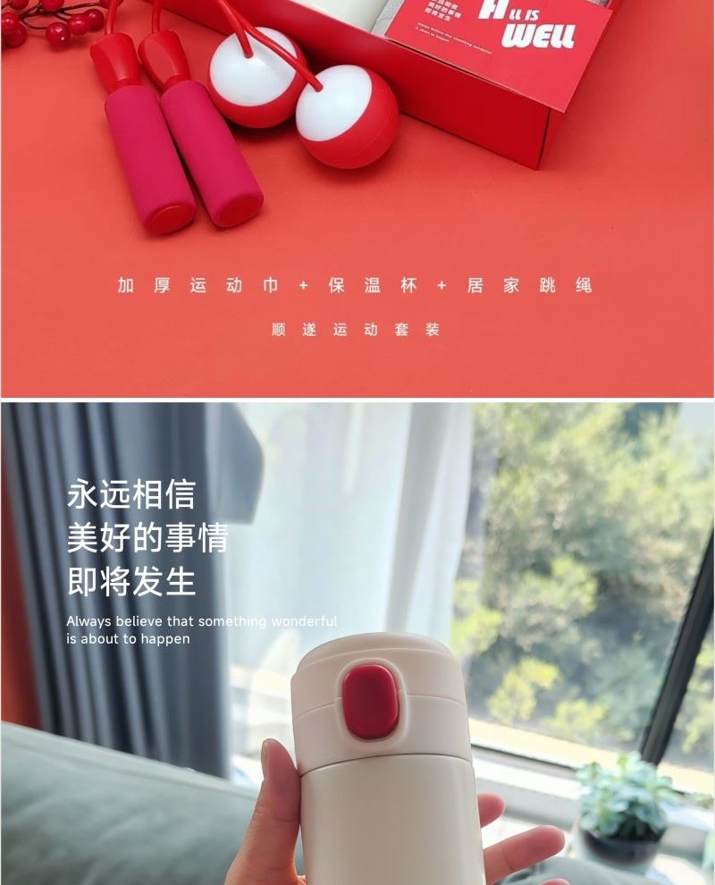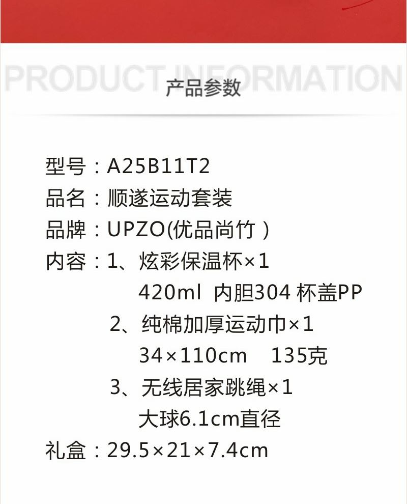 型号: A25B11T2 产品内容 1、纯棉加厚运动巾×1 克重135克 34*110CM 2、无线居家跳绳×1 大球6.1CM 直径 软胶球面设计 3、炫彩保温杯 420毫升容量 内胆304 杯盖PP 外盒:29.5×21×7.4cm 天地盖+拎袋 居家无线跳绳 采用大号球体 软胶设计 模拟真实跳绳感受 420毫升高颜值保温杯 304内胆 精美设计文案 加厚运动巾 采用精梳棉材质 英伦设计风格 加厚设计 大规格 更实用