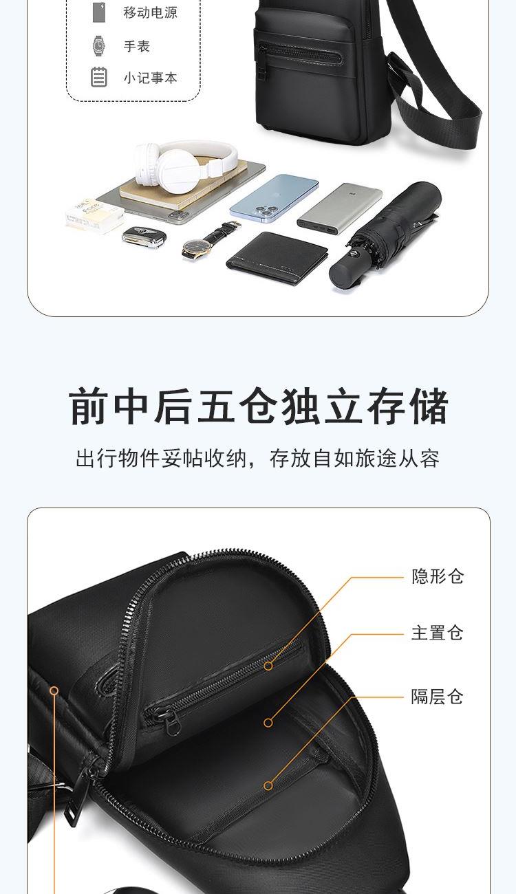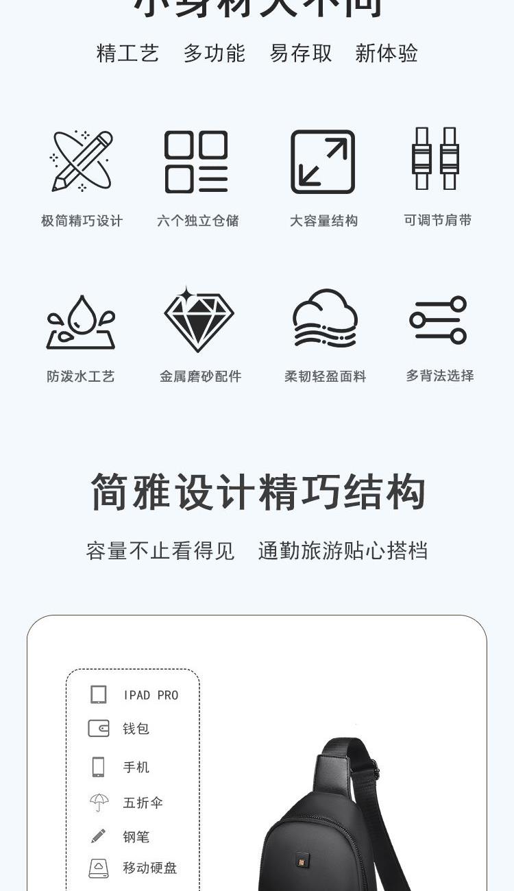 1、简雅设计精巧结构,通勤旅游贴心搭档 2、小身材蕴含大容量,随行物品轻松收纳 3、布料结实防水耐磨,打理方便使用简捷 4、外二内三独立收纳,分类储物高效存取 5、单肩+后背+前背+可调肩带,多种背法自由选择 6、金属拉片+高密拉链+可调肩带,品质看得见匠心品质