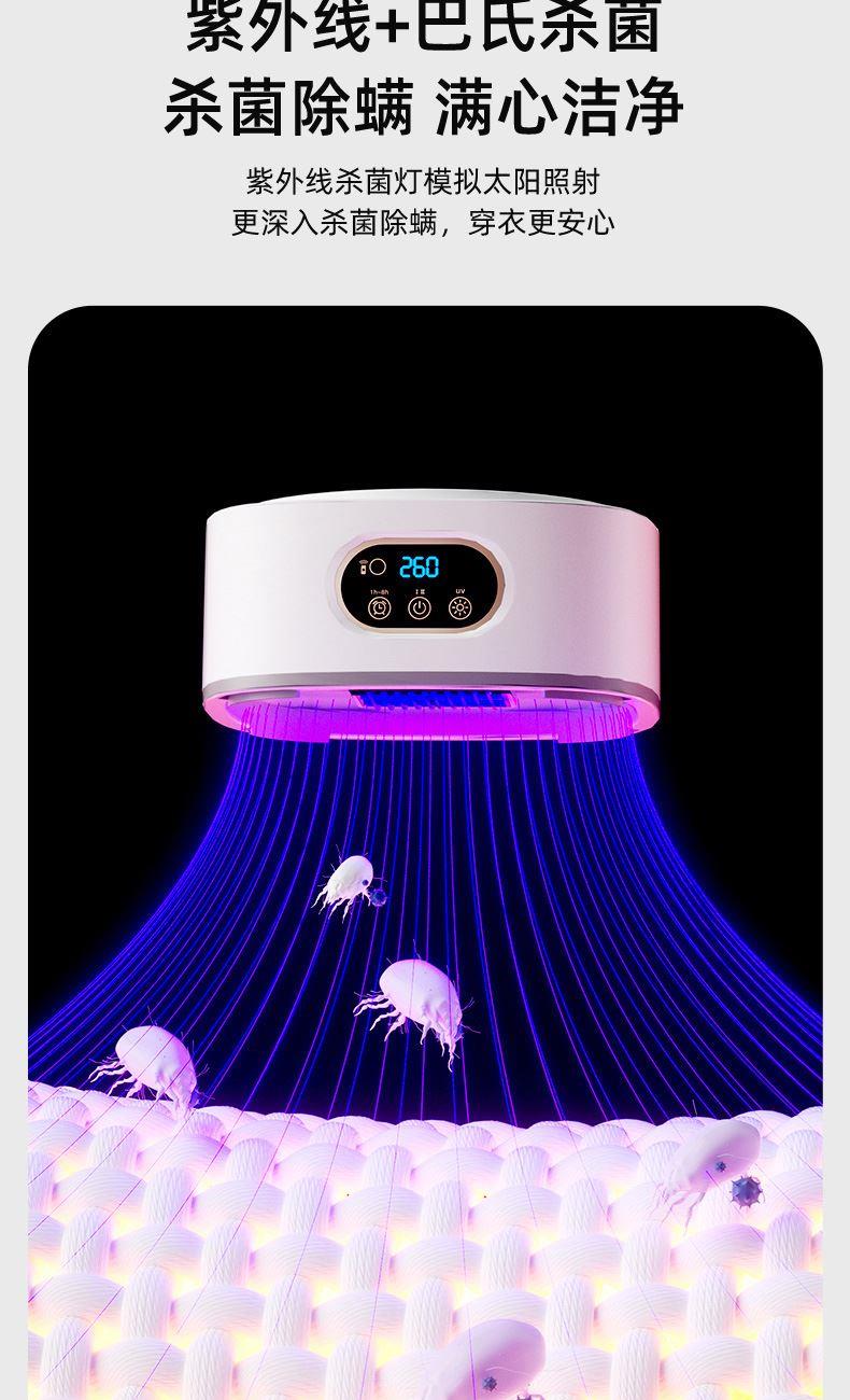 产品:UV灯遥控烘衣机 承载重量:5-10kg 发热温度:68°C左右 功能:UV灯消毒 加热方式:PTC;档位:2档 挂钩材质:304不锈钢 额定频率:50HZ 额定电压:220V 功率:501W(含)-1000W(含) 定时范围:1-8小时;控制方式:触控按键、遥控器 产品重量:净重1.2kg/泡重1.6kg 单台包装尺寸:25.2*23.2*12cm