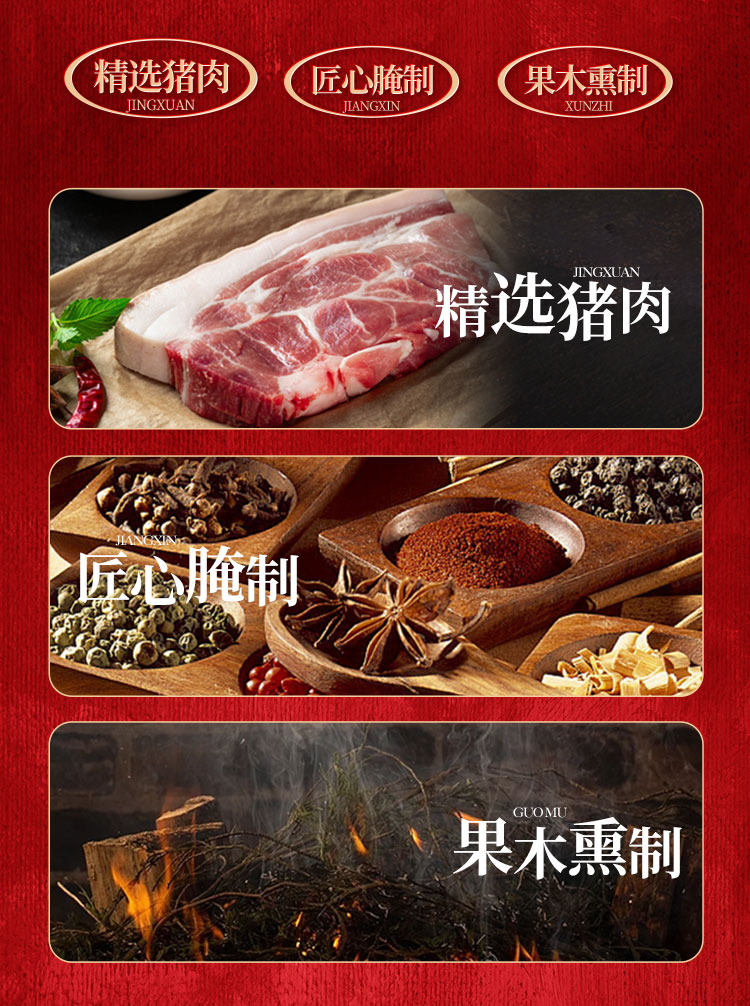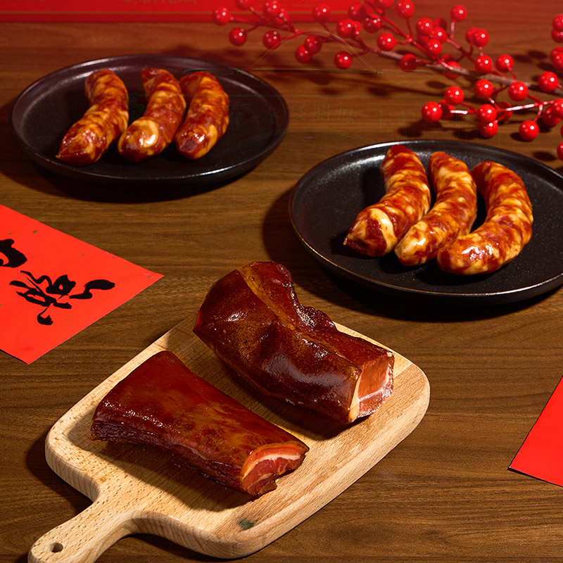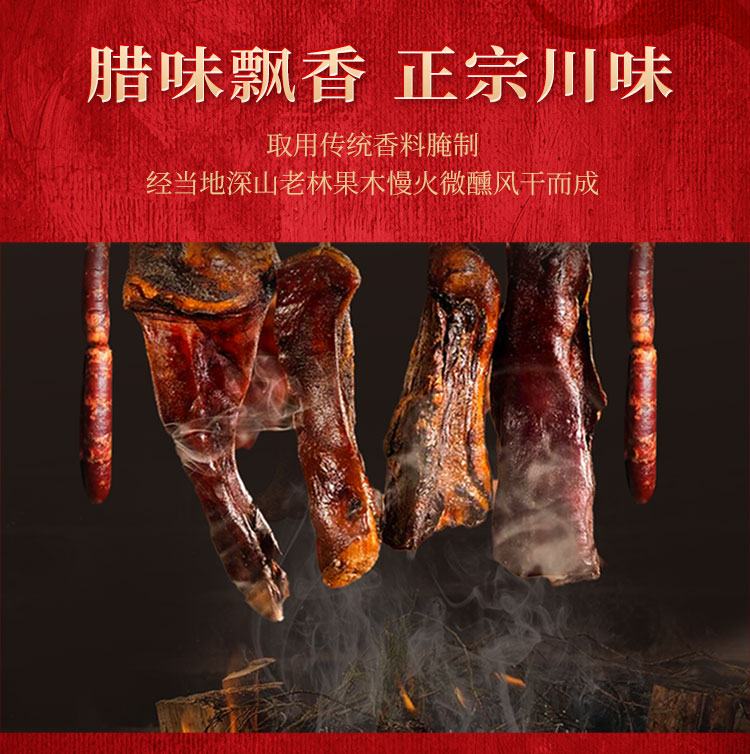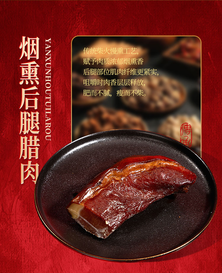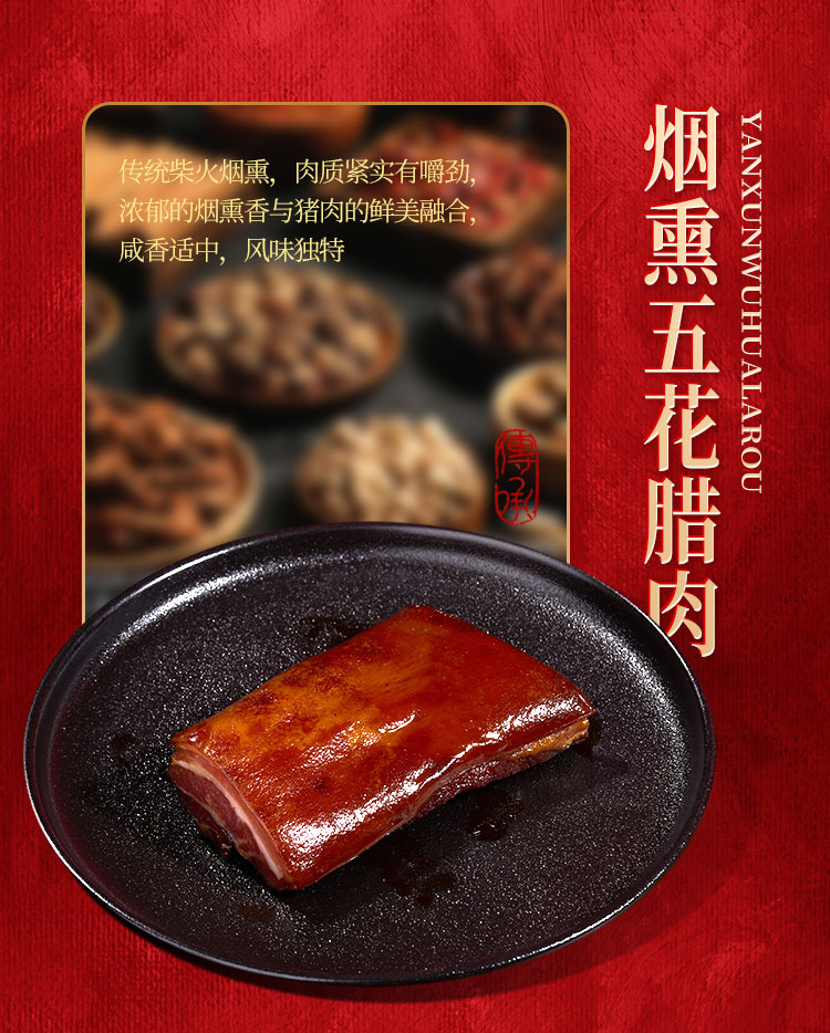 烟熏后腿腊肉200g 烟熏五花腊肉200g 麻辣香肠200g 香辣香肠200g