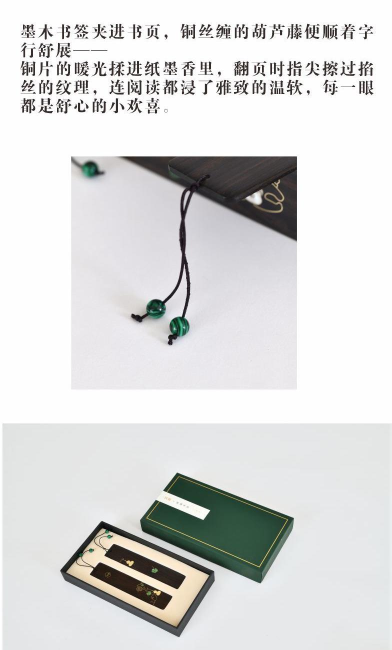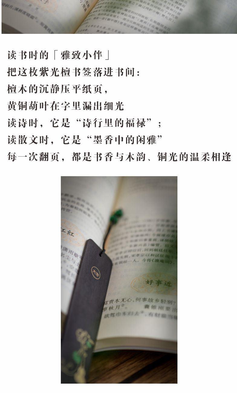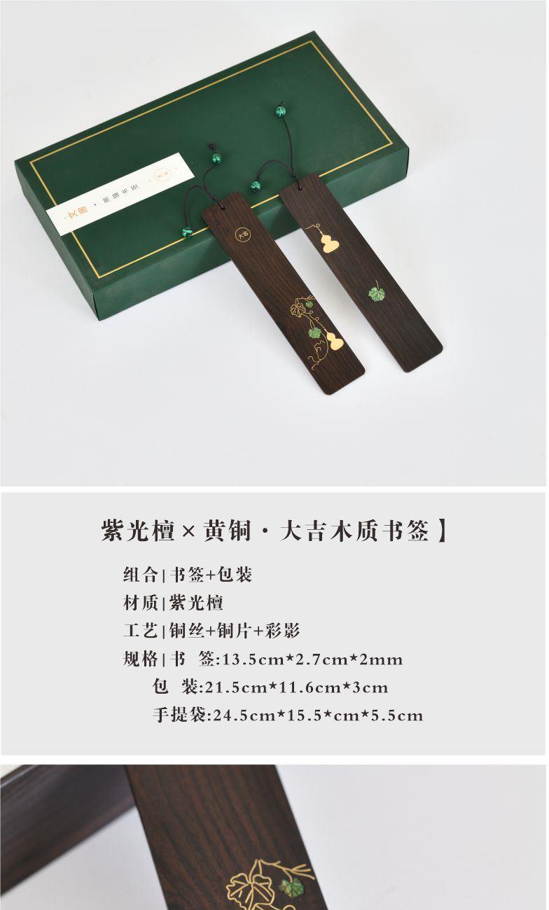 组合|书签+包装 材质|紫光檀 工艺|铜丝+铜片+彩影 规格|书 签:13.5cm*2.7cm*2mm 包 装:21.5cm*11.6cm*3cm 手提袋:24.5cm*15.5*cm*5.5cm