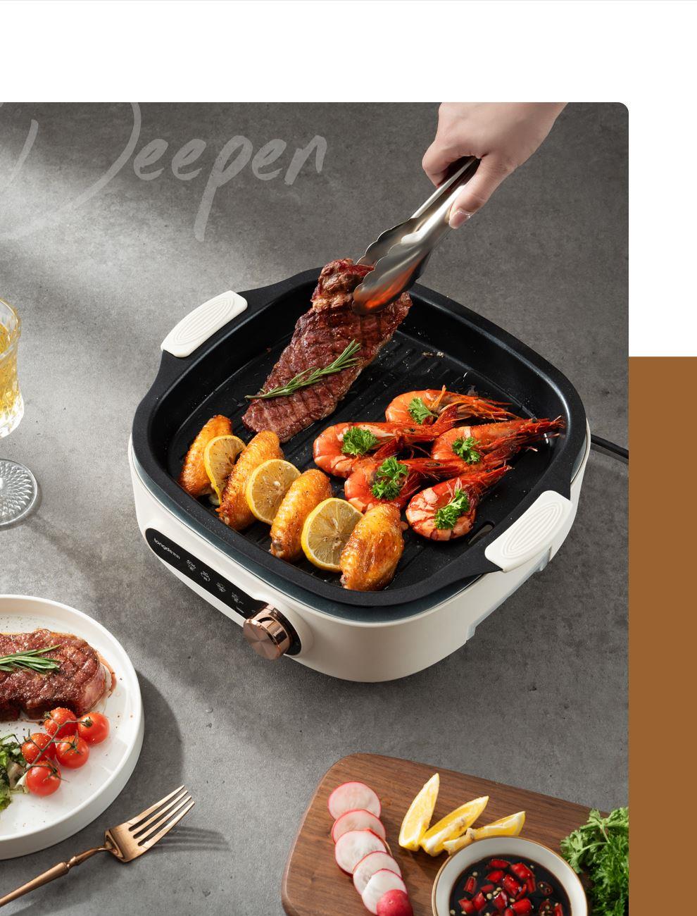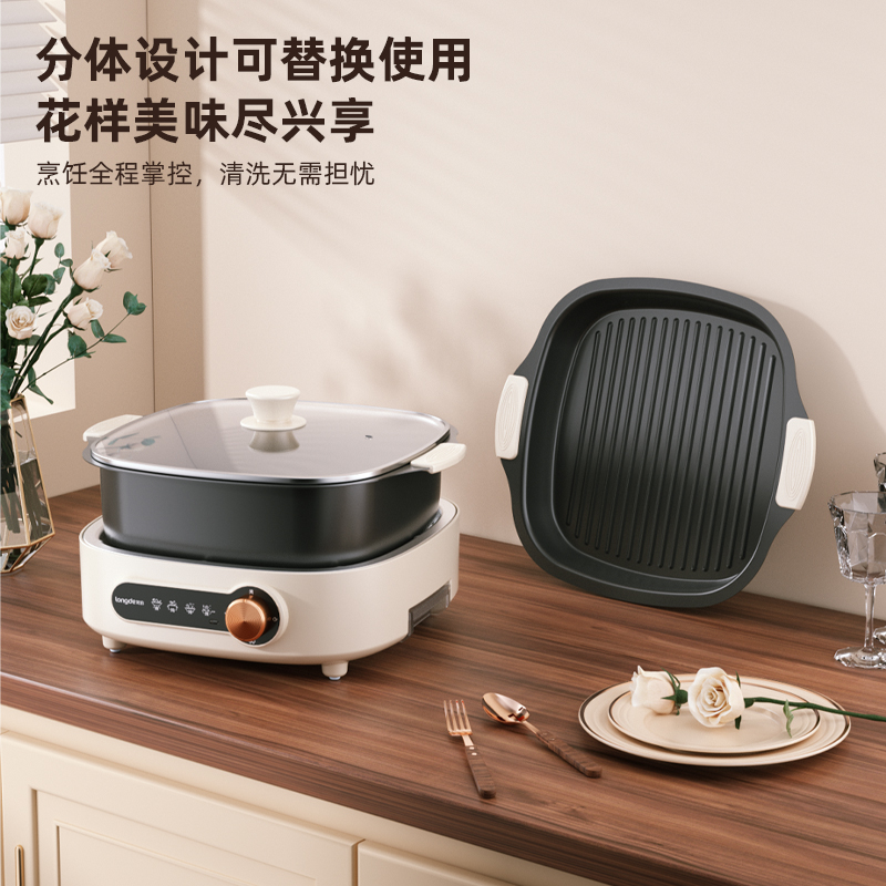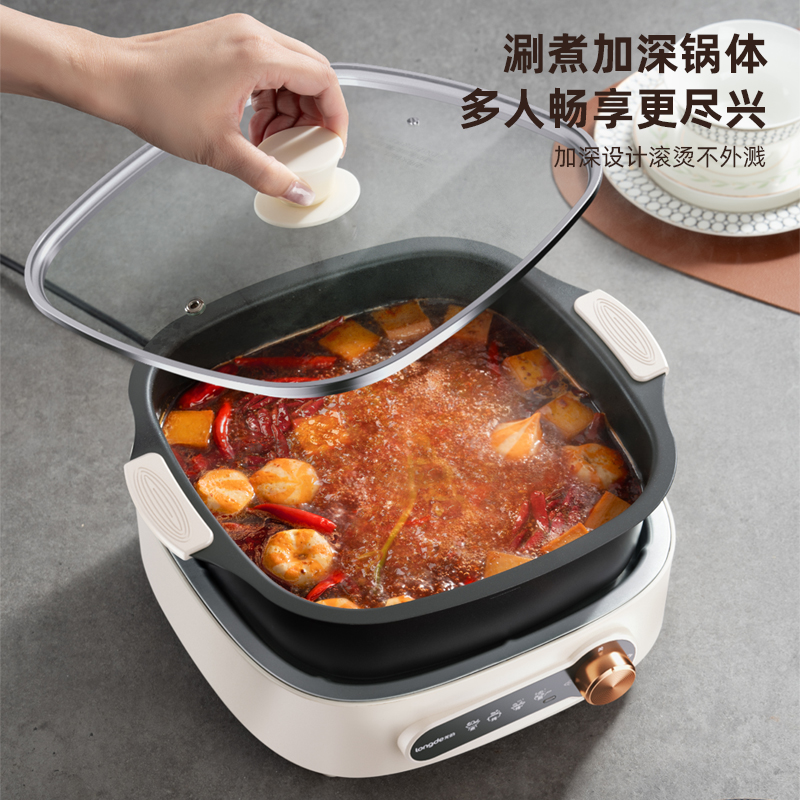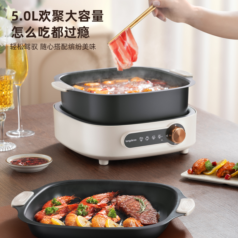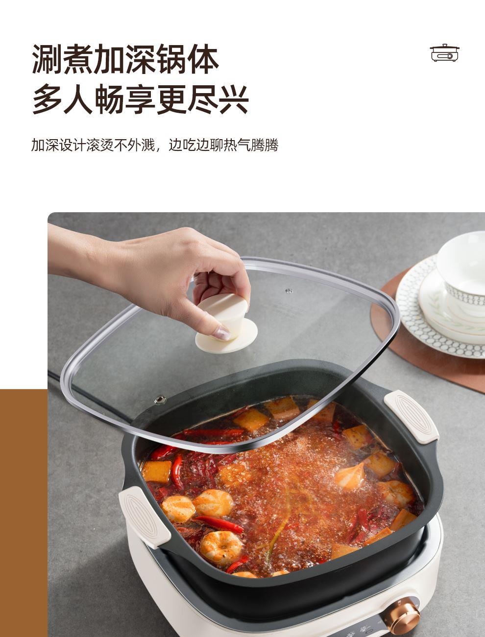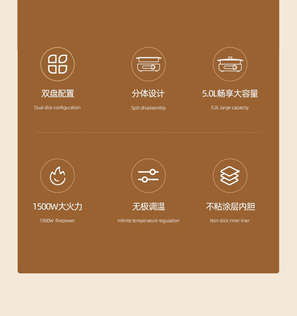 额定功率:1500W 产品容量:5.0L 额定电压:220V~ 产品频率:50Hz 产品净重:3.2kg 产品毛重:3.7kg 整箱重量:15.9kg 火锅盘、煎烤盘自由选择不粘水性涂层火锅盘/煎烤盘,不锈钢发热管导热快 可视烹饪不锈钢包边耐高温玻璃上盖 大功率无极调无极旋钮温控,调和不同需求 多重安全防护优质温控器,干烧保护