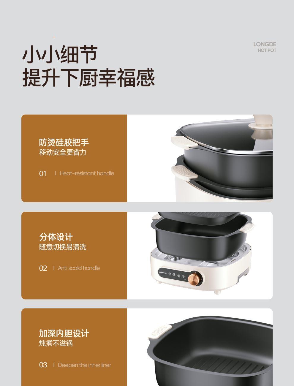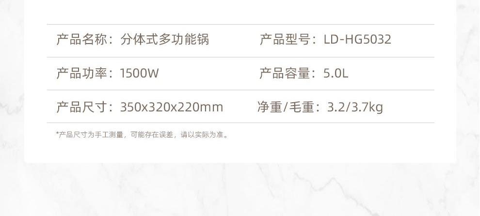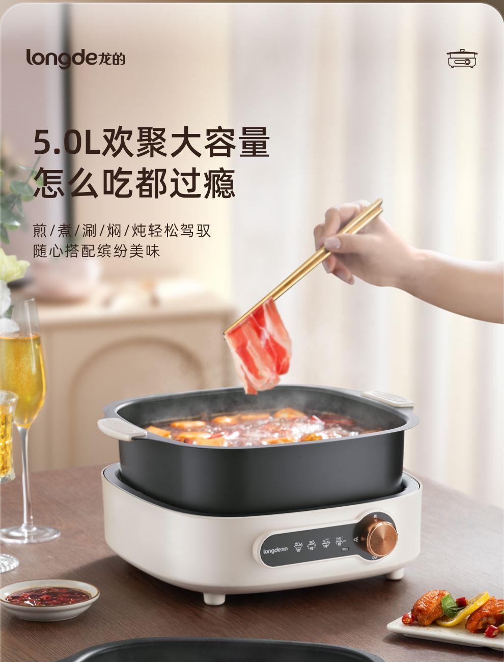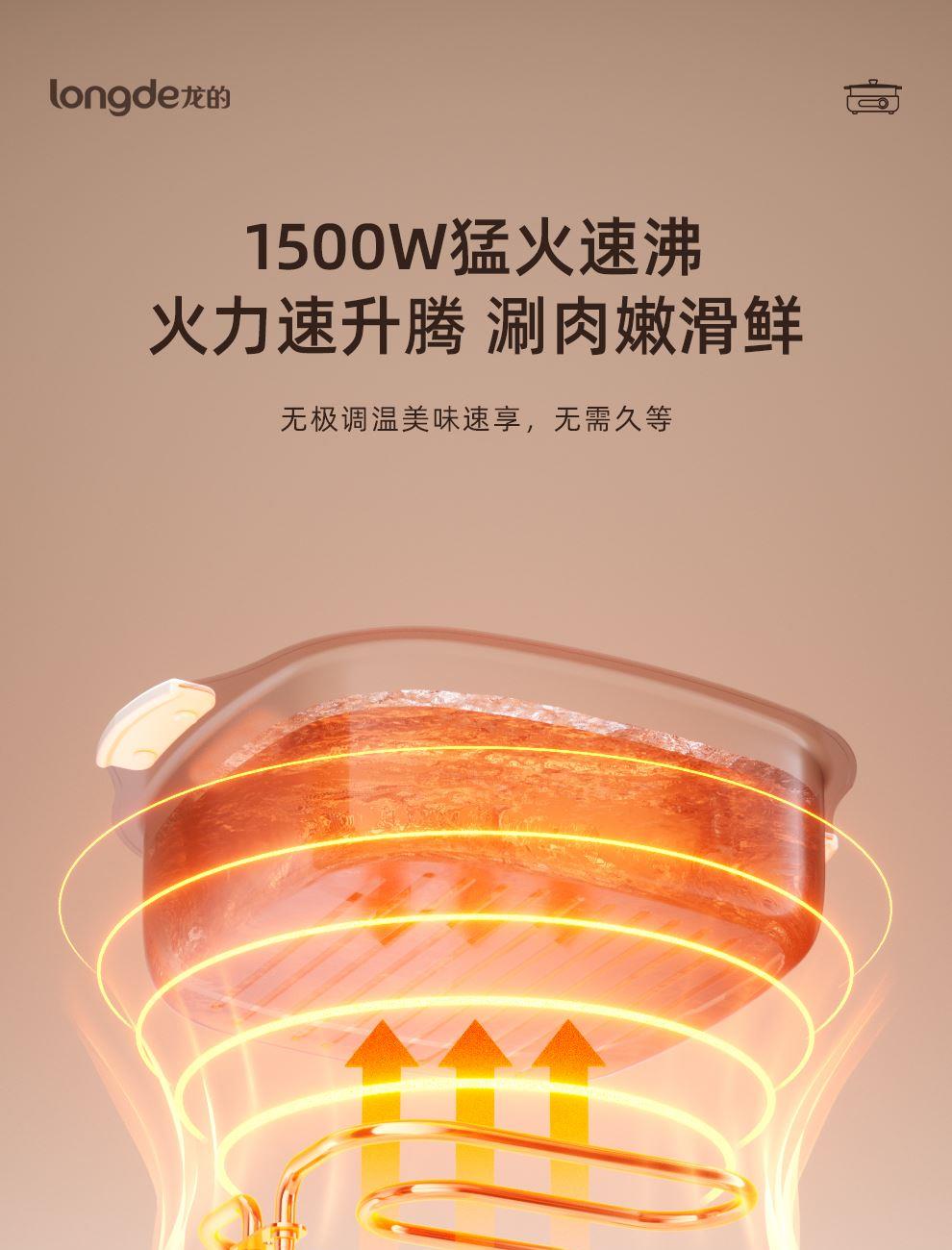 额定功率:1500W 产品容量:5.0L 额定电压:220V~ 产品频率:50Hz 产品净重:3.2kg 产品毛重:3.7kg 整箱重量:15.9kg 火锅盘、煎烤盘自由选择不粘水性涂层火锅盘/煎烤盘,不锈钢发热管导热快 可视烹饪不锈钢包边耐高温玻璃上盖 大功率无极调无极旋钮温控,调和不同需求 多重安全防护优质温控器,干烧保护