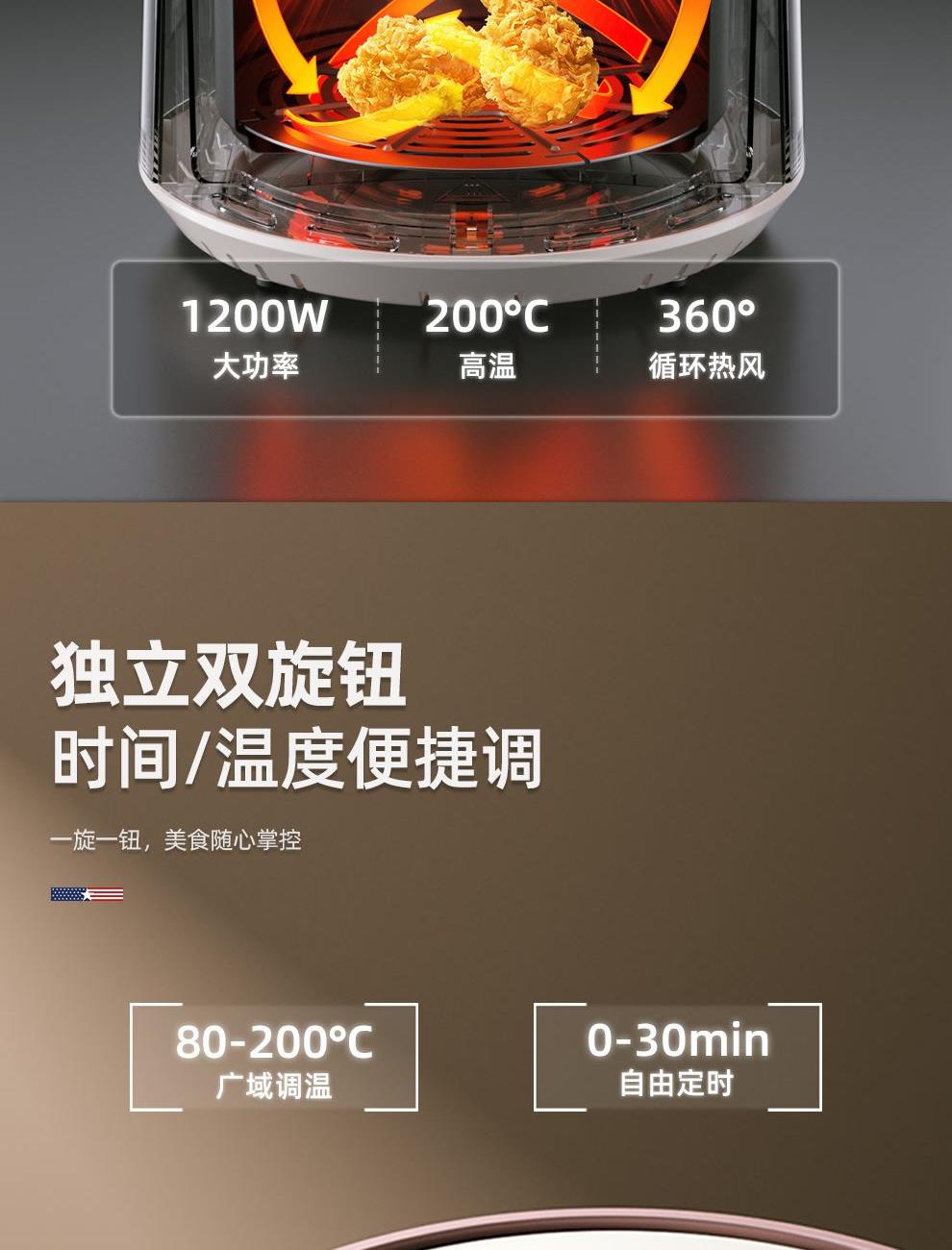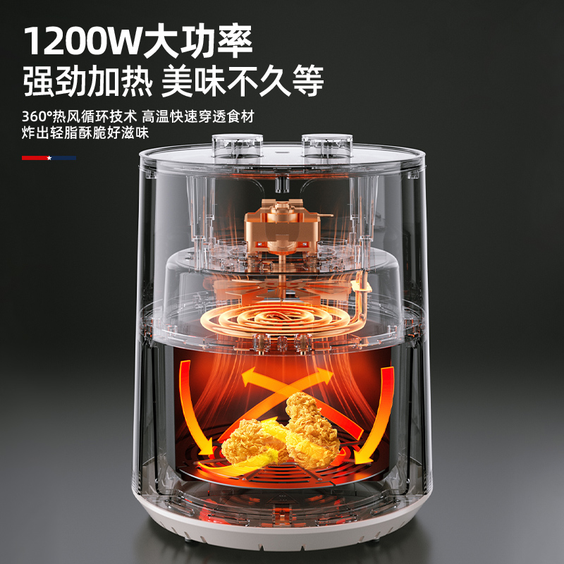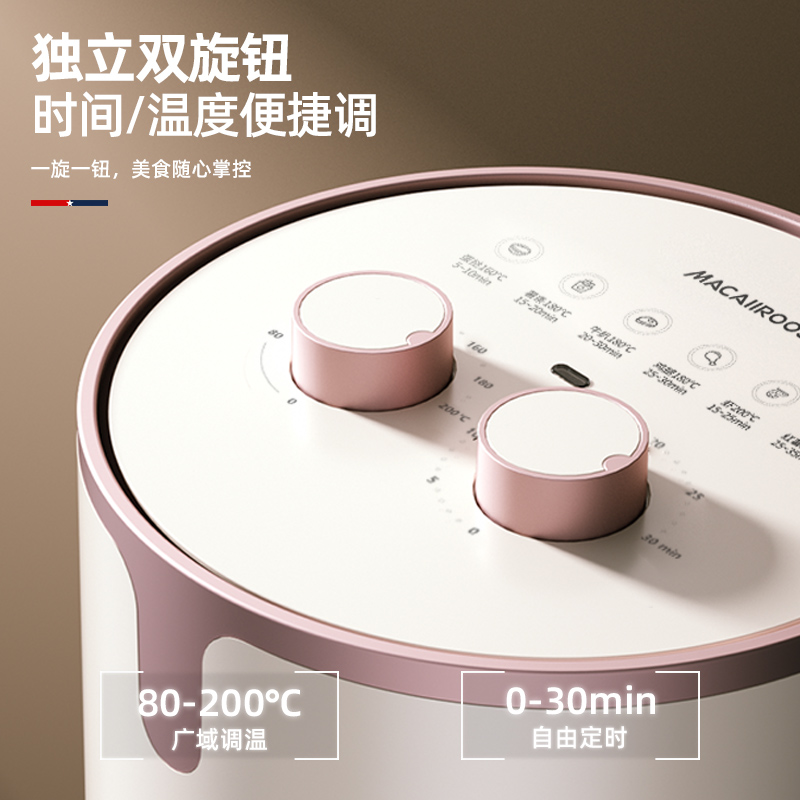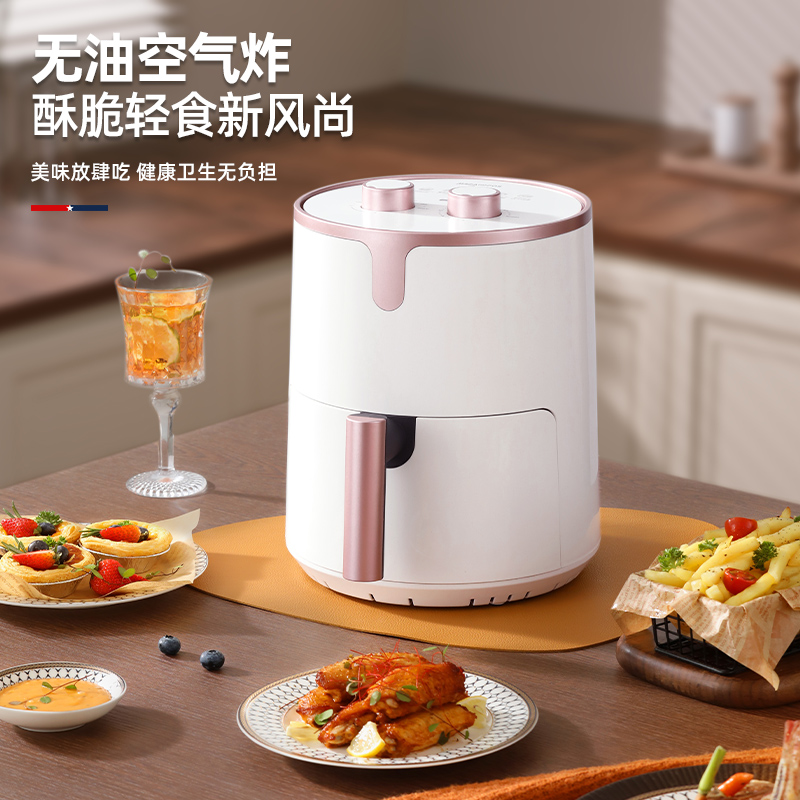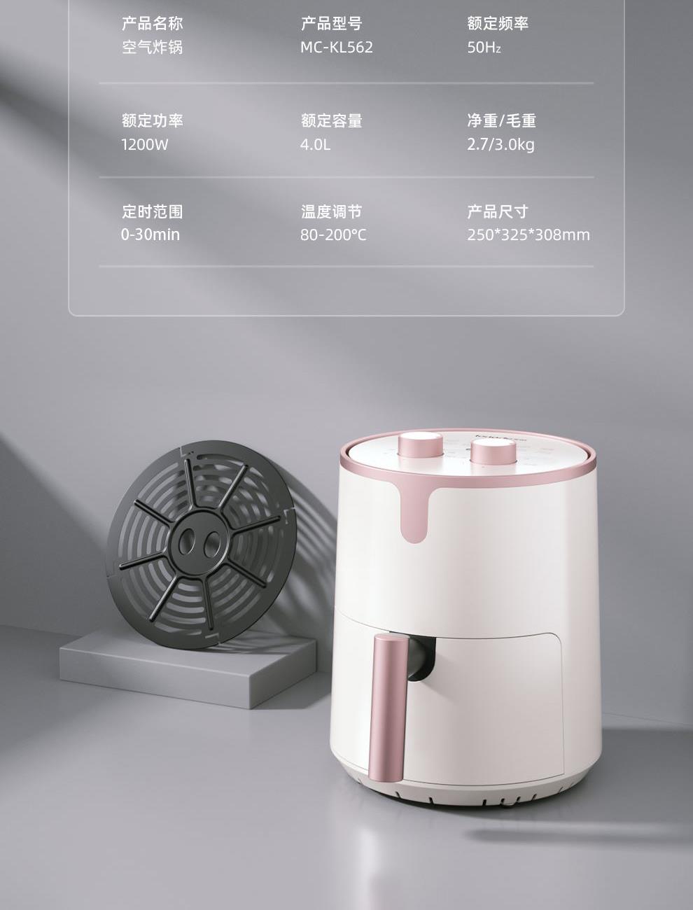 额定功率:1200W 额定容量:4.0L 额定电压:220V~ 额定频率:50Hz 产品净重:2.7kg 产品毛重:3.0kg 整箱重量:13.1kg 高颜值外观法式白色机身,搭配玫瑰金把手,为下厨营造出浪漫雅致的氛围感; 4L轻巧容量满足一家三口美食需求,份量刚好不浪费; 双旋钮调节0-30min定时、80-200°调温,360度热风循环,烘烤均匀; 产品配置不粘炸锅、分体烤架,提篮断电,使用安全放心。