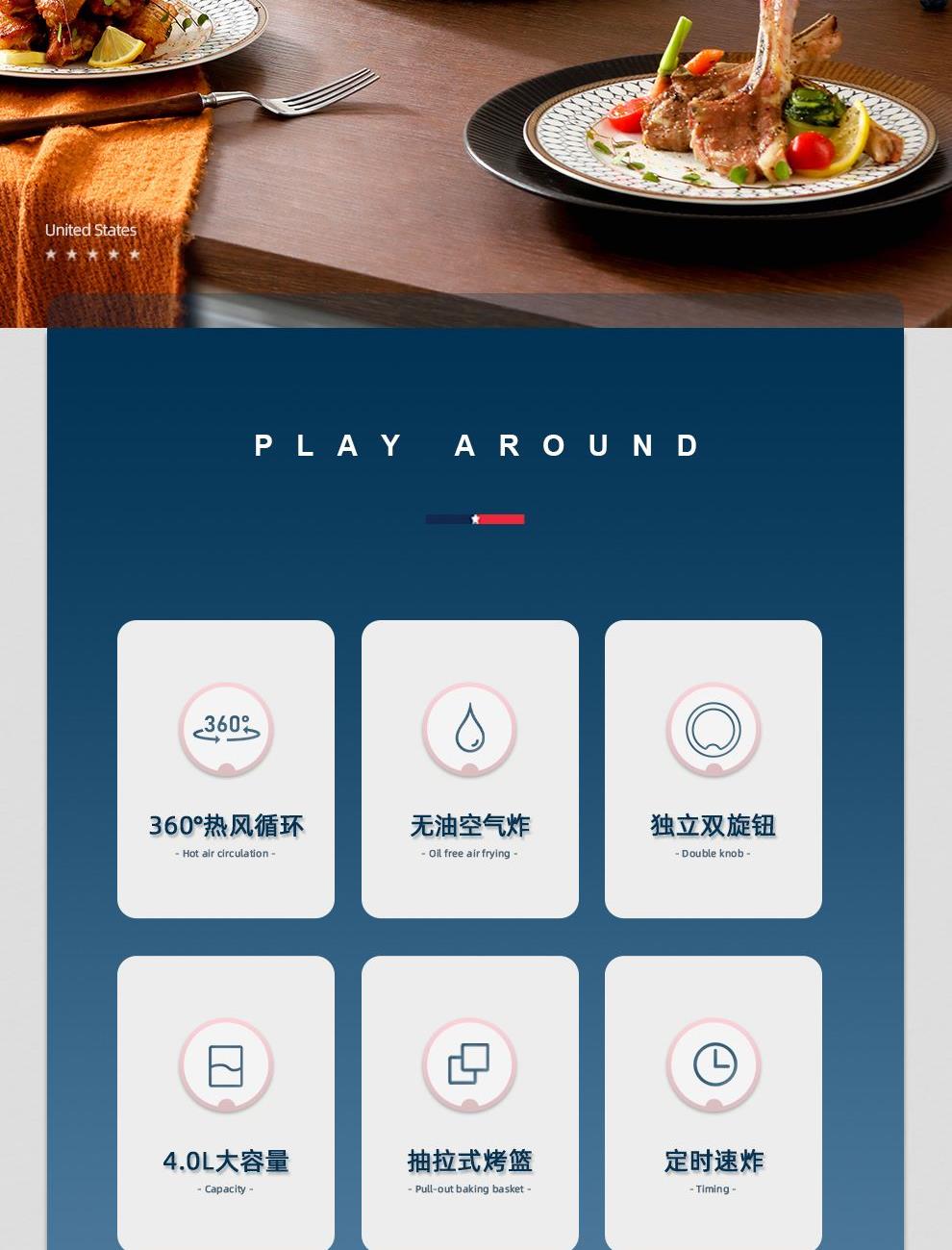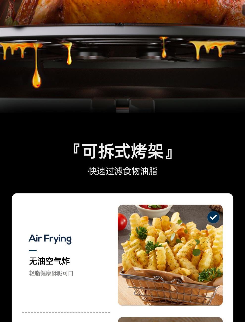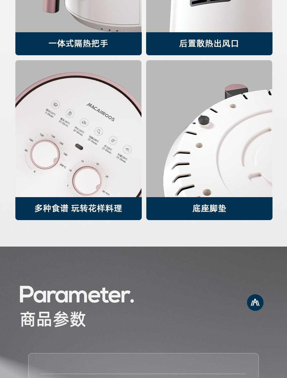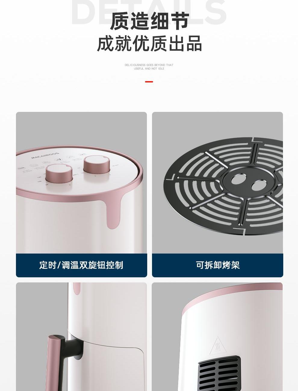 额定功率:1200W 额定容量:4.0L 额定电压:220V~ 额定频率:50Hz 产品净重:2.7kg 产品毛重:3.0kg 整箱重量:13.1kg 高颜值外观法式白色机身,搭配玫瑰金把手,为下厨营造出浪漫雅致的氛围感; 4L轻巧容量满足一家三口美食需求,份量刚好不浪费; 双旋钮调节0-30min定时、80-200°调温,360度热风循环,烘烤均匀; 产品配置不粘炸锅、分体烤架,提篮断电,使用安全放心。