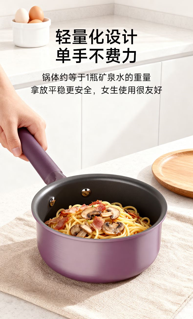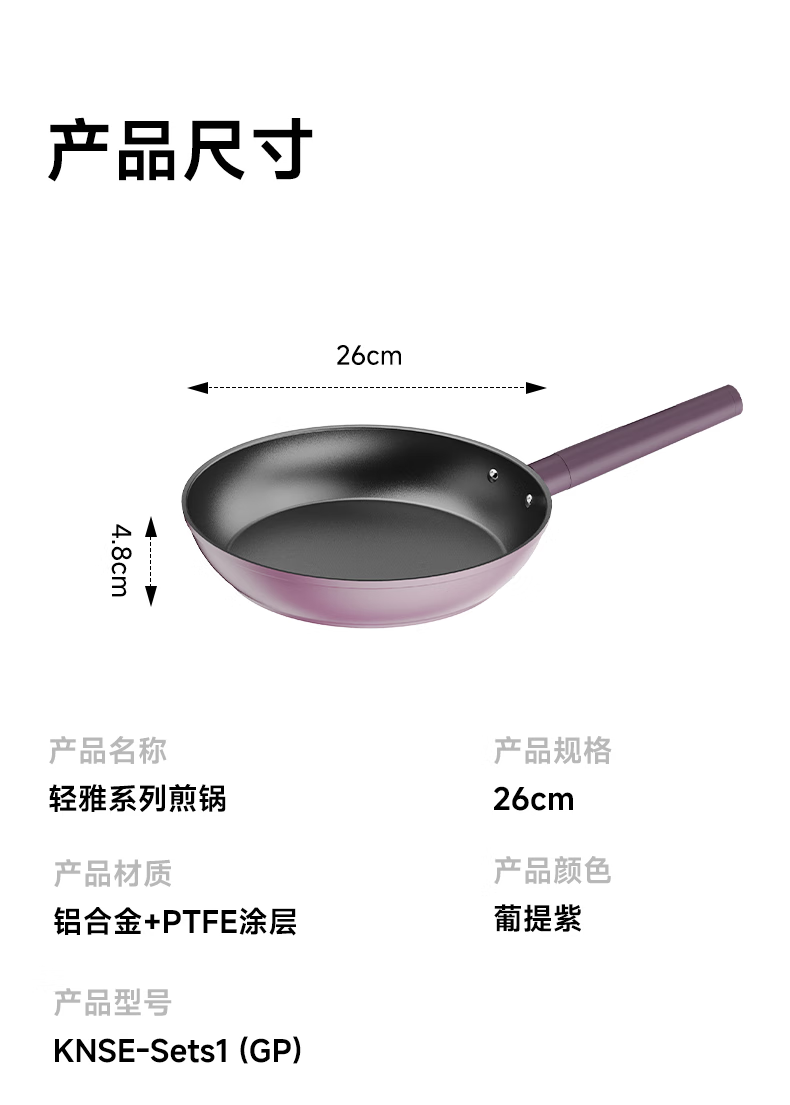 型 号:KNSE-Sets1 (GP) 规 格: 煎盘26cm、内高5cm 奶锅16cm、内高7.5cm 容 量: 奶锅1.5L 功能卖点: 1、加厚铝合金基材,抗刮耐磨不易变形 2、进口不粘涂层,不含PFOA,轻油少烟,强力不粘 3、底厚壁薄,受热均匀,不易糊锅 4、易洁材质,一抹即净,省心省力 5、通底复底片,耐脏耐烧,适用各种灶具