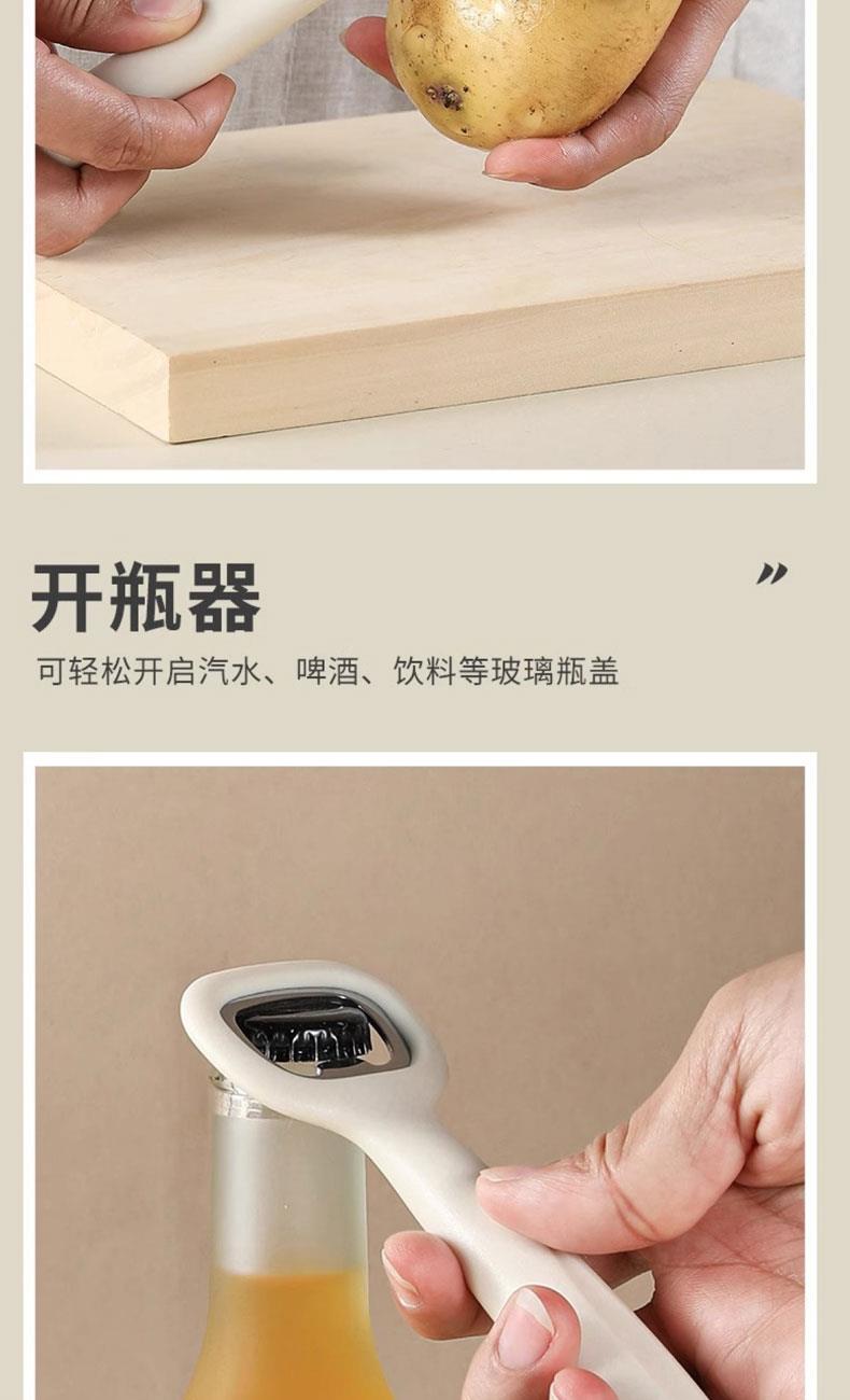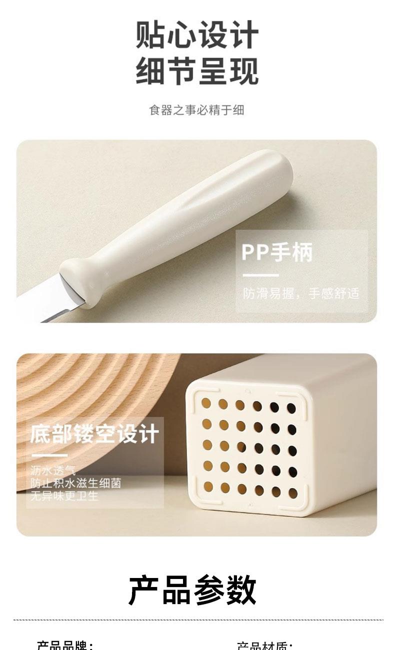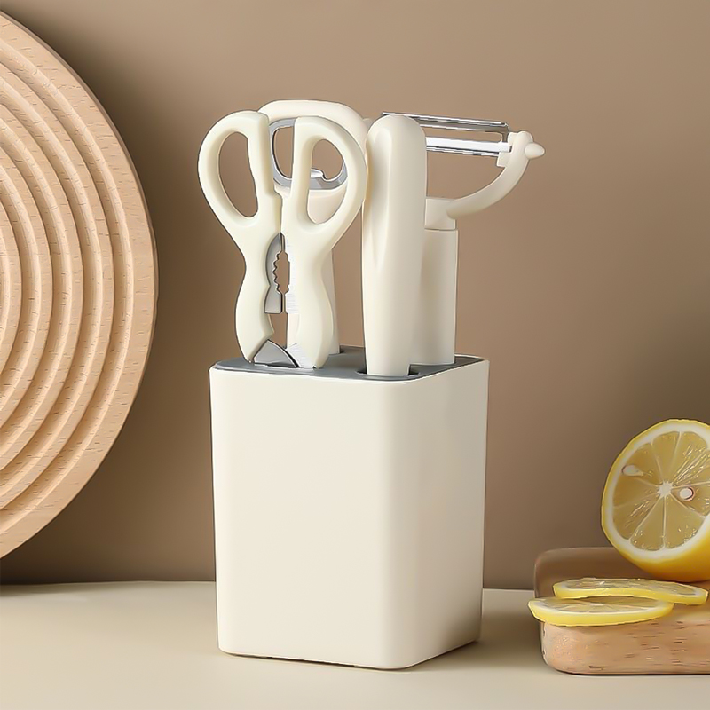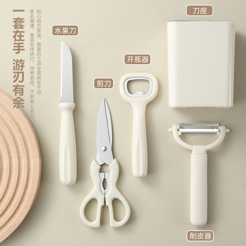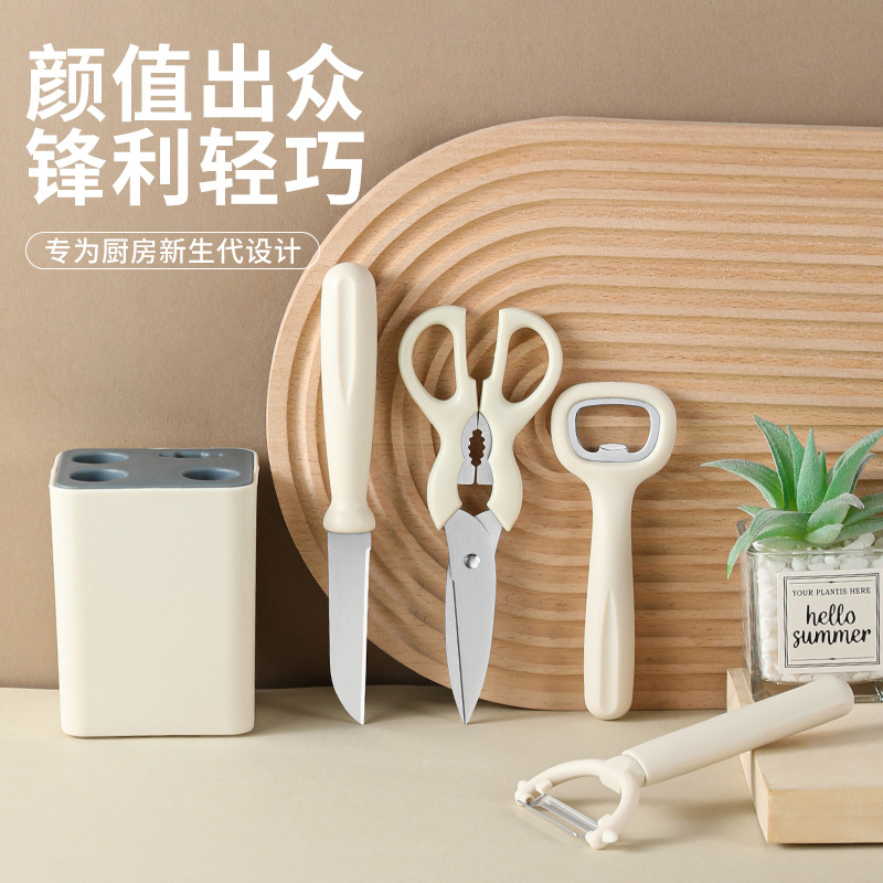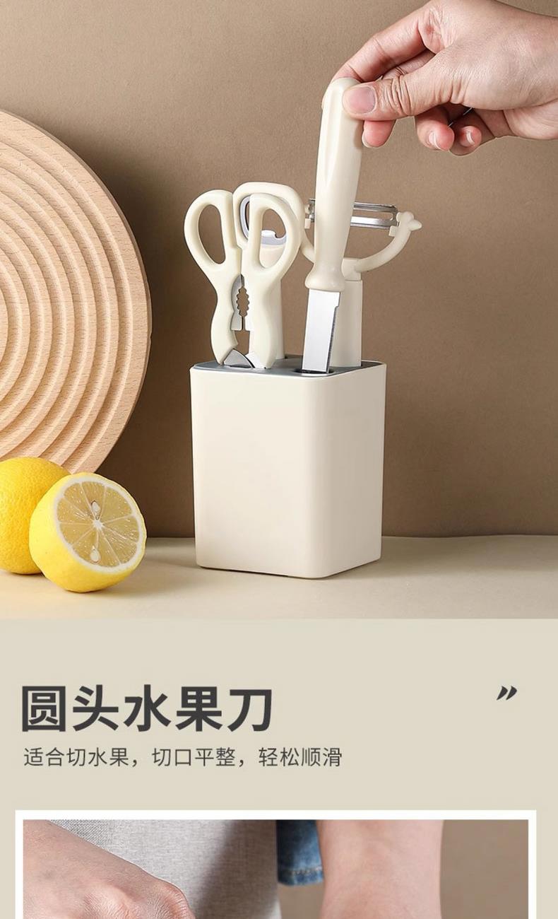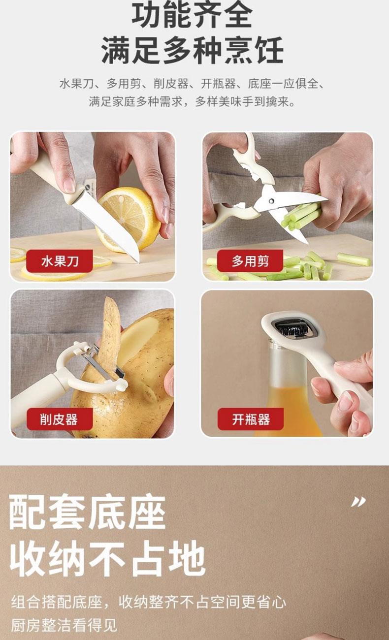 产品型号:Z-CF501A 产品材质:PP+J不锈钢 产品配置:剪刀,刀,菜刨,开瓶器,刀座 产品颜色:白色 包装尺寸:90*80*195mm 包装方式:彩盒 单套重量:0.26KG 整箱重量:18KG 产品条码:6953300072045