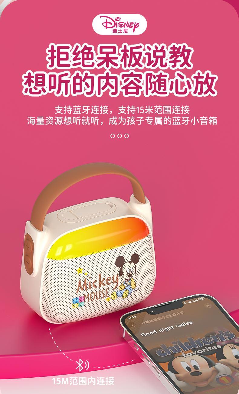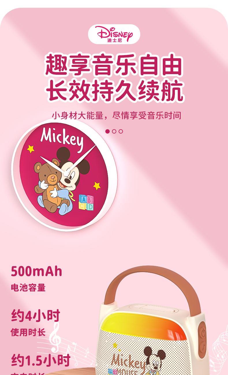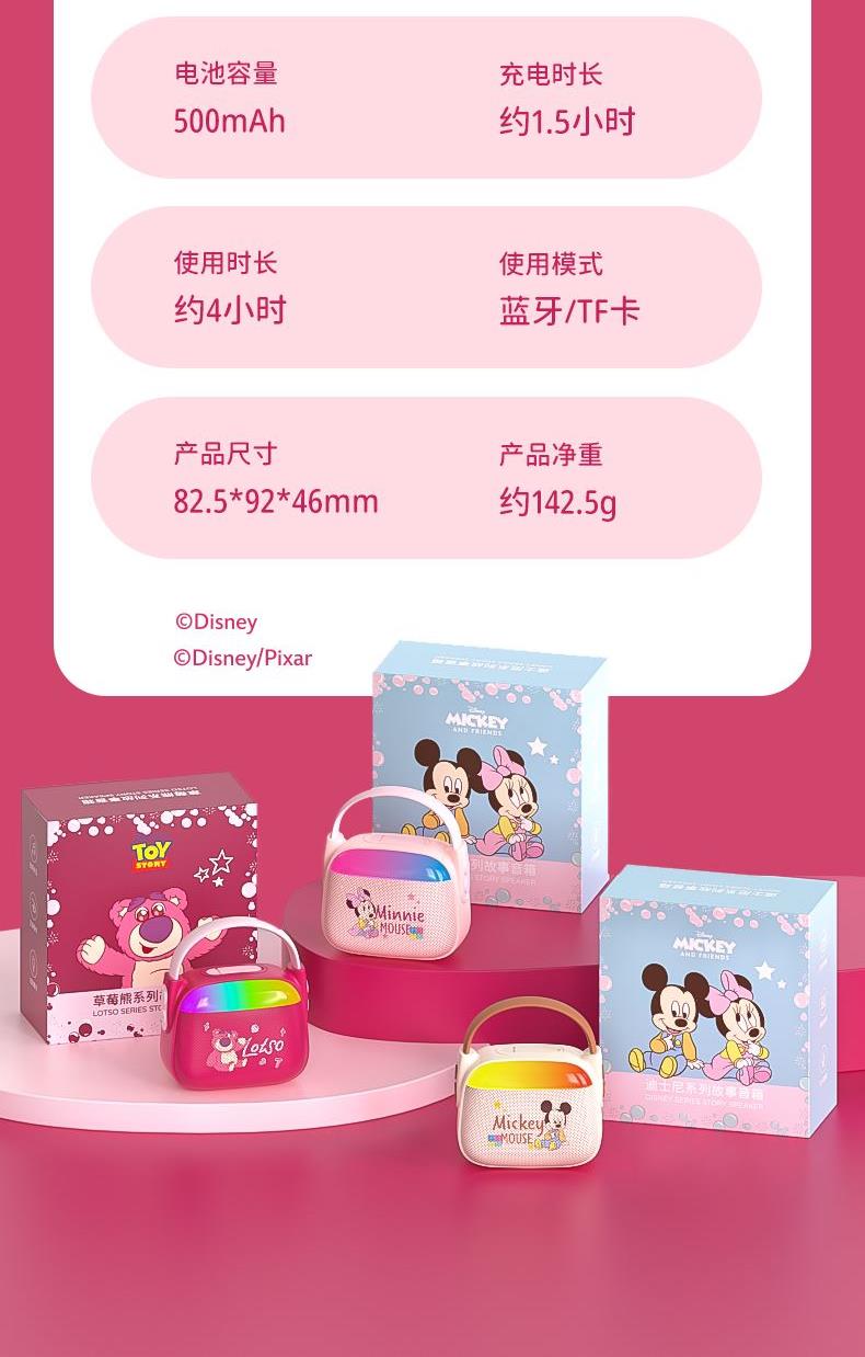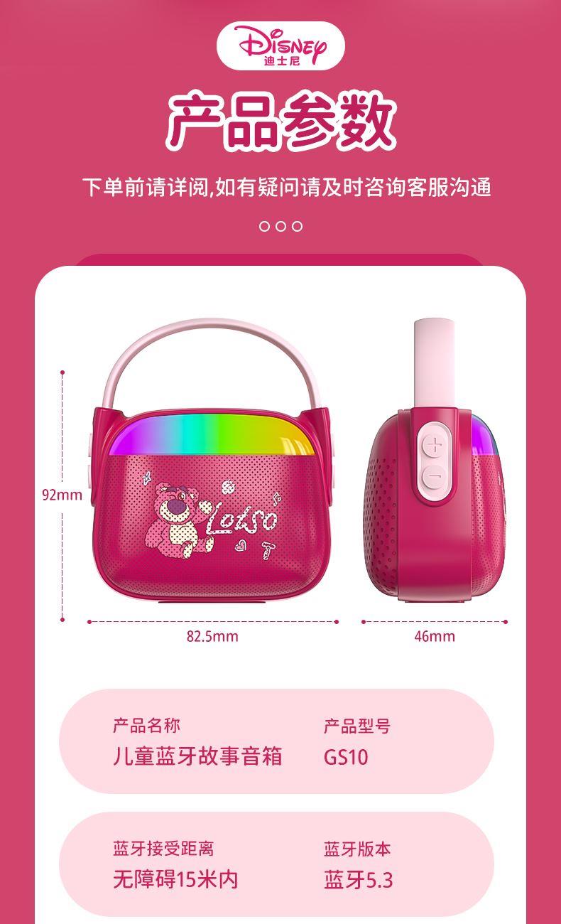 蓝牙版本 : V5.3 蓝牙:DISNEY GS10 喇叭直径 : 40mm 传输频率 : 60HZ-120Hz 喇叭功率 : 3W 充电电压 : 5V=1A 电池规格 : 3.7V/500mAh 充电时长 : 约1.5小时 使用时长 : 约4小时 蓝牙接收距离 <15m