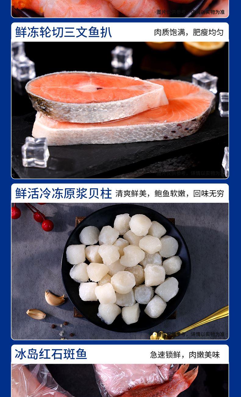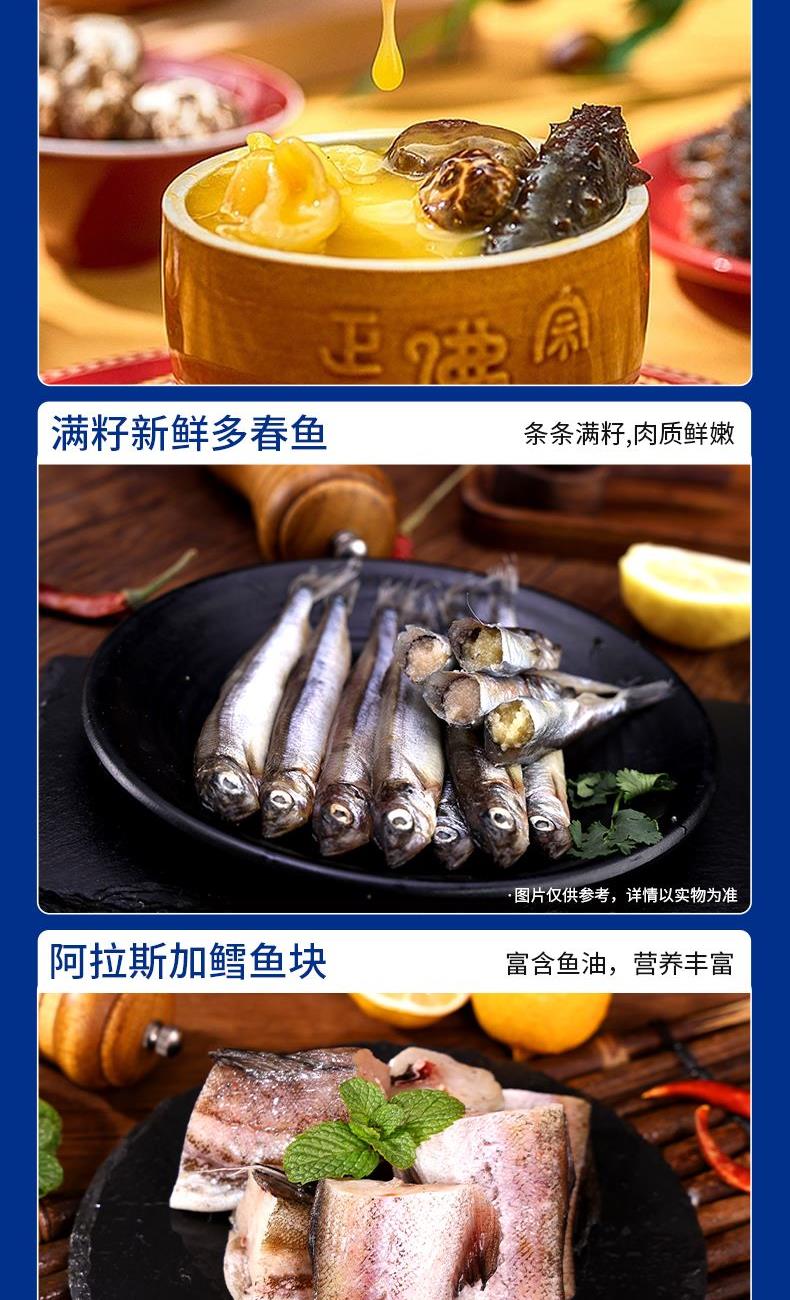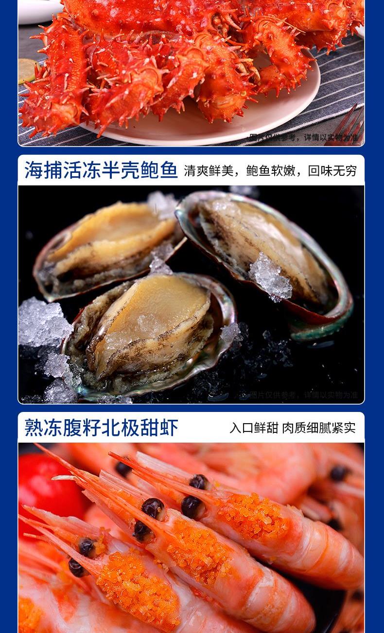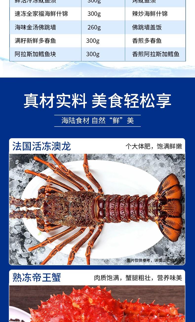 法国活冻澳龙350g-400g 智利熟冻帝王蟹800g-1000g 海捕活冻半壳鲍鱼400g 腹籽北极甜虾300g 智利鲜冻轮切三文鱼扒300g 鲜活冷冻原浆贝柱300g 冰岛红石斑鱼500g 冷冻舟山小眼带鱼段500g 鲜冻无保水白虾仁200g 鲜活冷冻鱿鱼须300g 速冻全家福海鲜什锦300g 海味金汤佛跳墙260g 满籽新鲜多春鱼300g 阿拉斯加鳕鱼块300g