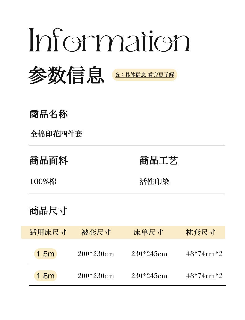 被套:200×230cm 床单:230×250cm 枕套:48×74cm 适用:1.5M-1.8M床 印染工艺:环保印花 包装:手提礼盒 甄选全棉面料,纯净无刺激,柔软亲肤,AB版设计,舒适透气,不易起球。