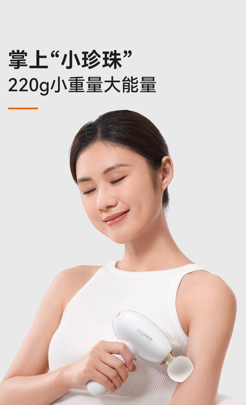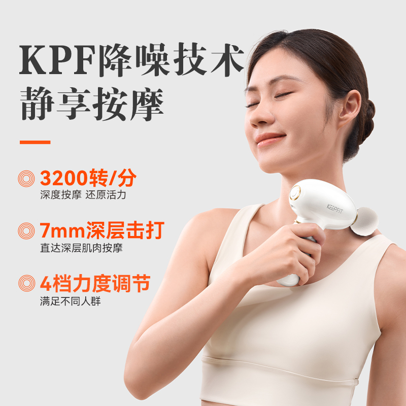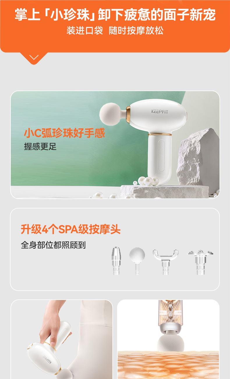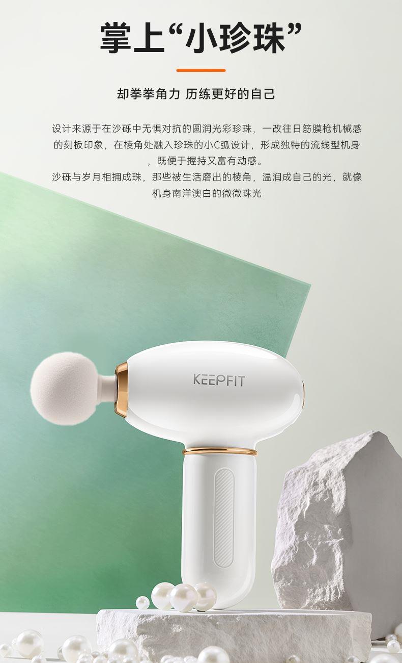 【颜值】珍珠造型、轻巧超便携 【降噪】科普菲降噪技术,轻声运行,静享舒式 【力度】打击力度达8KG,力量强劲超给力 【深度】按摩深度7MM,直达深层肌肉按摩 【智感】智能变频加力,懂你需求的筋膜枪